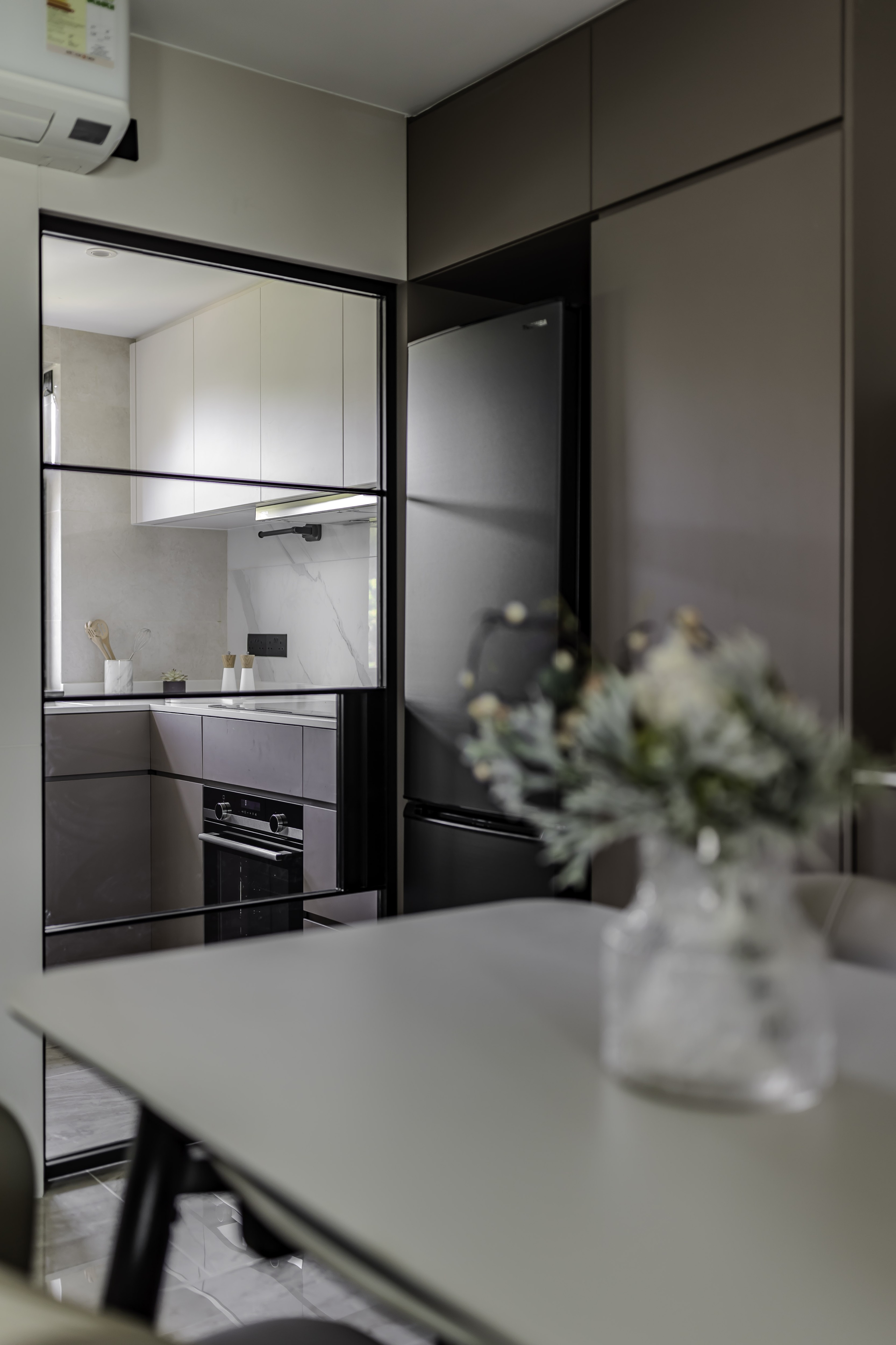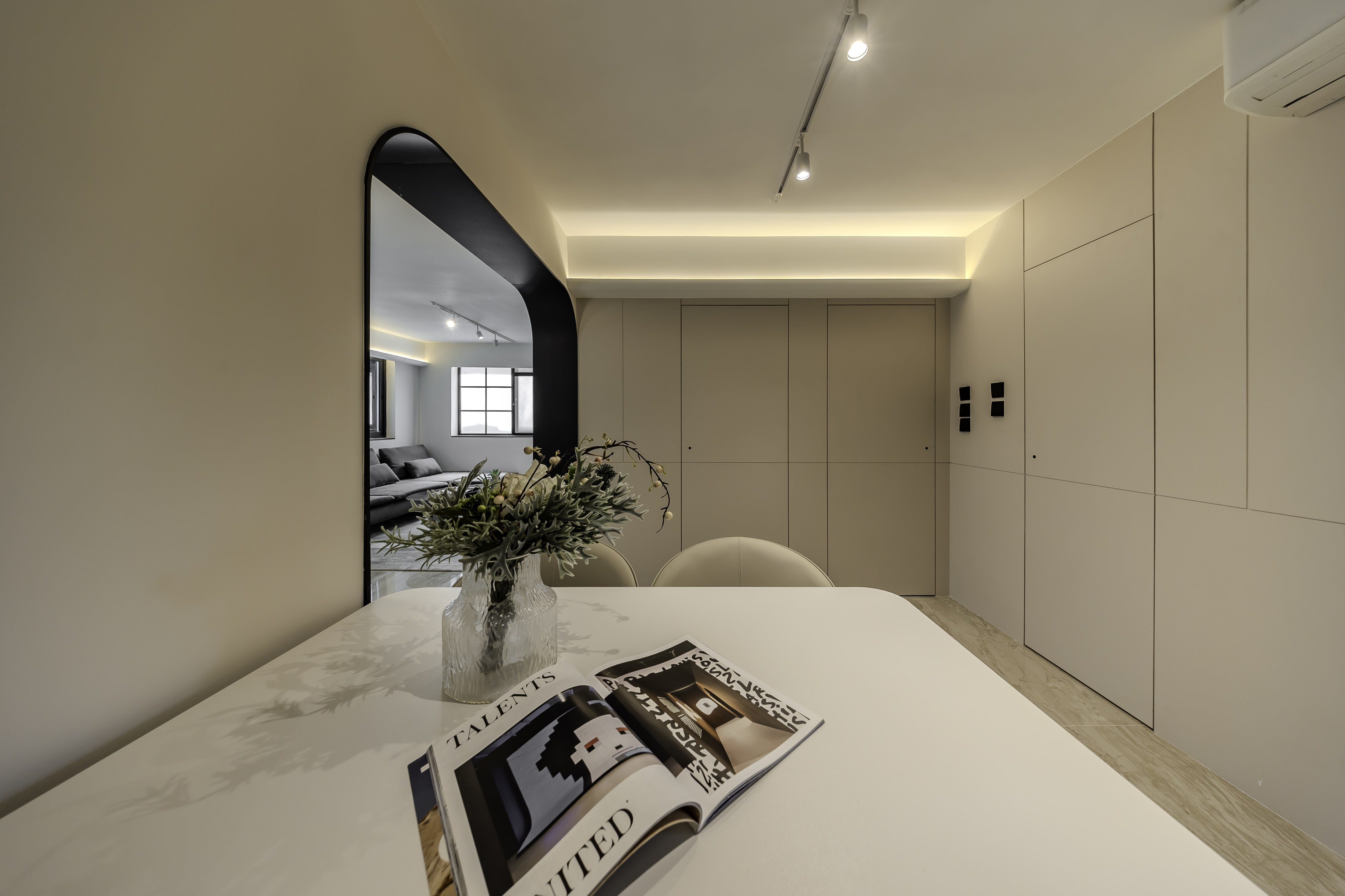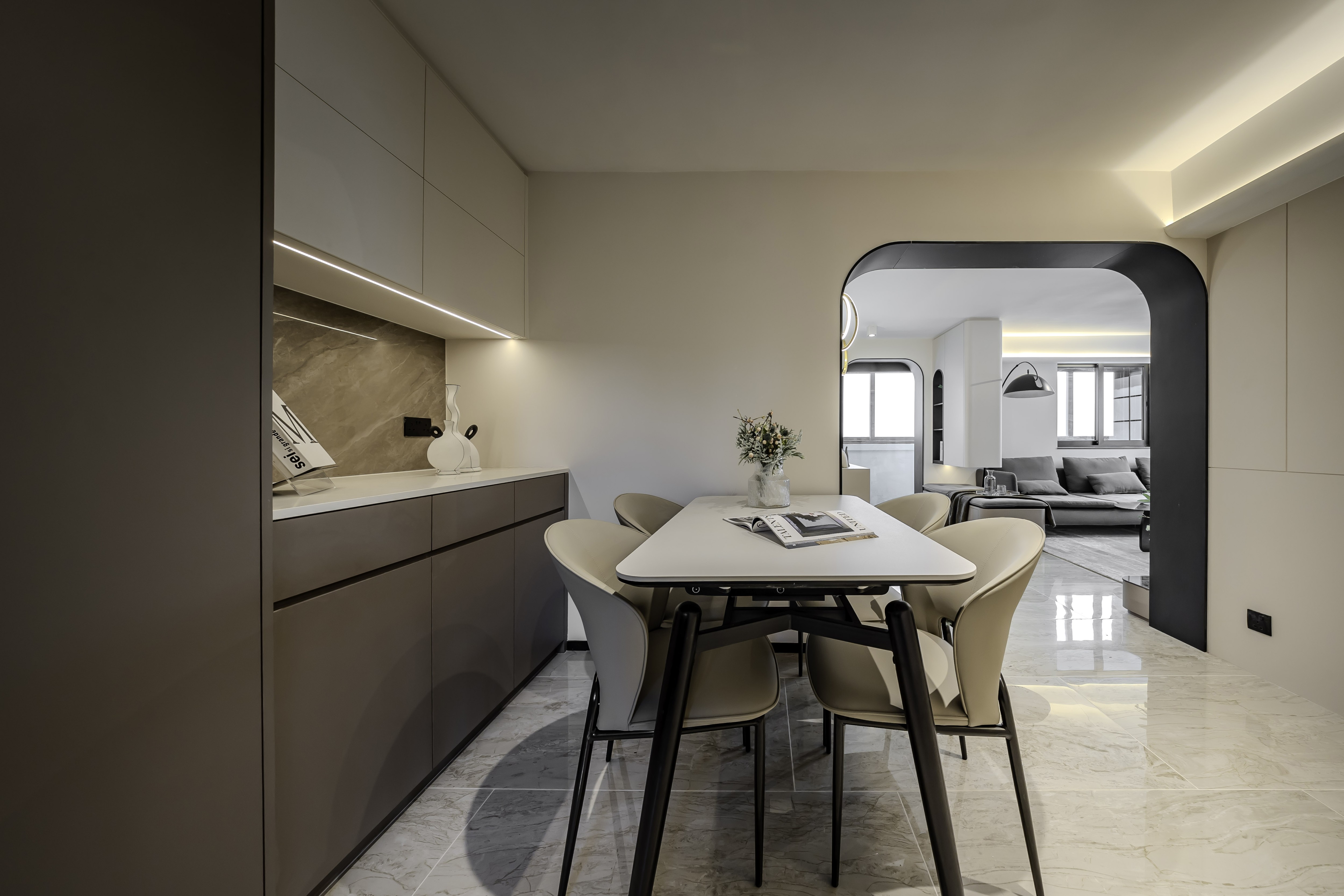 🔸 The dining area is gently defined by a black rounded archway. A full-panel glass sliding door separates it from the kitchen, which can be opened or closed at will, creating a versatile semi-open kitchen layout. The kitchen cabinets, sideboard, and sliding door were all custom-made by us, ensuring unified lines and a clean, sleek finish.