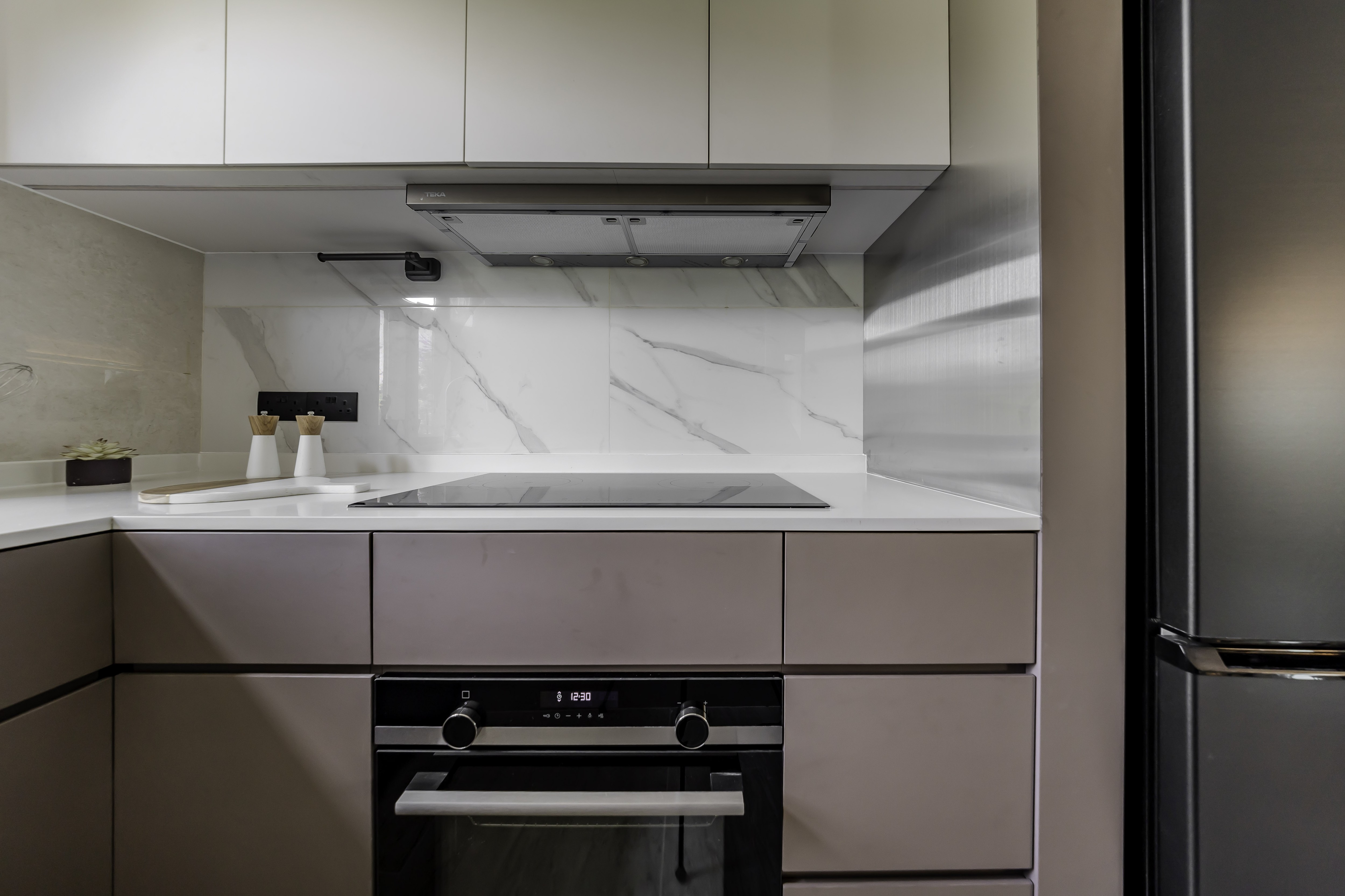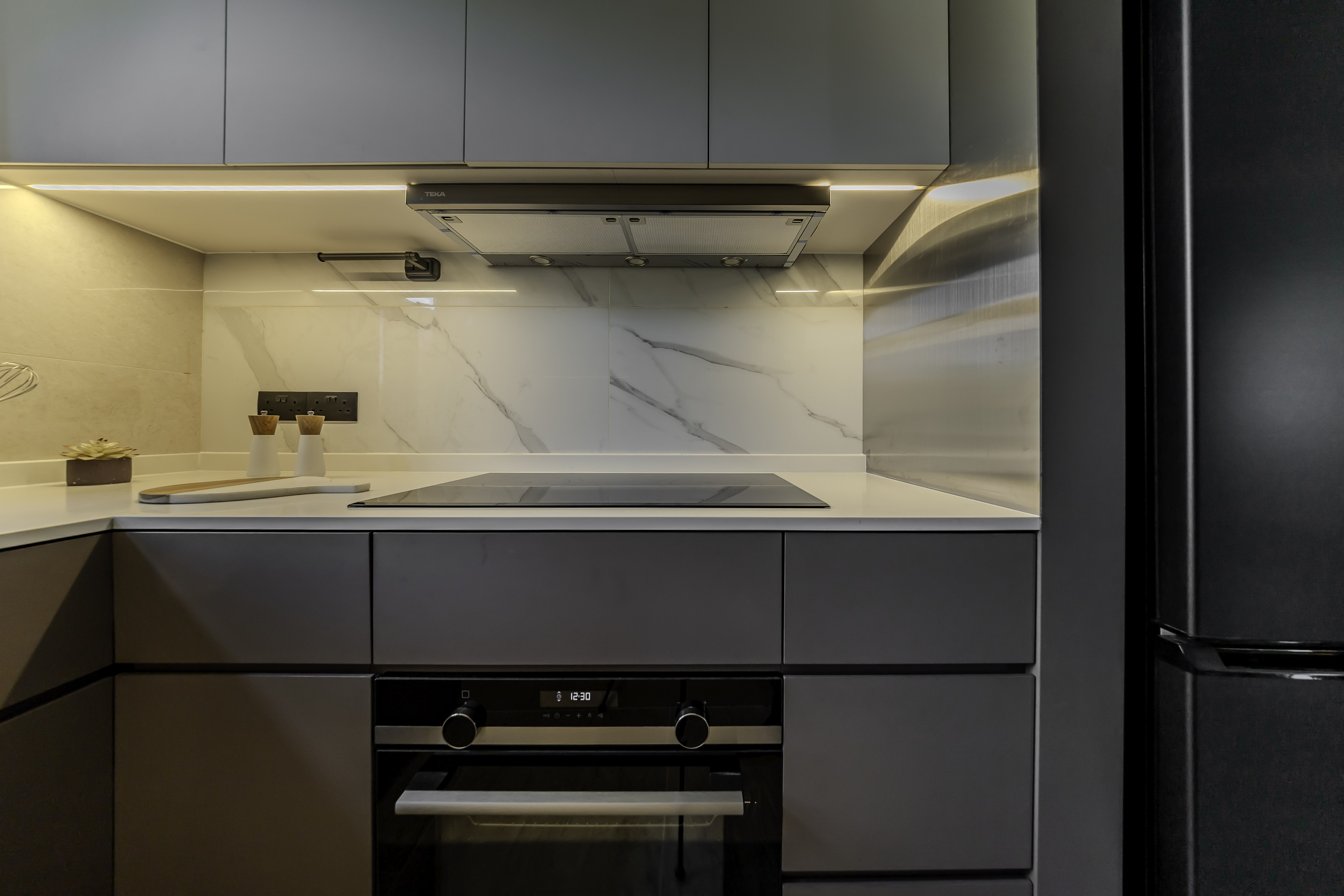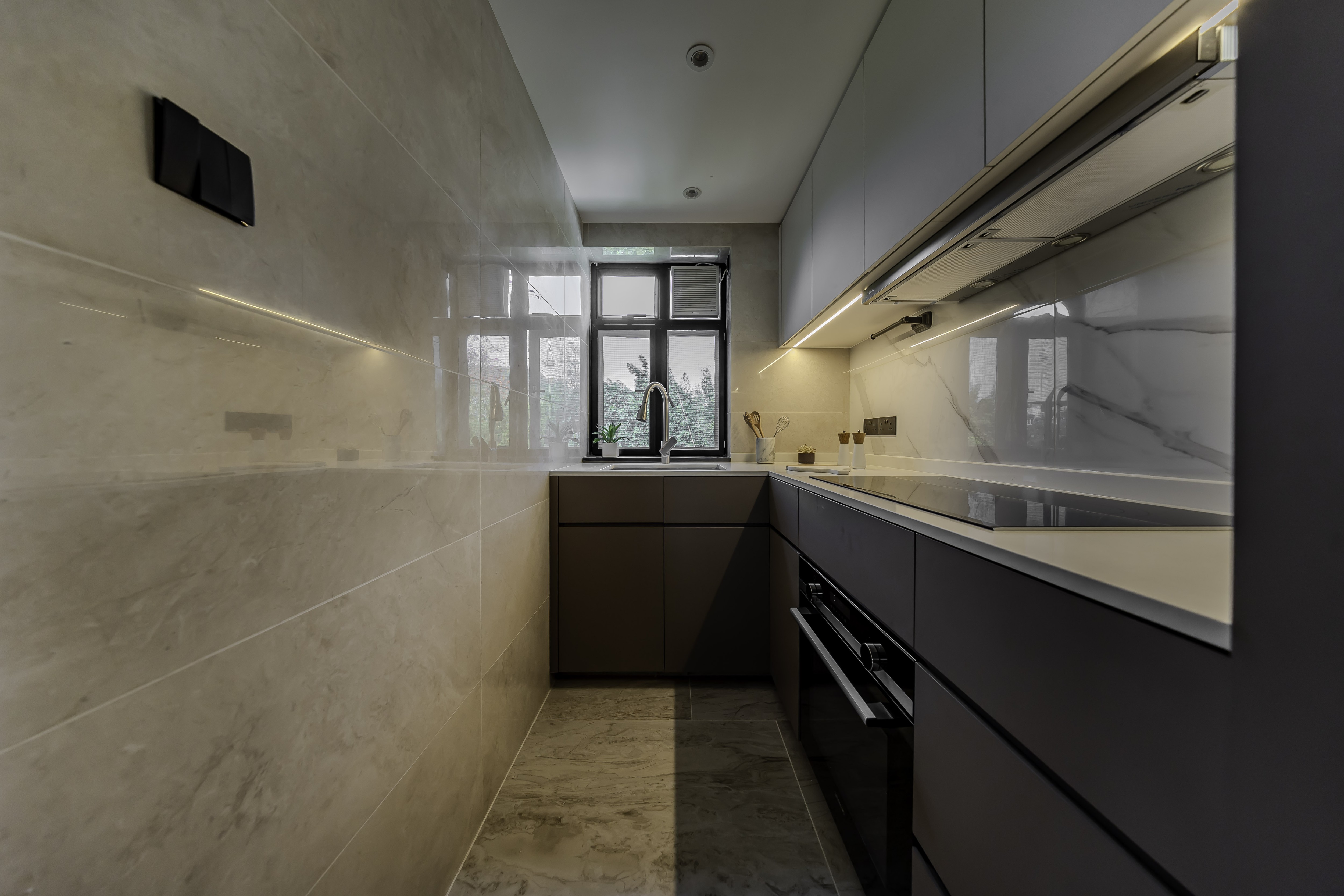 🔸 The dining area is gently defined by a black rounded archway. A full-panel glass sliding door separates it from the kitchen, which can be opened or closed at will, creating a versatile semi-open kitchen layout. The kitchen cabinets, sideboard, and sliding door were all custom-made by us, ensuring unified lines and a clean, sleek finish.