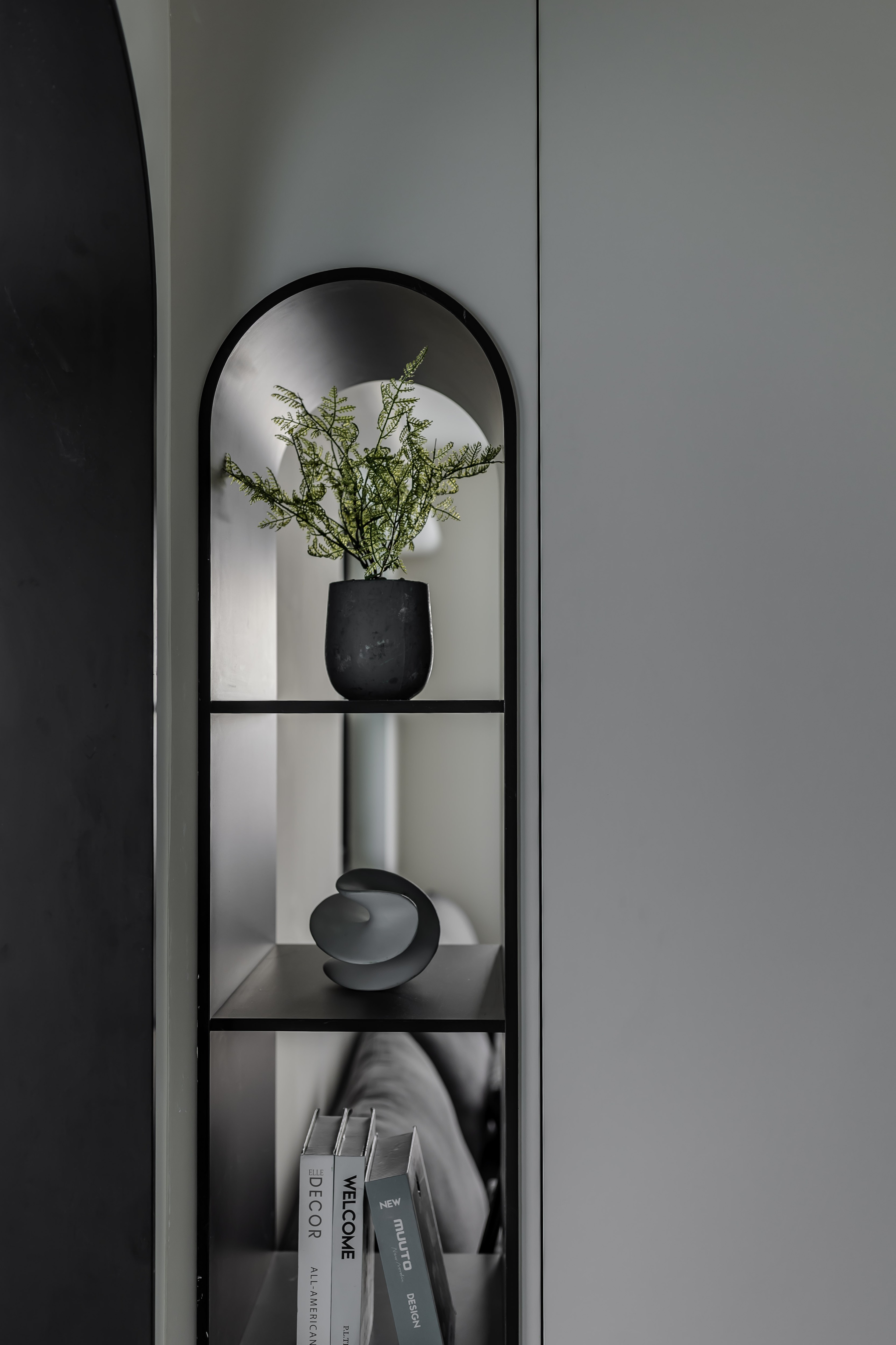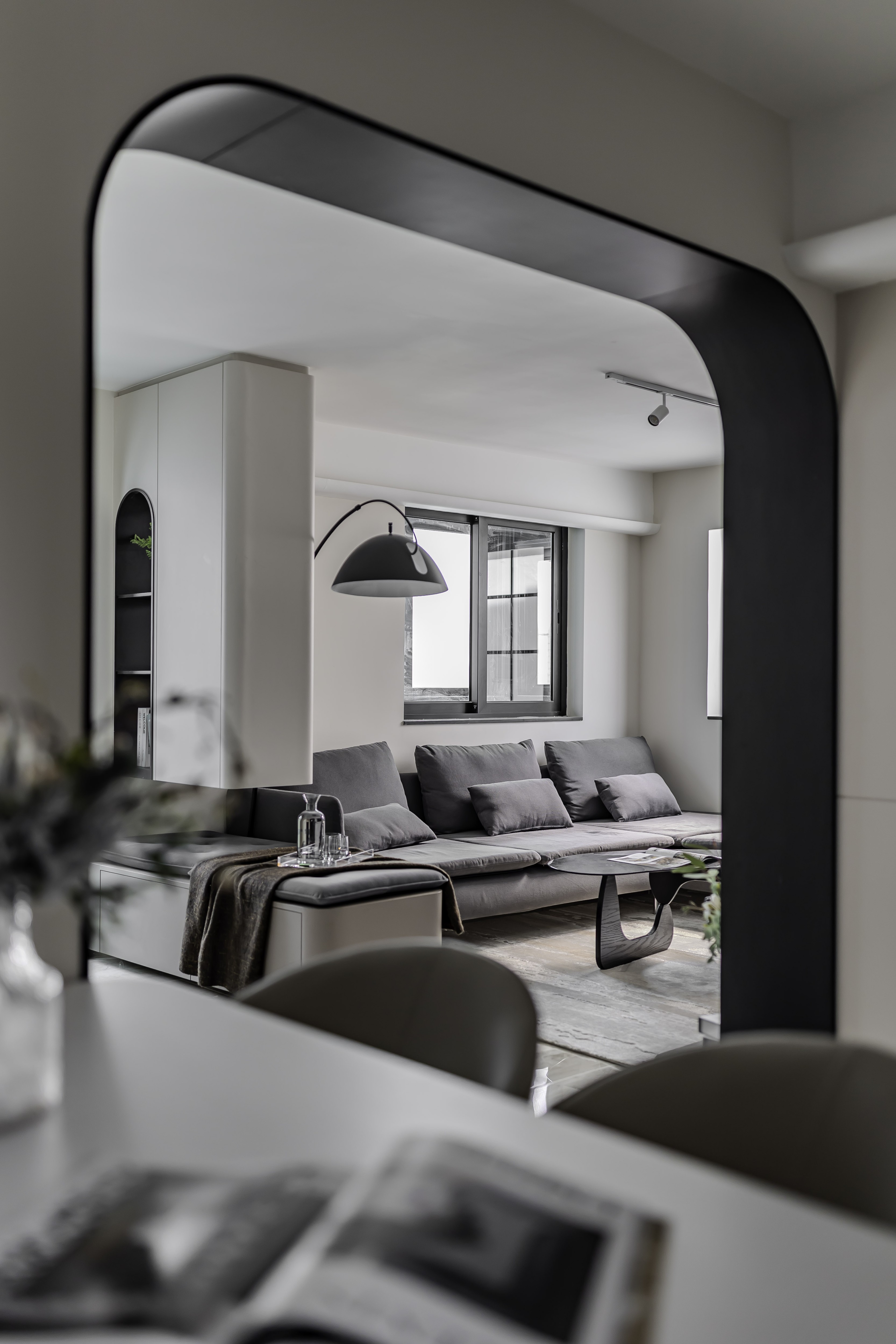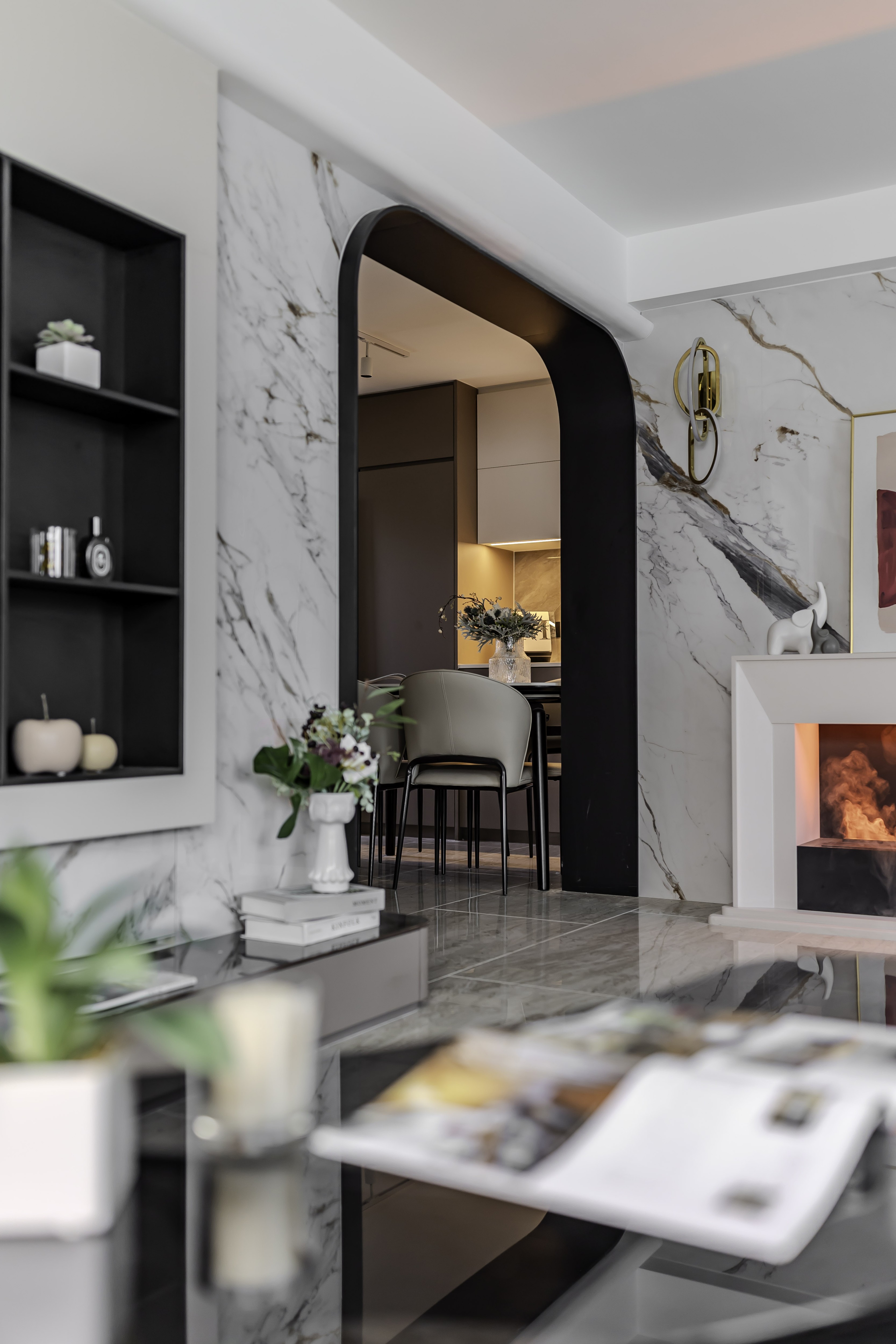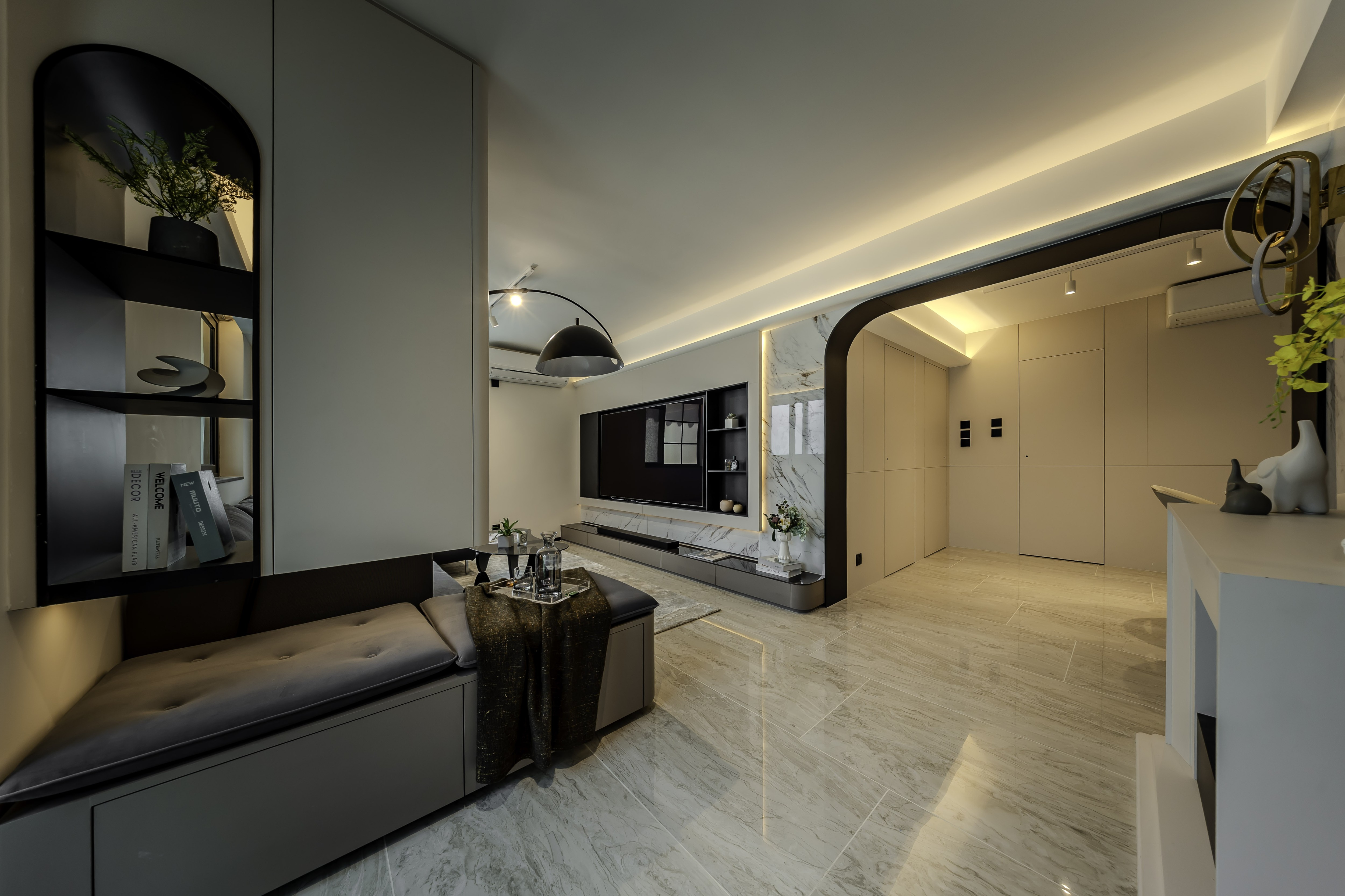 🔸 The design begins with the living room. The black arched overhead cabinet in the foyer is not only a visual highlight but also conceals a thoughtful pull-out seat underneath. This provides a convenient spot for the daughter and her friends to change shoes or gather during visits, and offers flexible utility for daily use.
