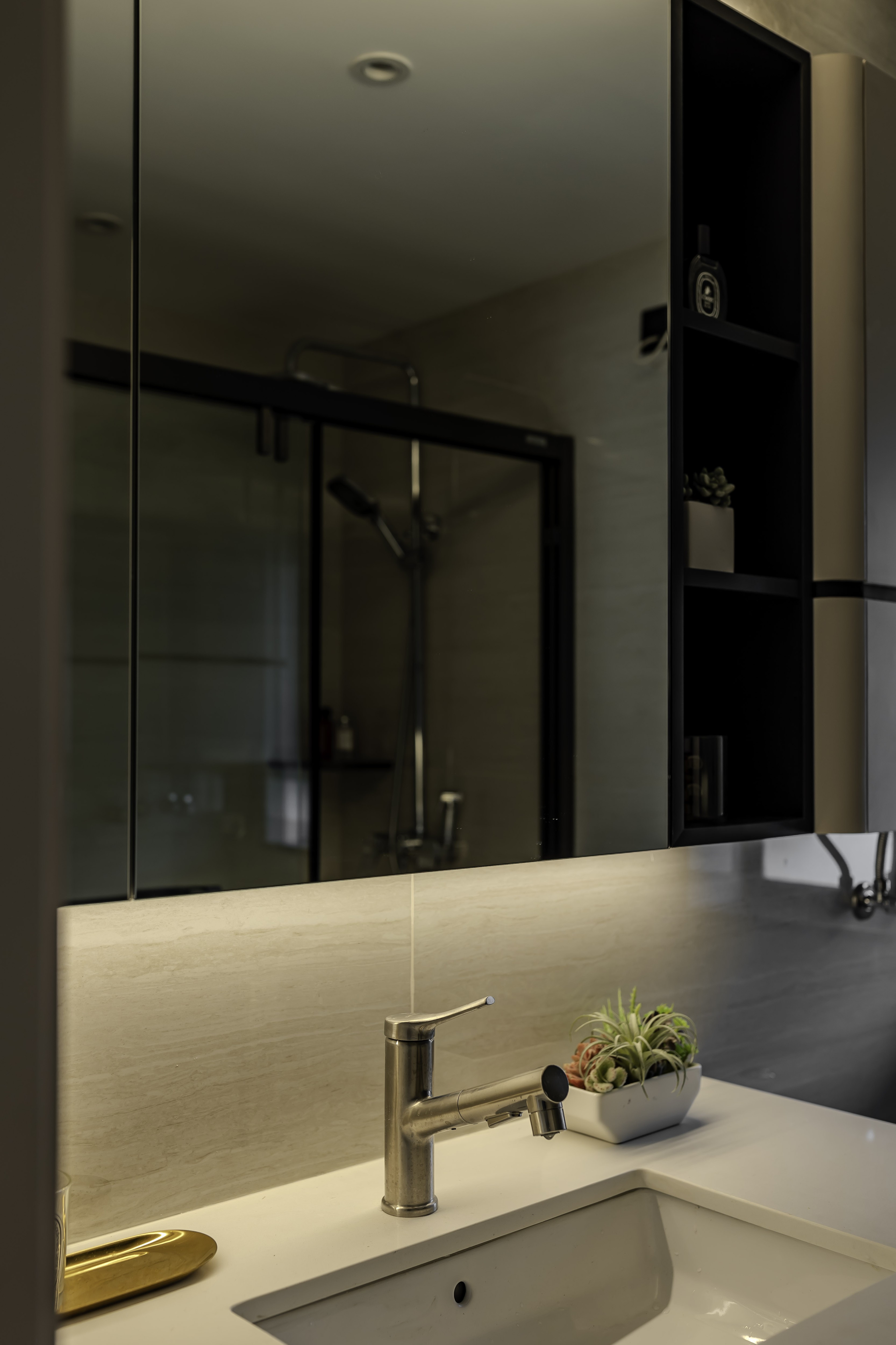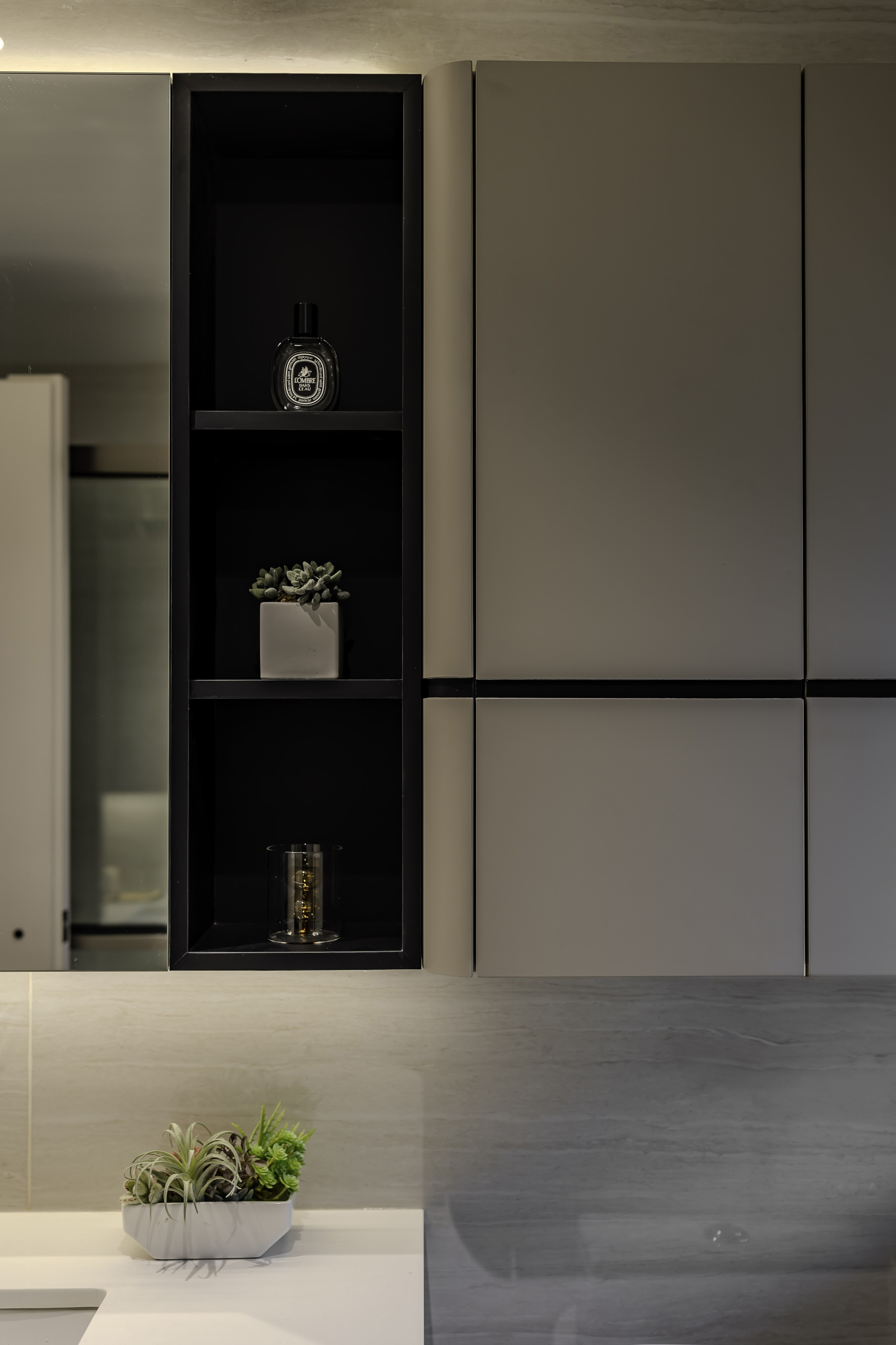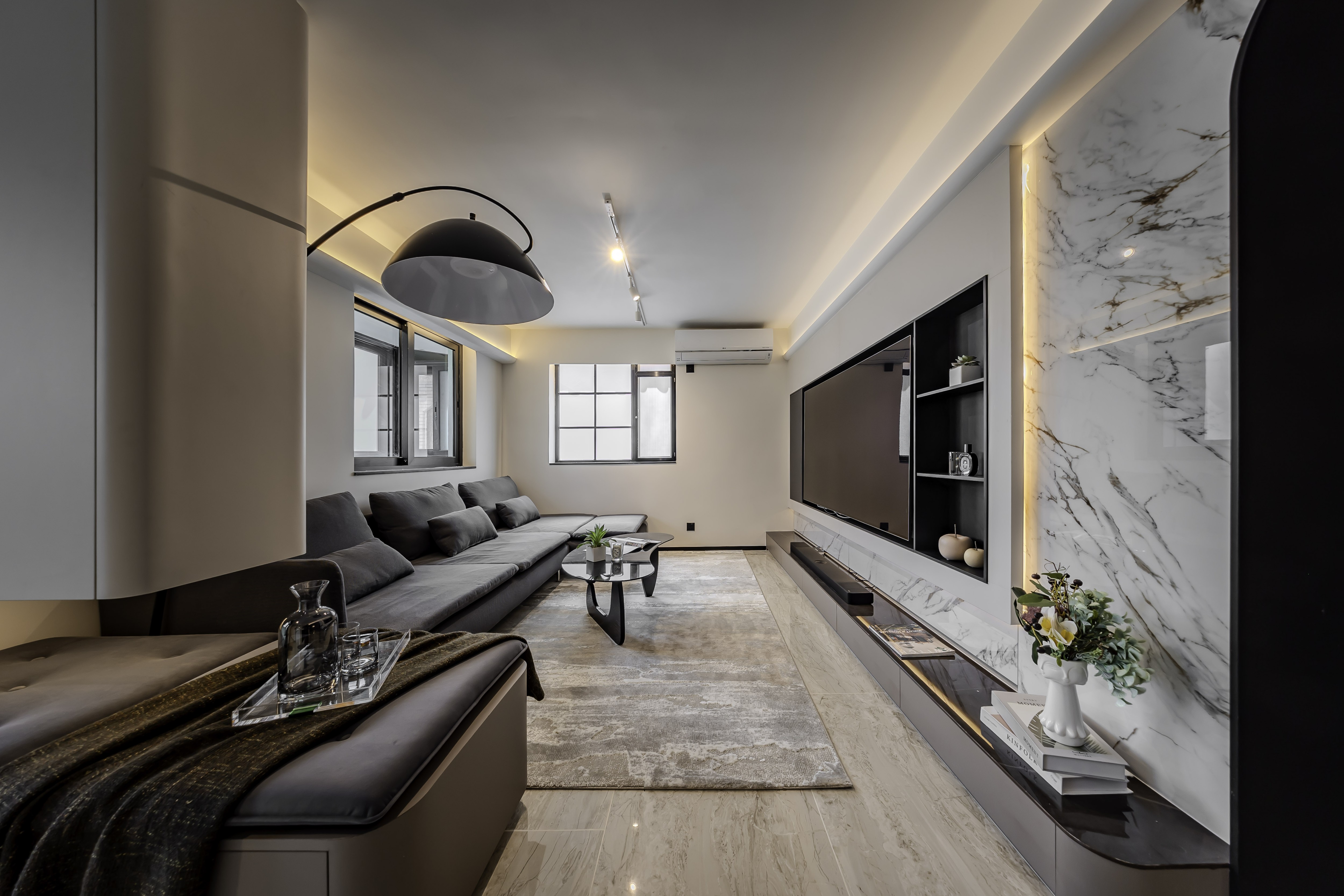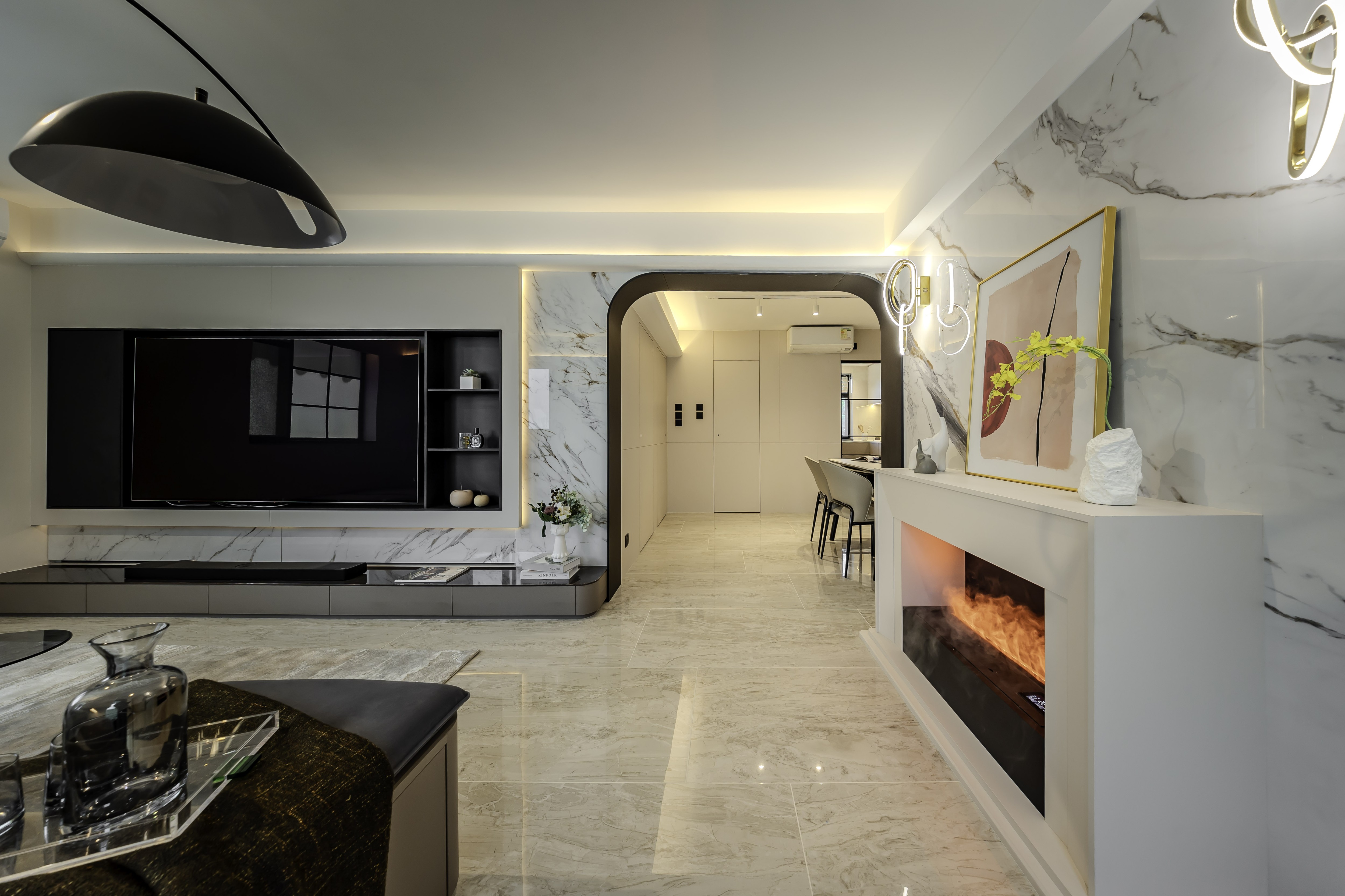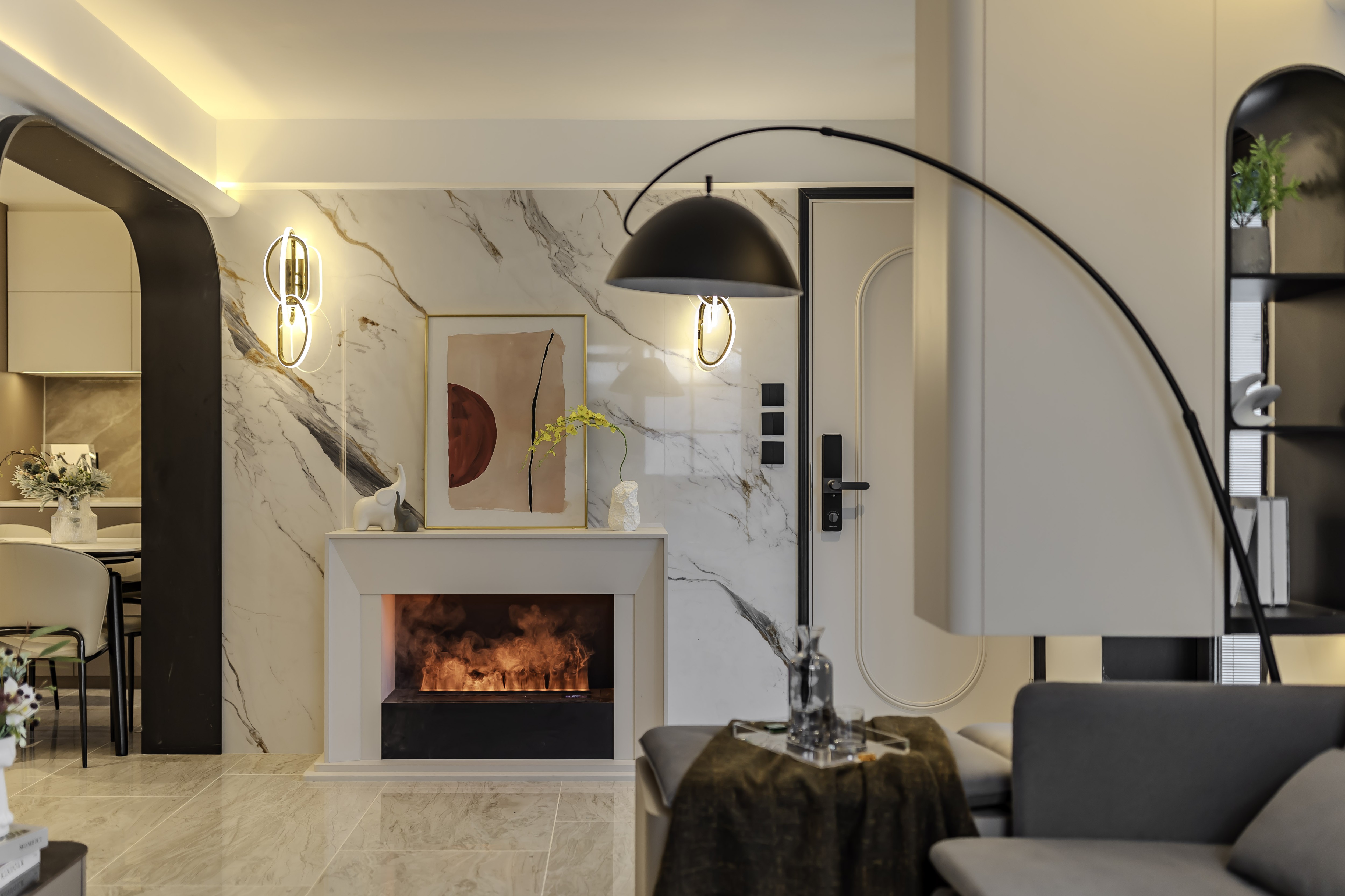 🔸 The design begins with the living room. The black arched overhead cabinet in the foyer is not only a visual highlight but also conceals a thoughtful pull-out seat underneath. This provides a convenient spot for the daughter and her friends to change shoes or gather during visits, and offers flexible utility for daily use.