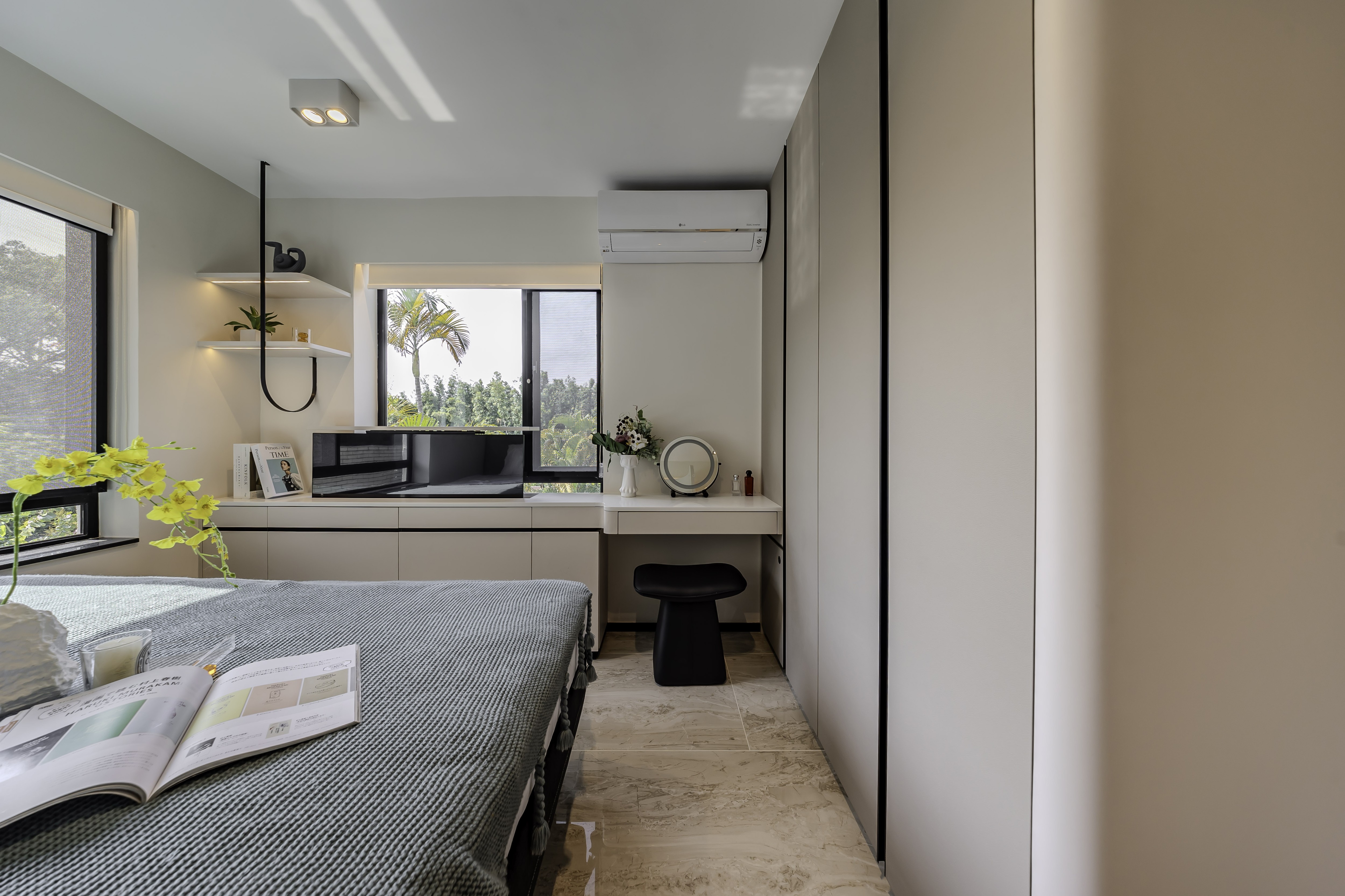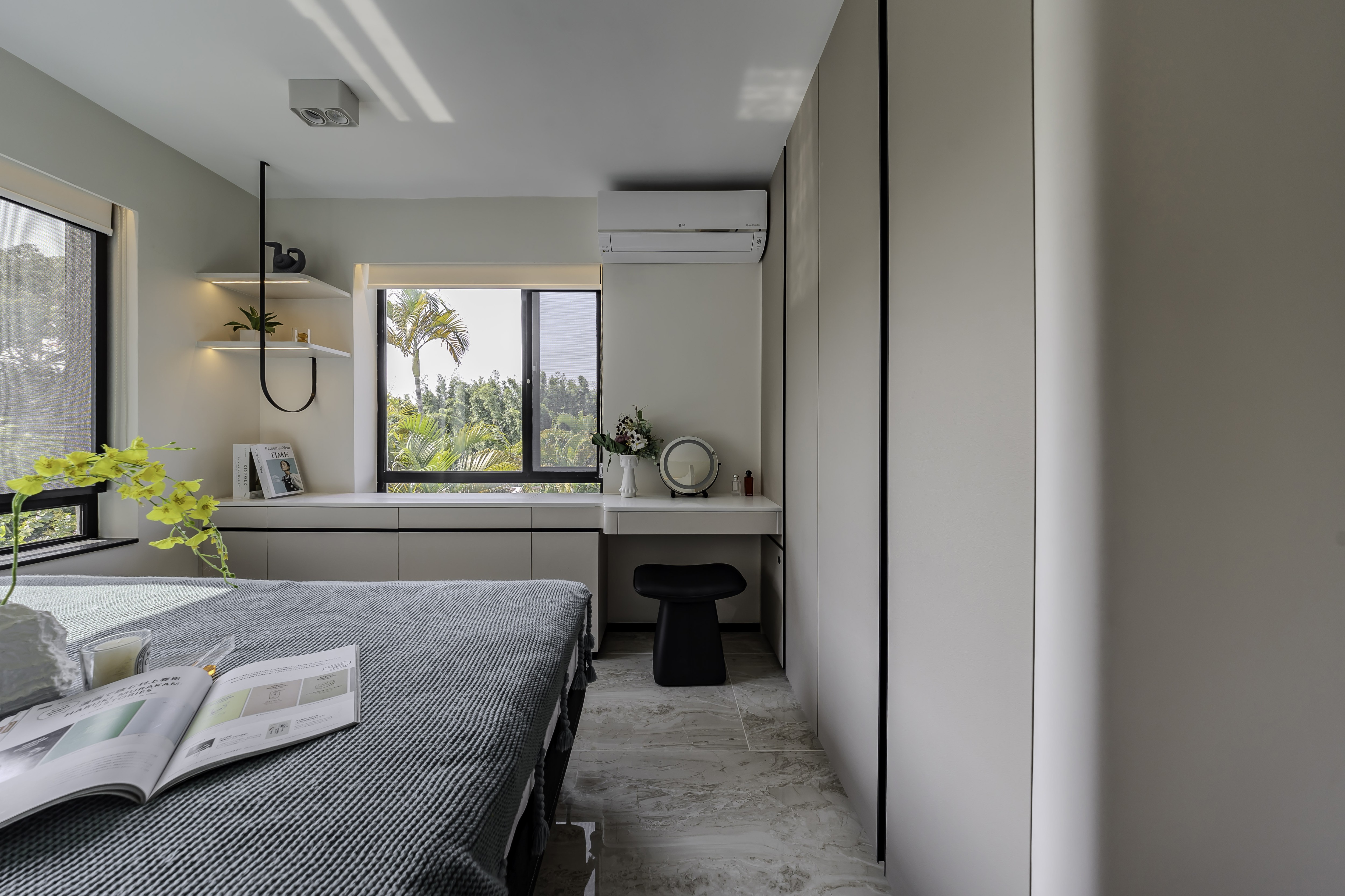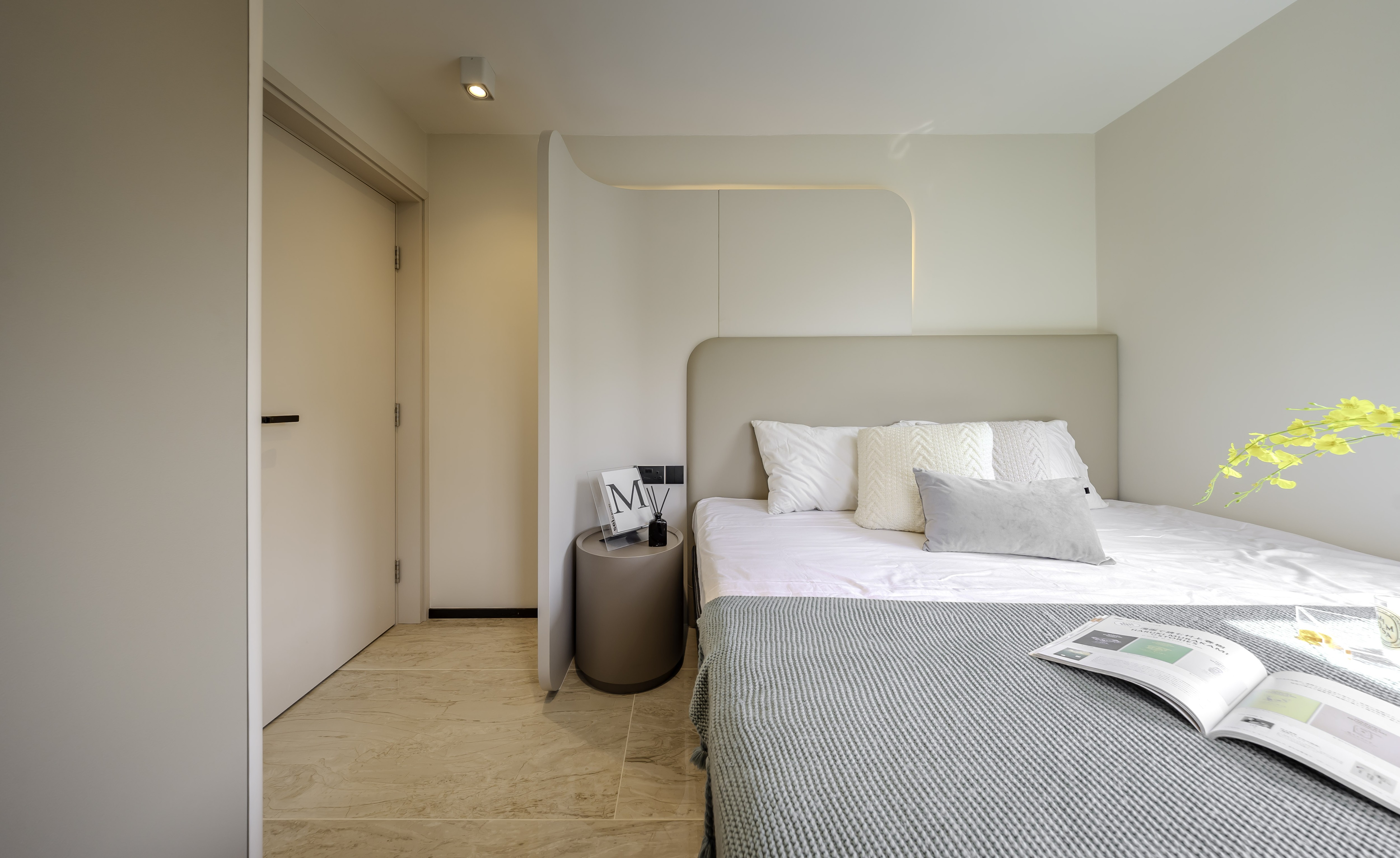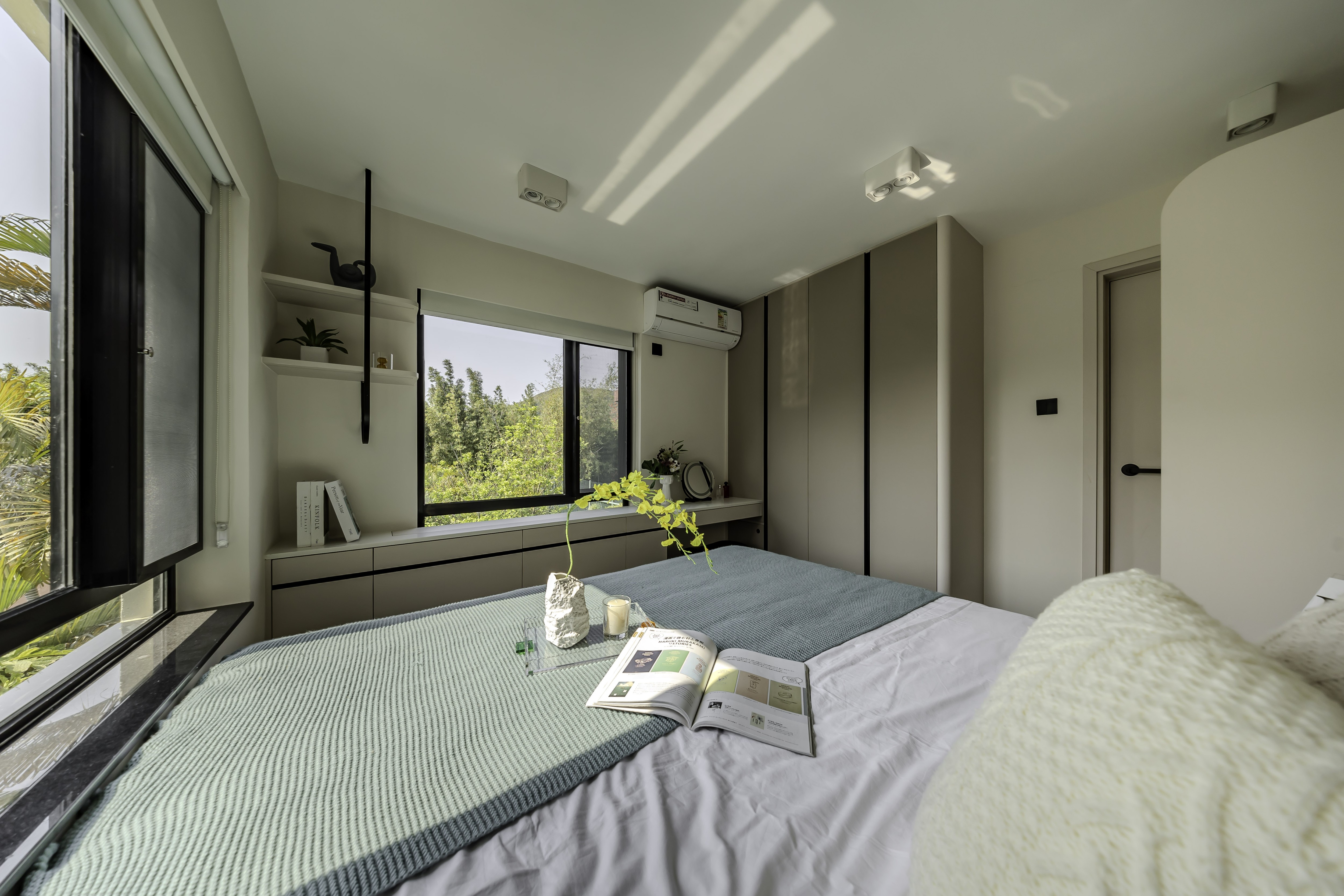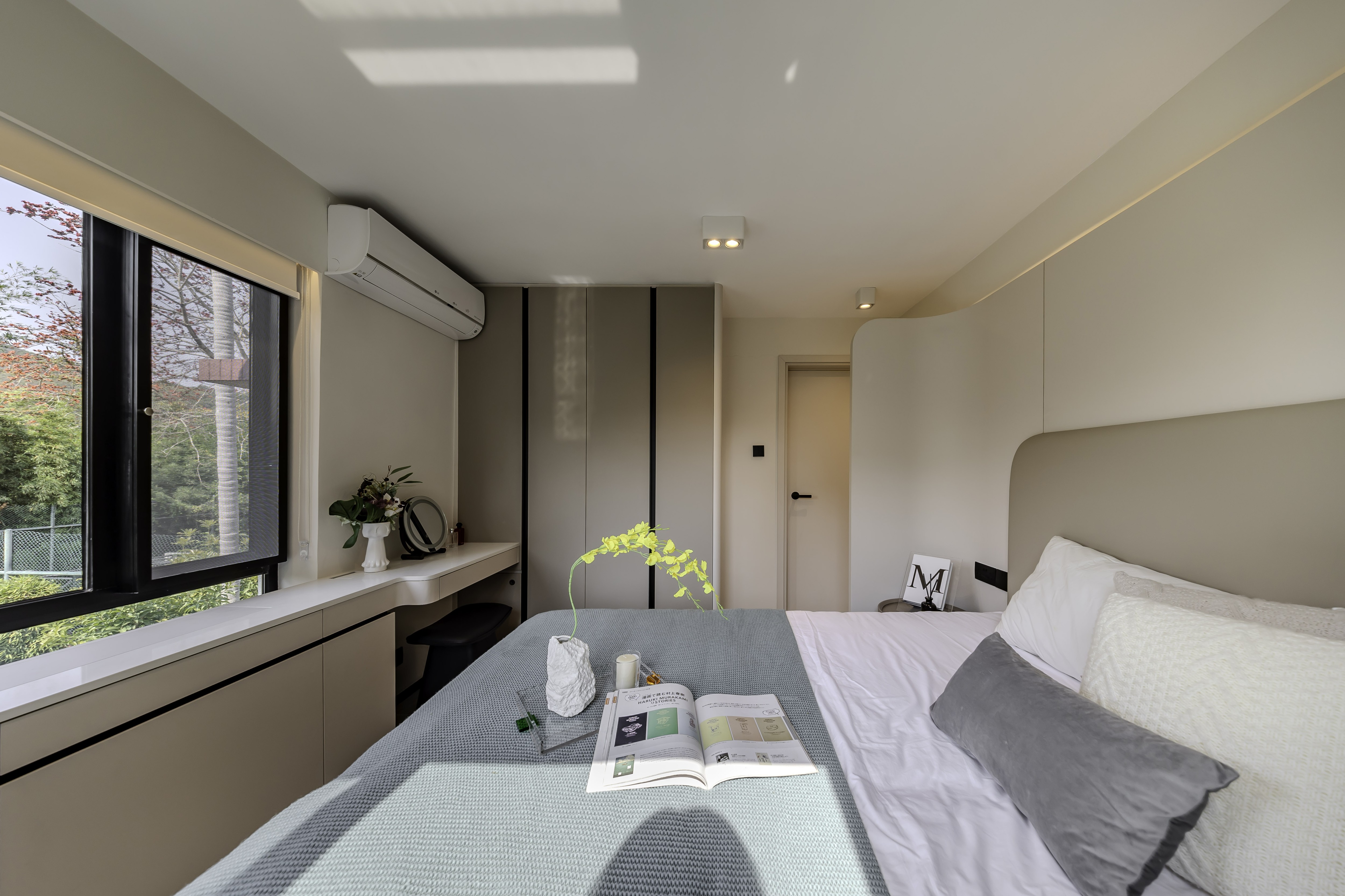 🔸 The master bedroom exudes a gentler atmosphere, dressed in a creamy color palette and accented with soft curves to create a relaxing vibe. A major highlight here is the retractable TV cabinet. The TV can be hidden when not in use, ensuring an uninterrupted view of the greenery outside the window.