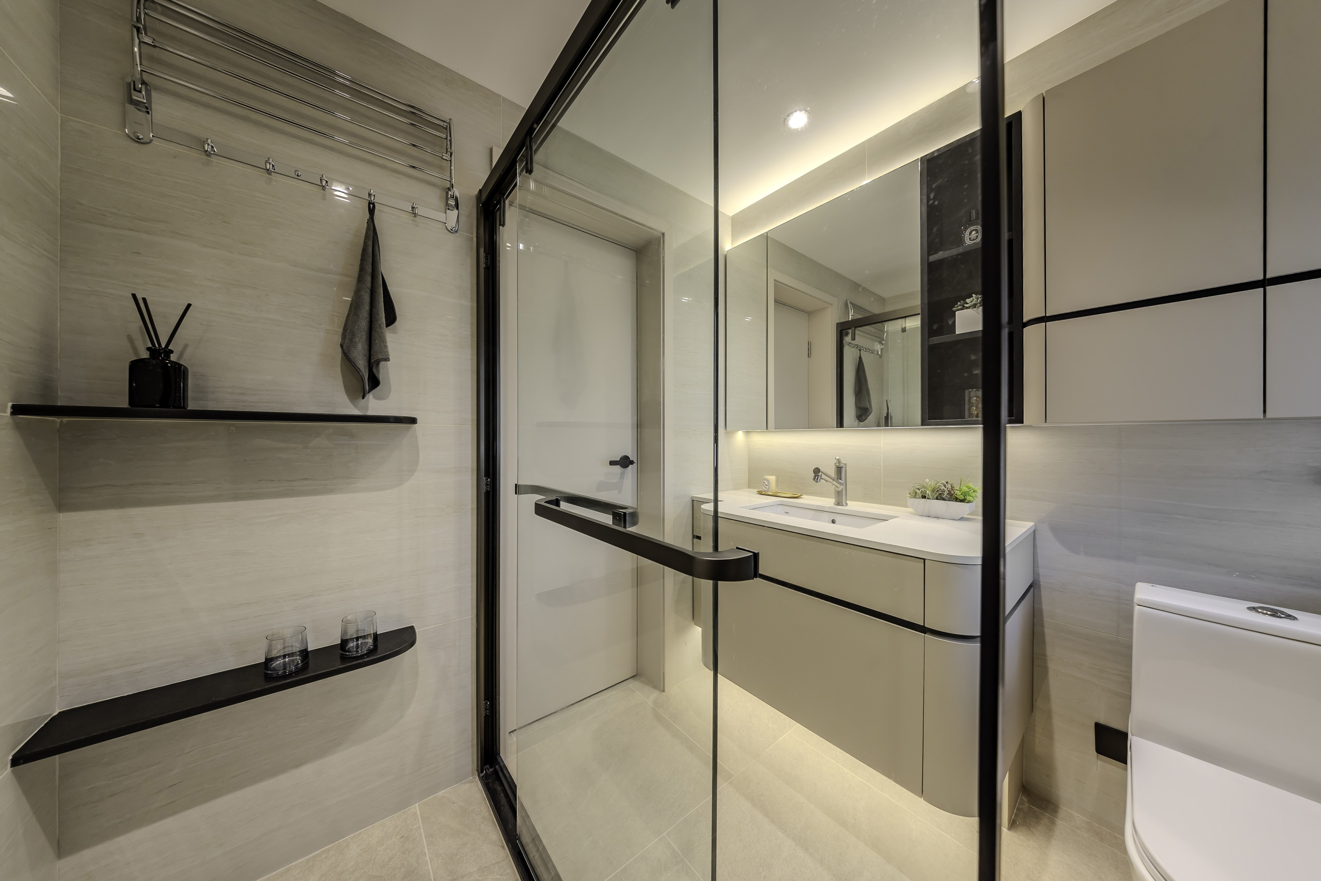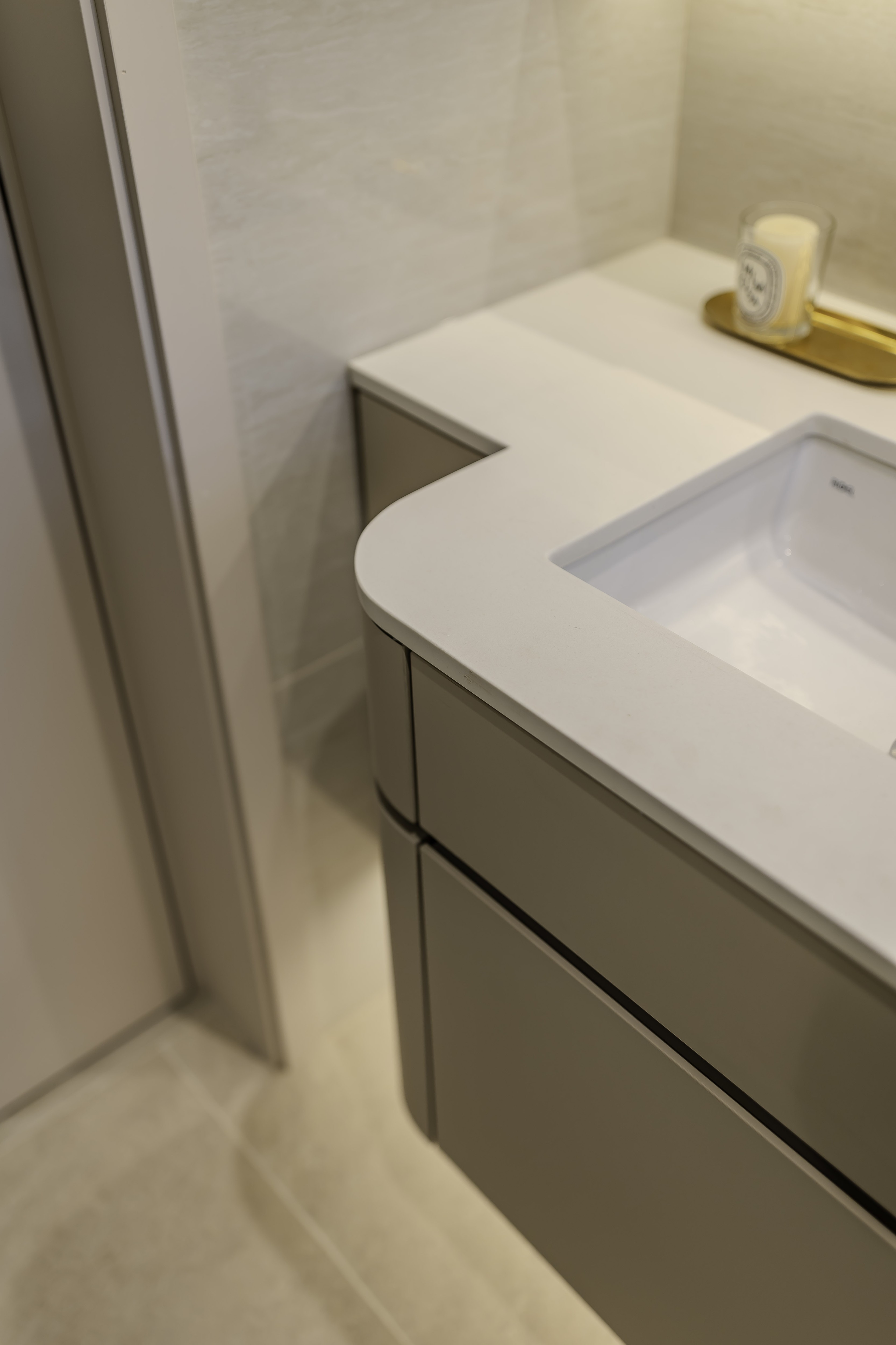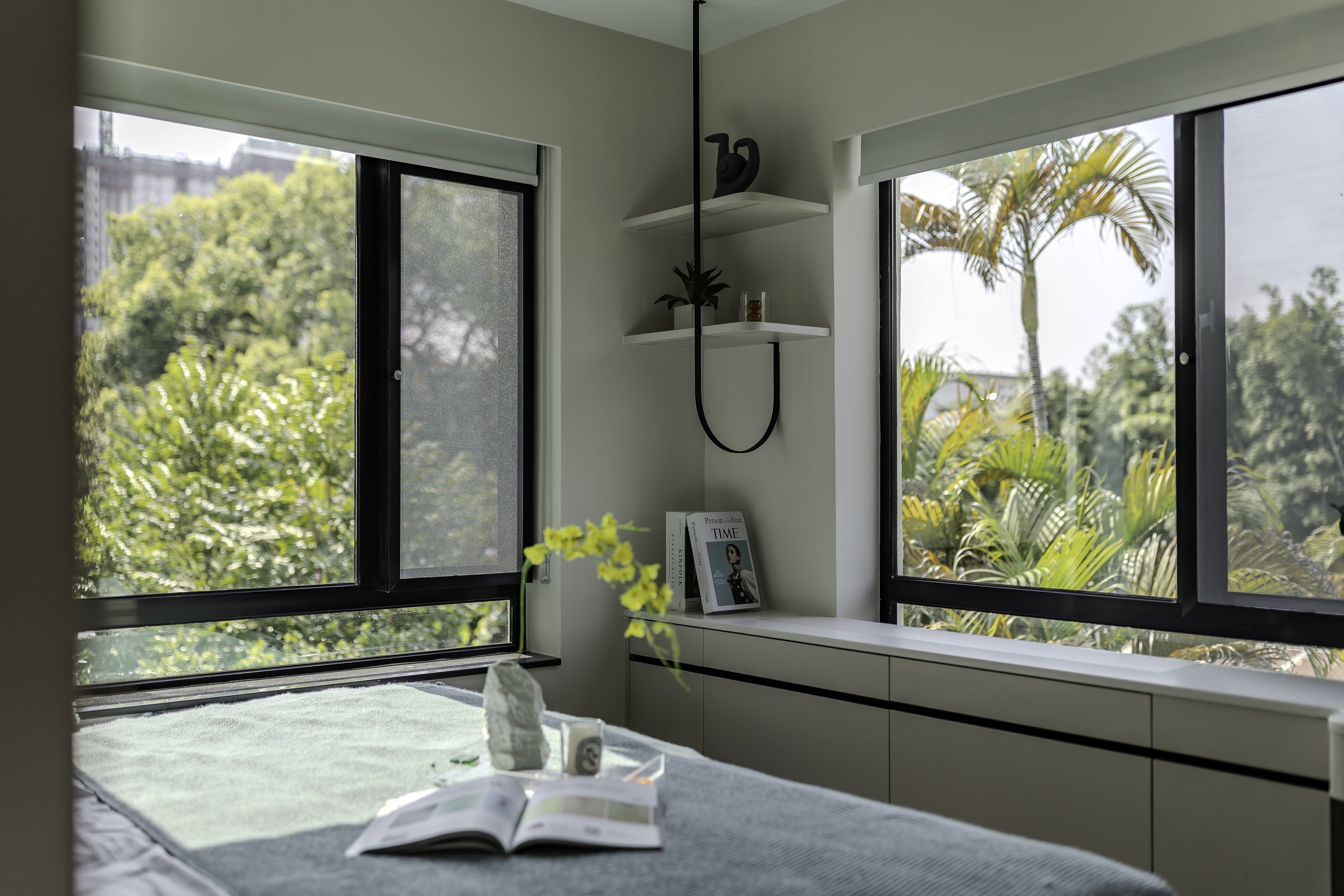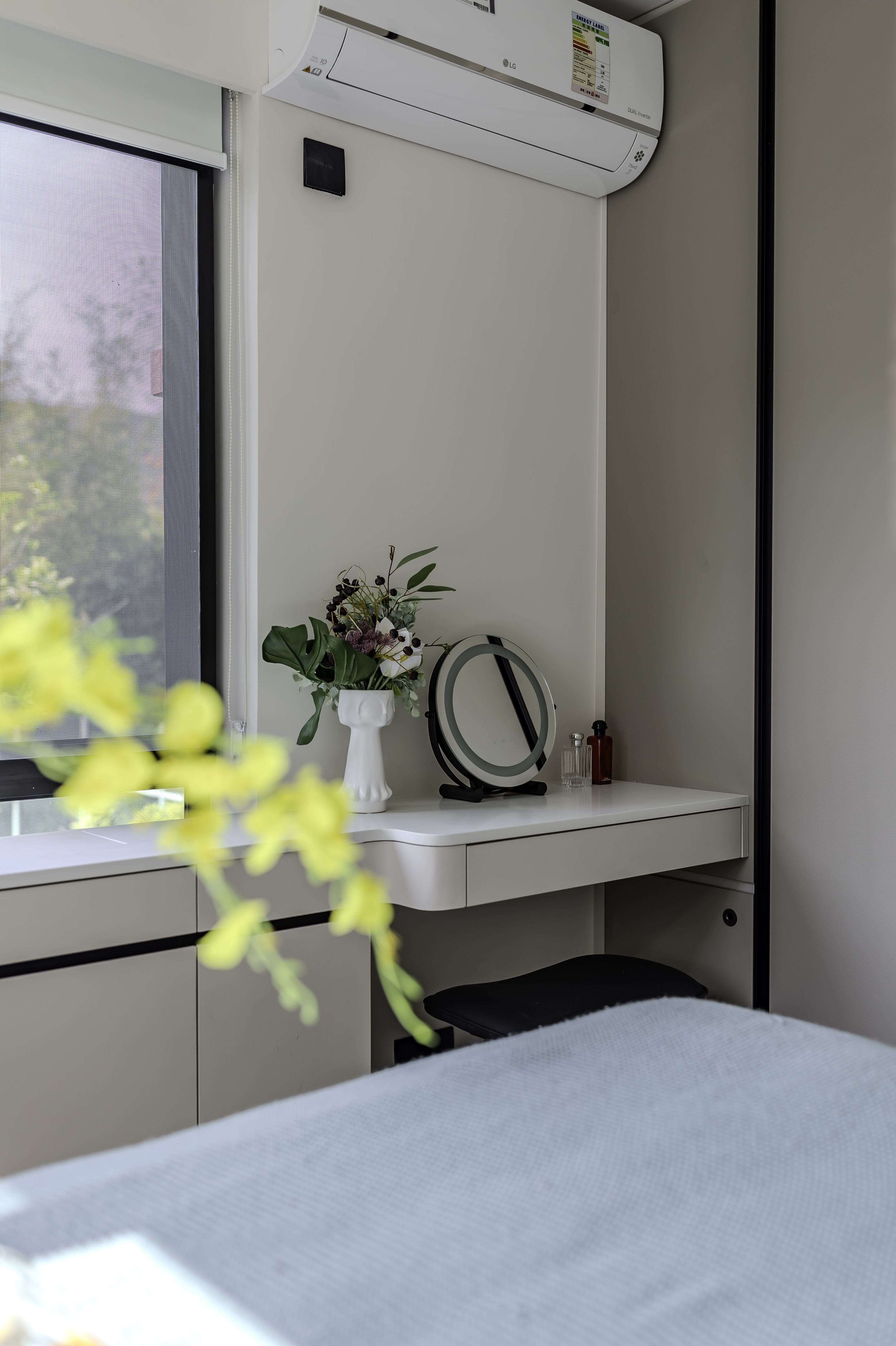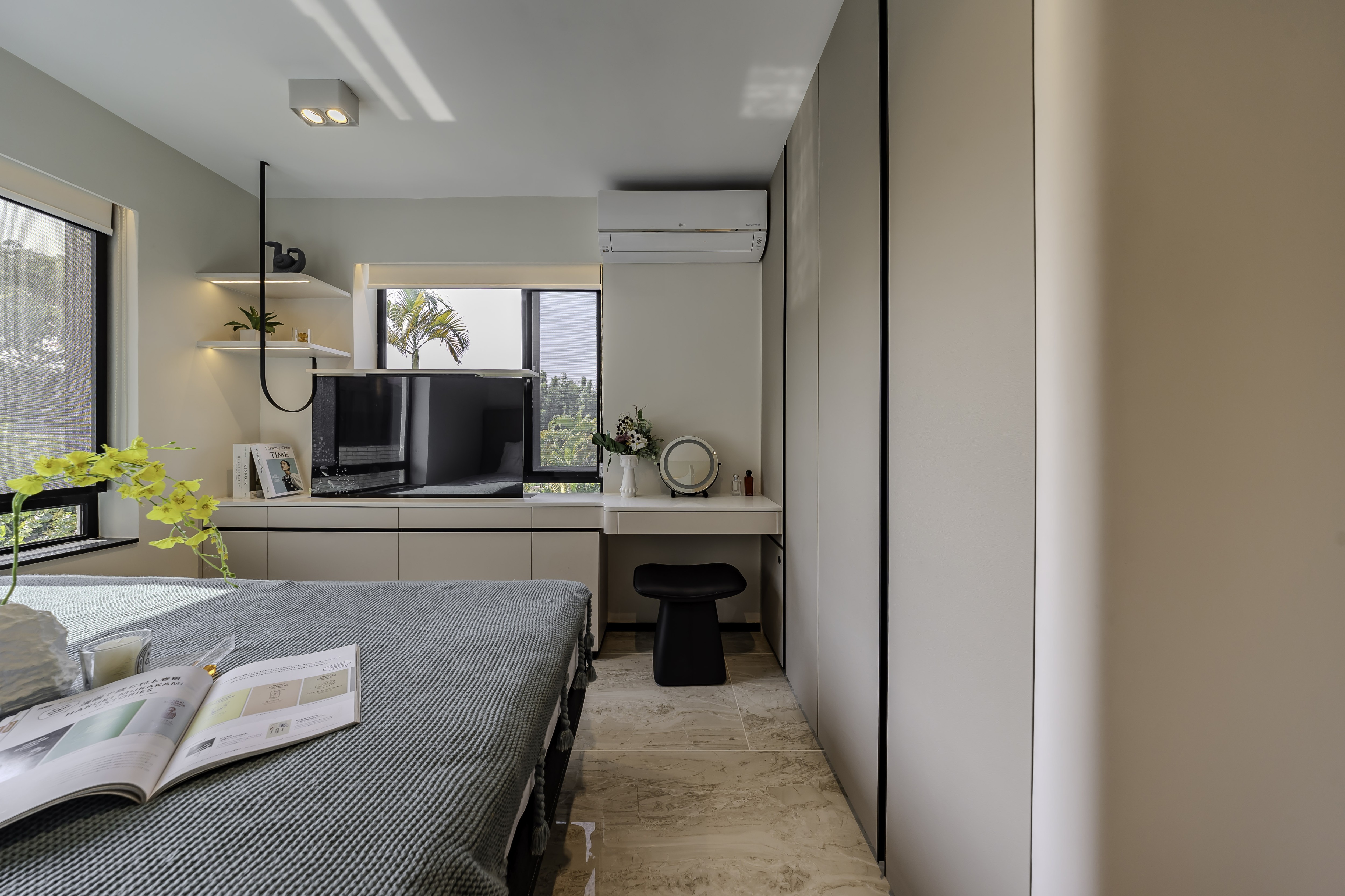 🔸 The master bedroom exudes a gentler atmosphere, dressed in a creamy color palette and accented with soft curves to create a relaxing vibe. A major highlight here is the retractable TV cabinet. The TV can be hidden when not in use, ensuring an uninterrupted view of the greenery outside the window.