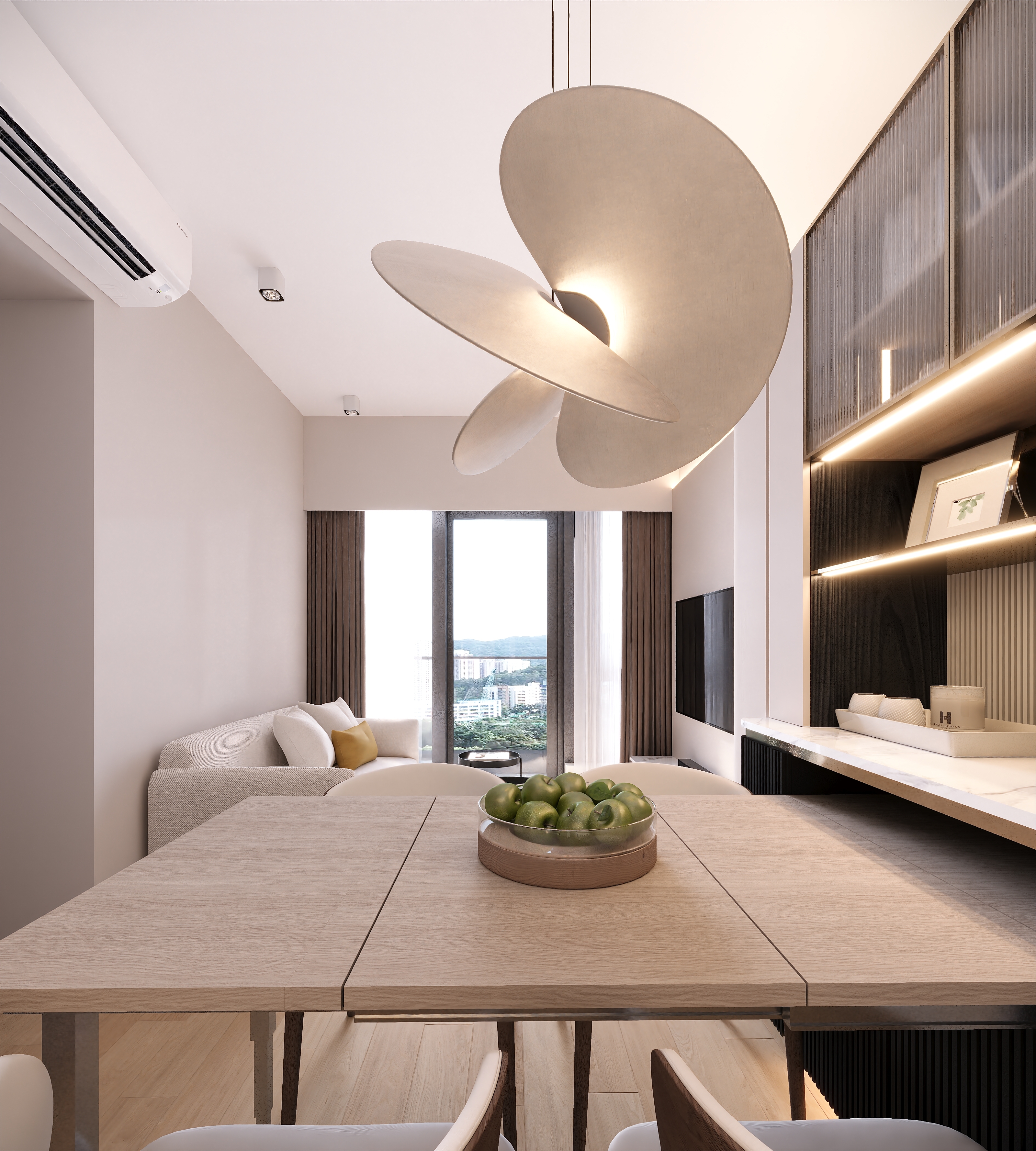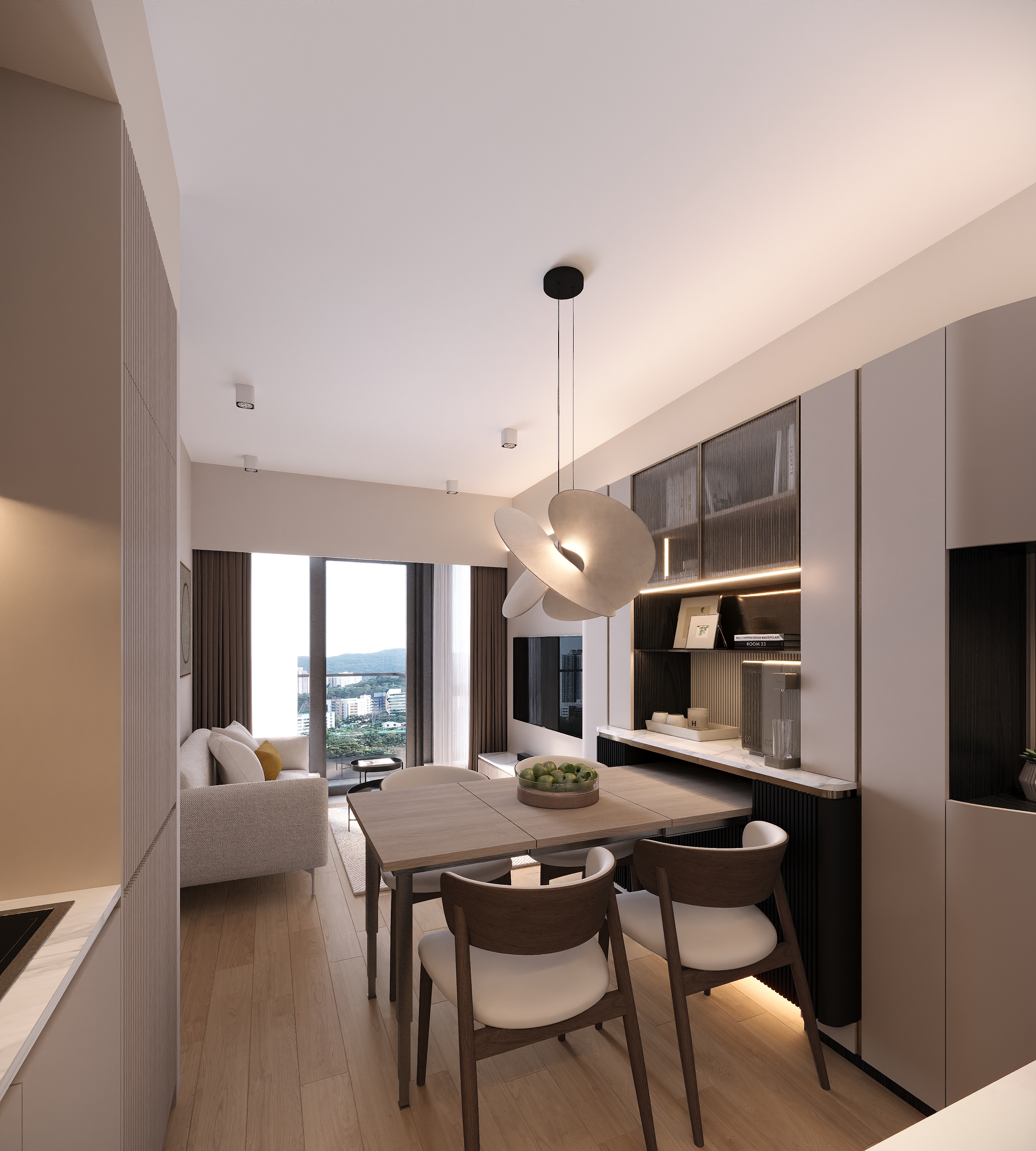 The living room features a foldable dining table, which can be stored in the cabinet when not in use to expand the living room’s activity space.