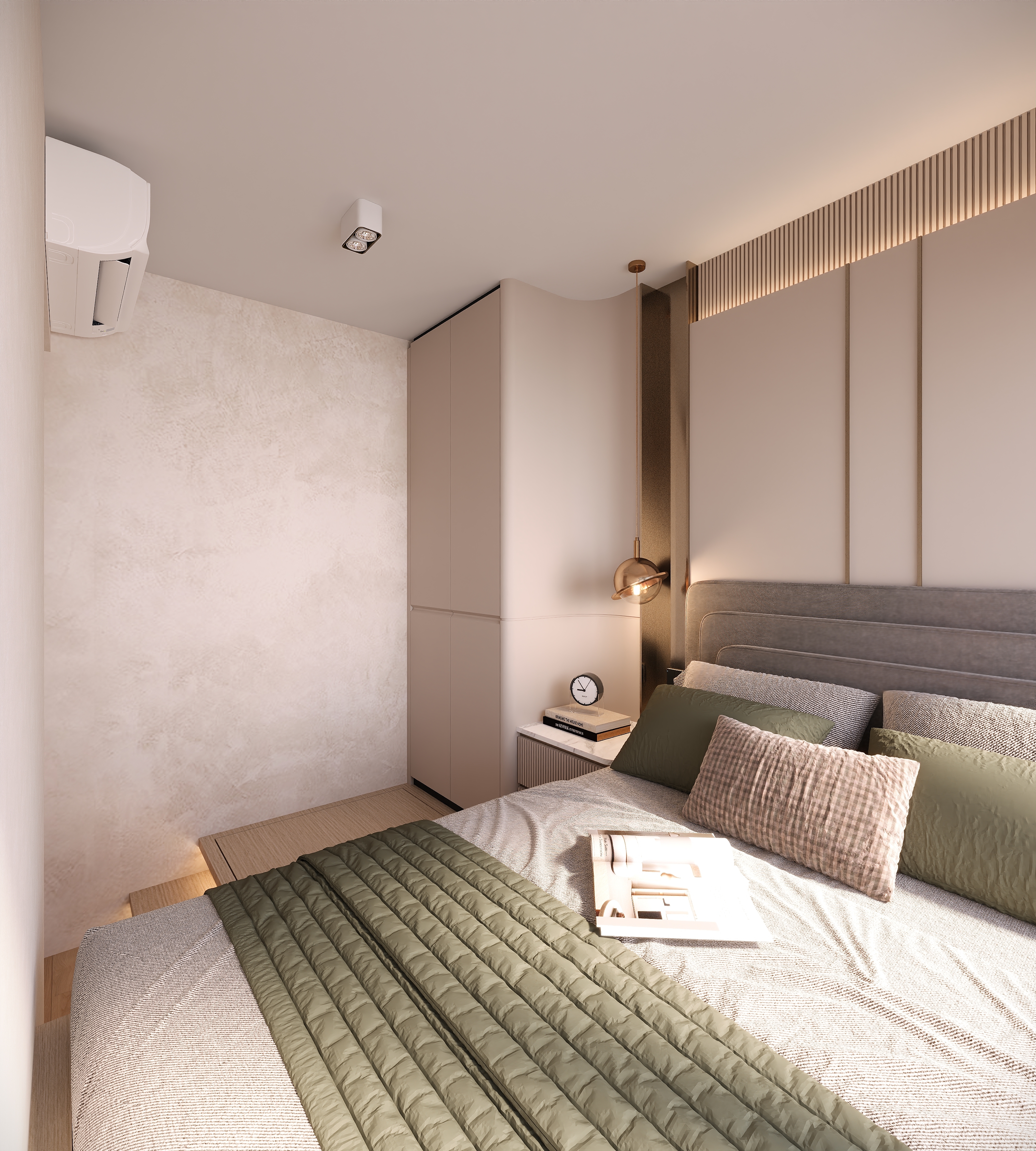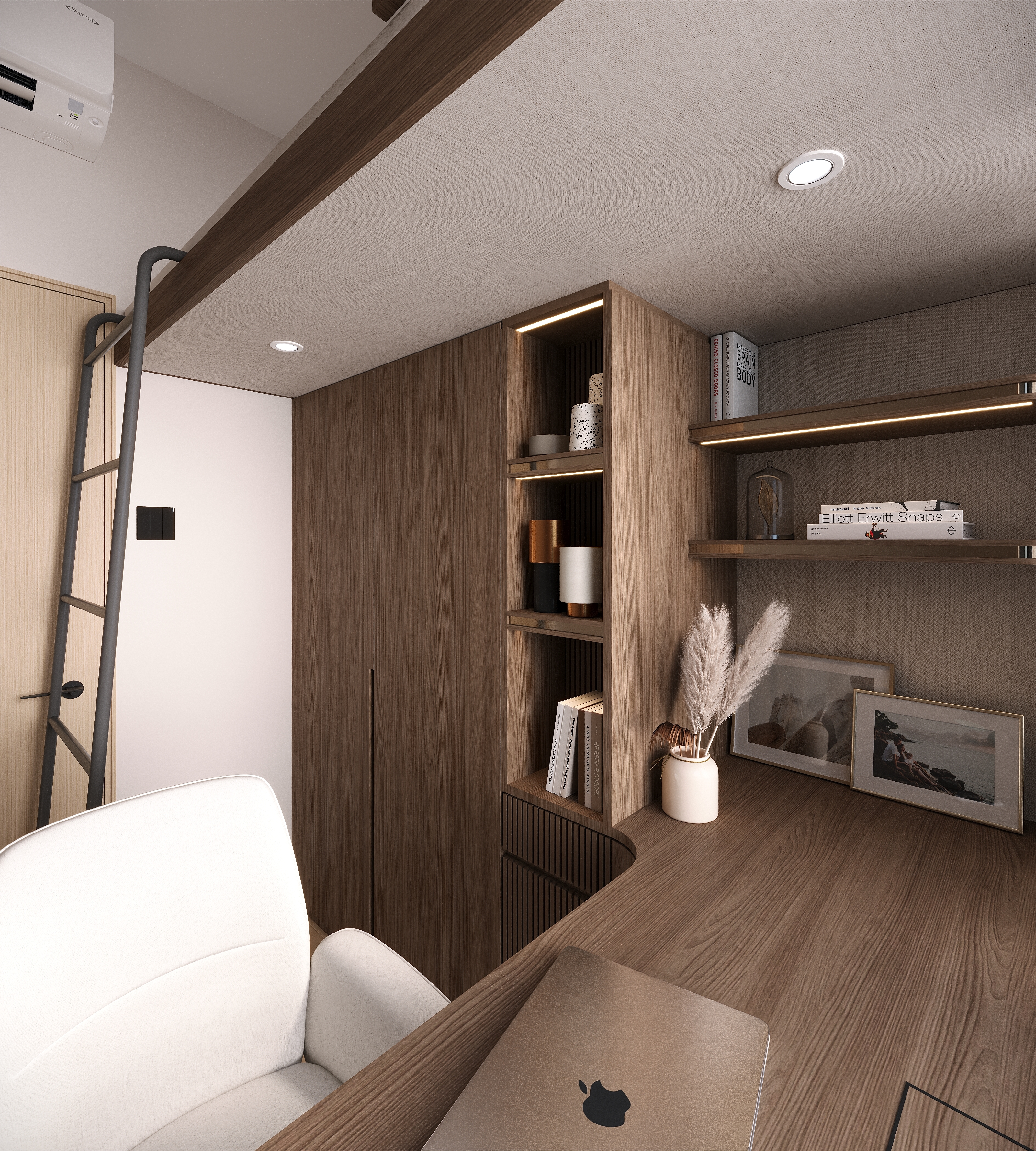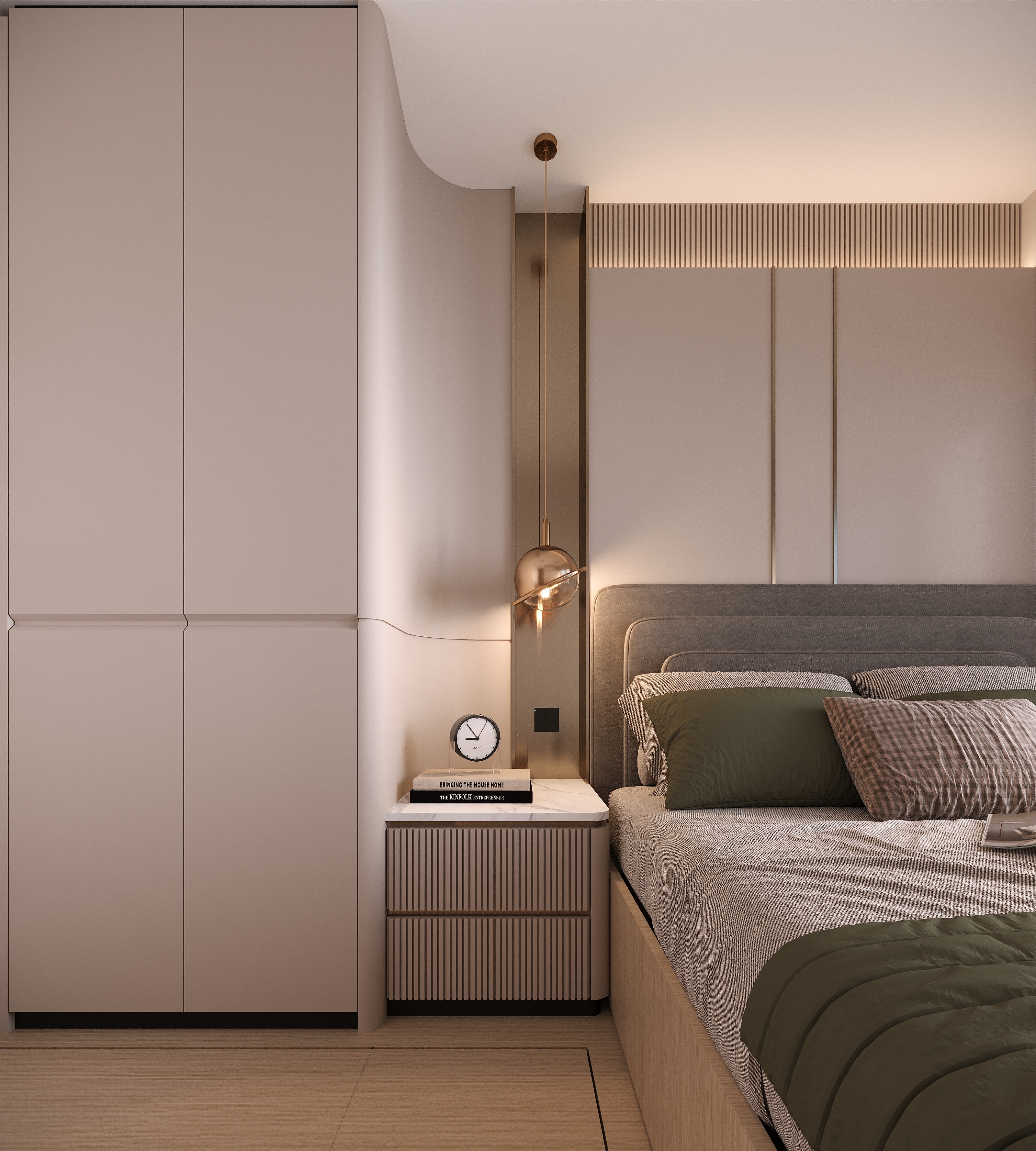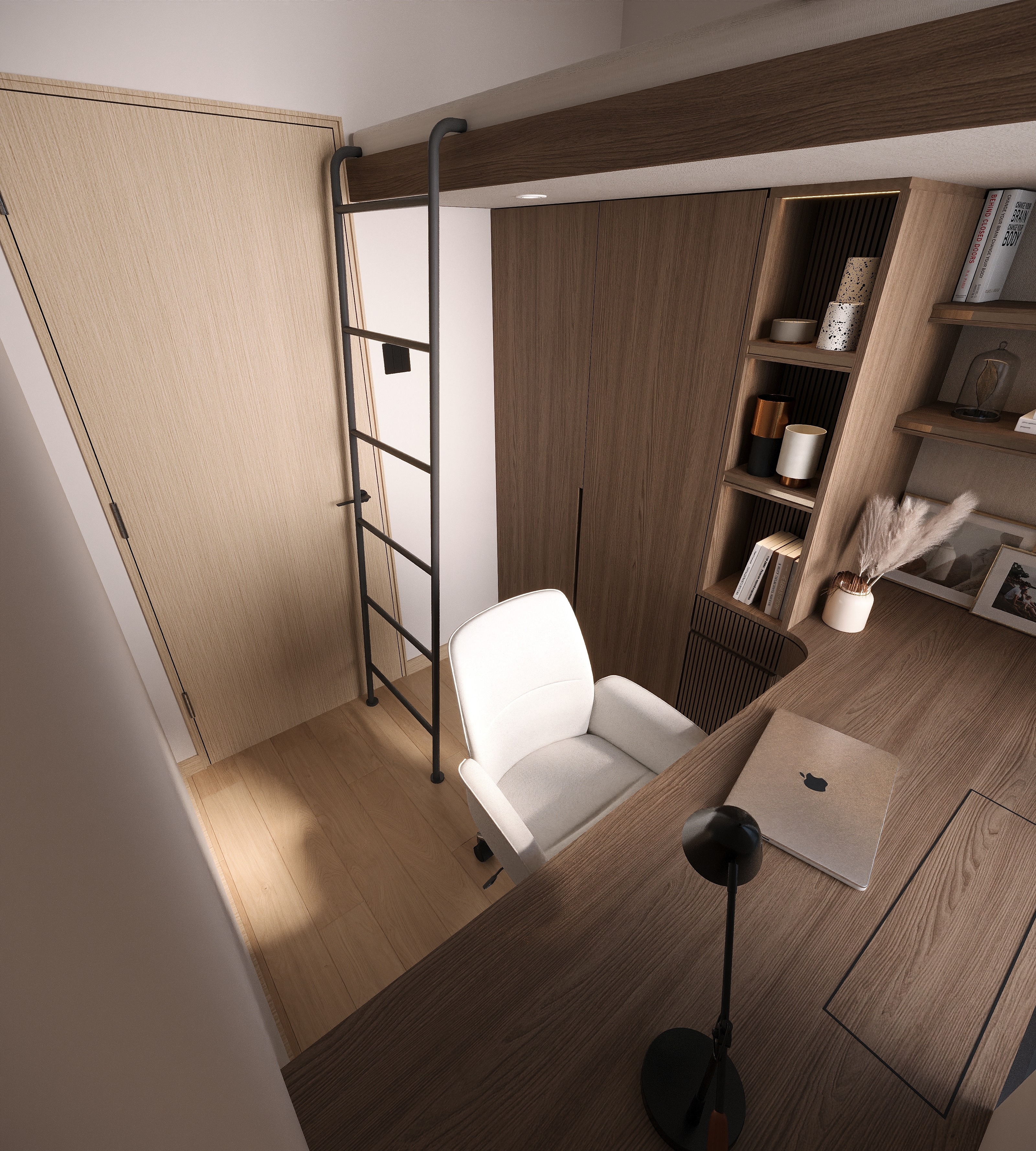 The master bedroom focuses on multi-layered storage with a raised platform. The wardrobe corner is converted into a bedside table, and the padded headboard with strip lights creates a cozy atmosphere for night reading. The kids’ room uses dark brown with metal lines; a loft bed separates the resting and study areas, and the desk is integrated into the design—practical yet stylish.