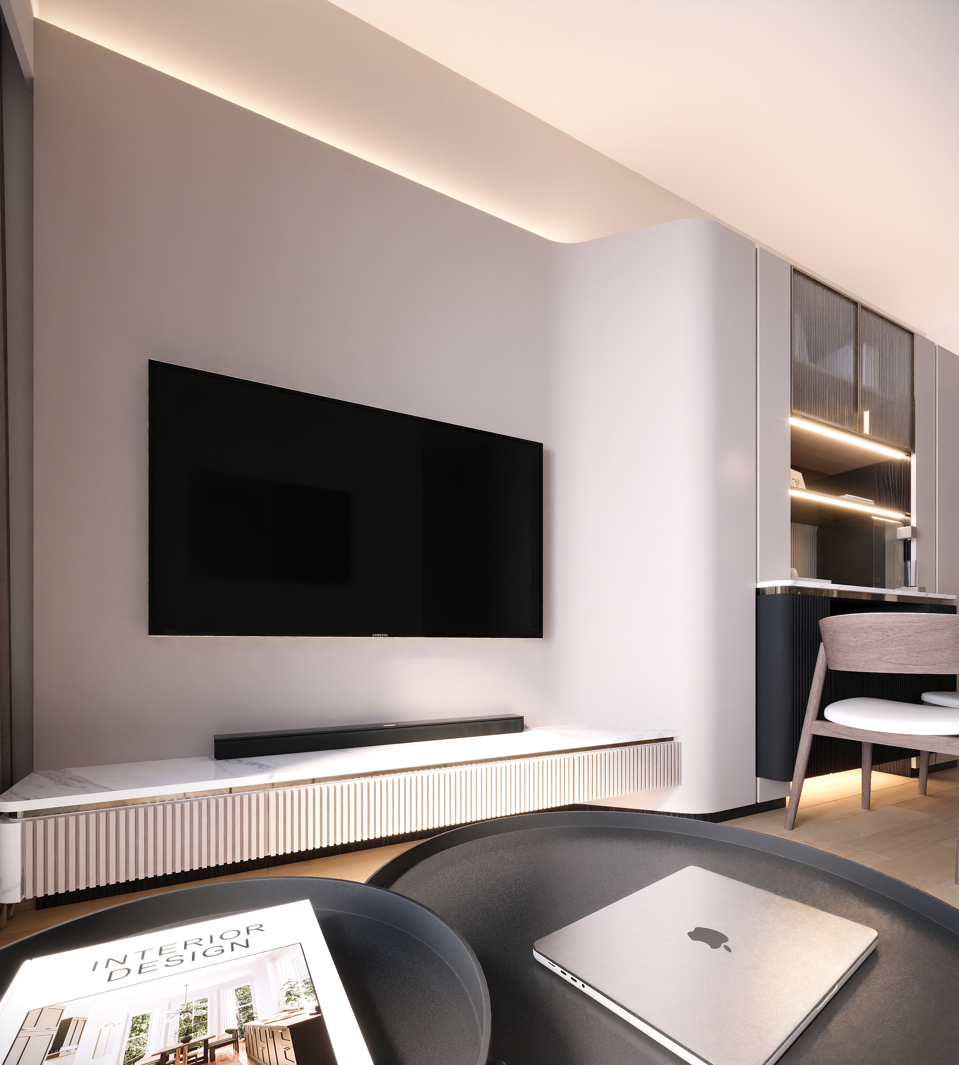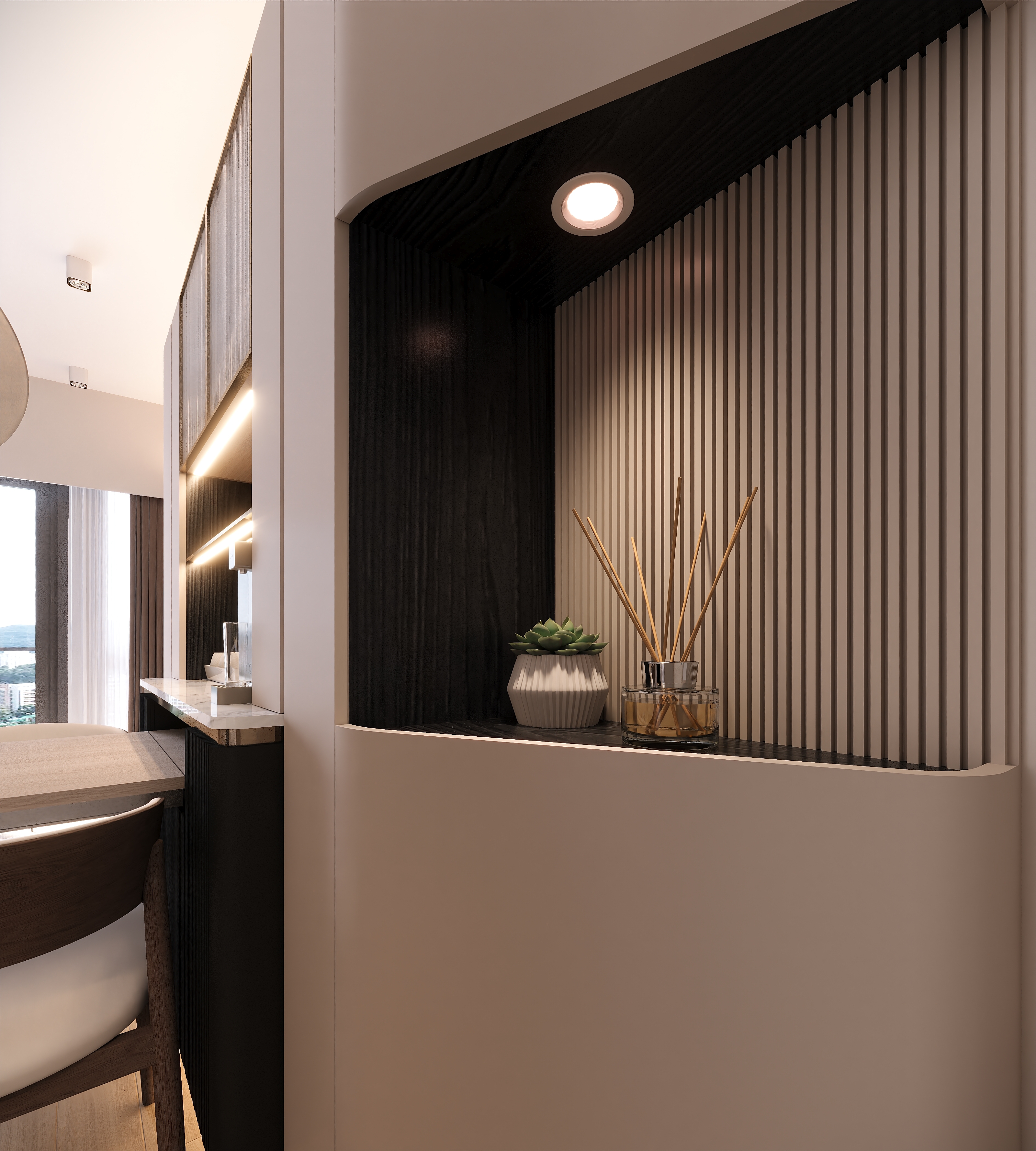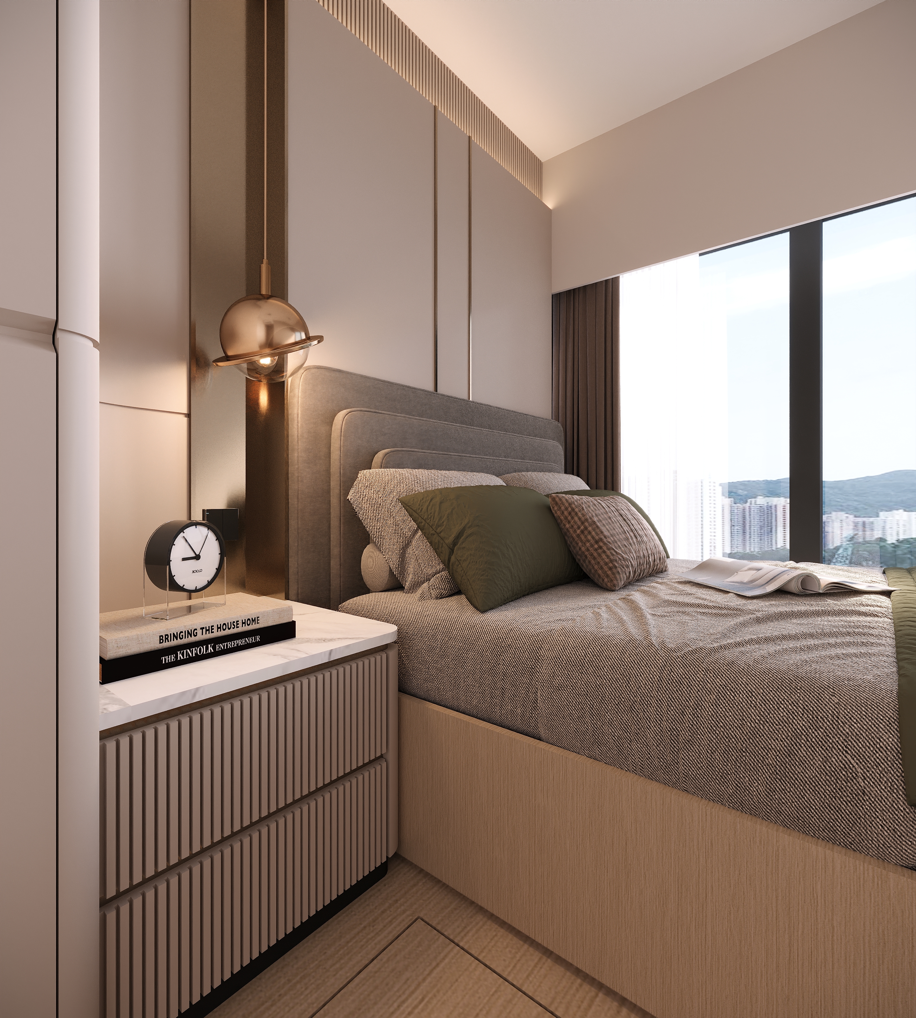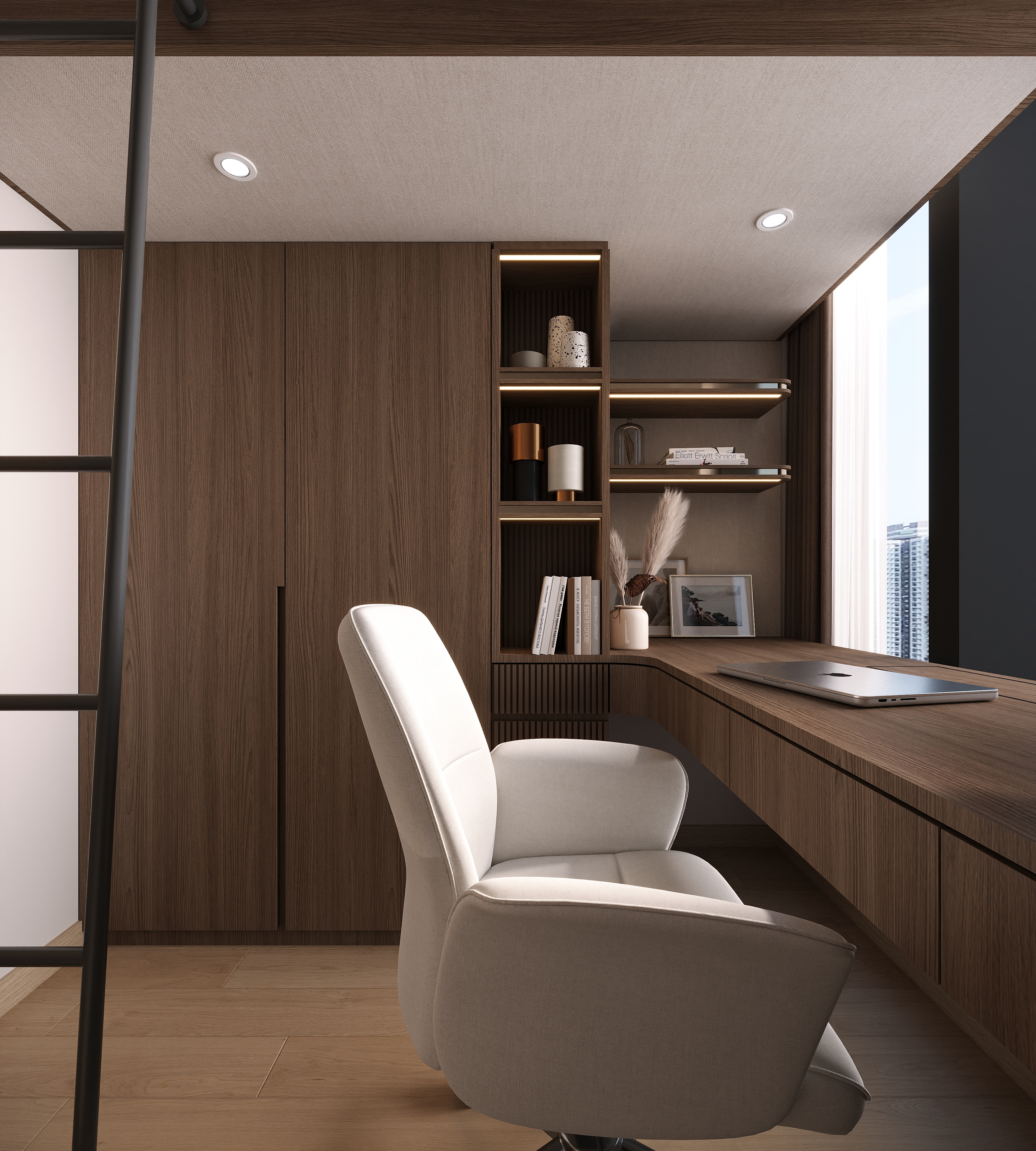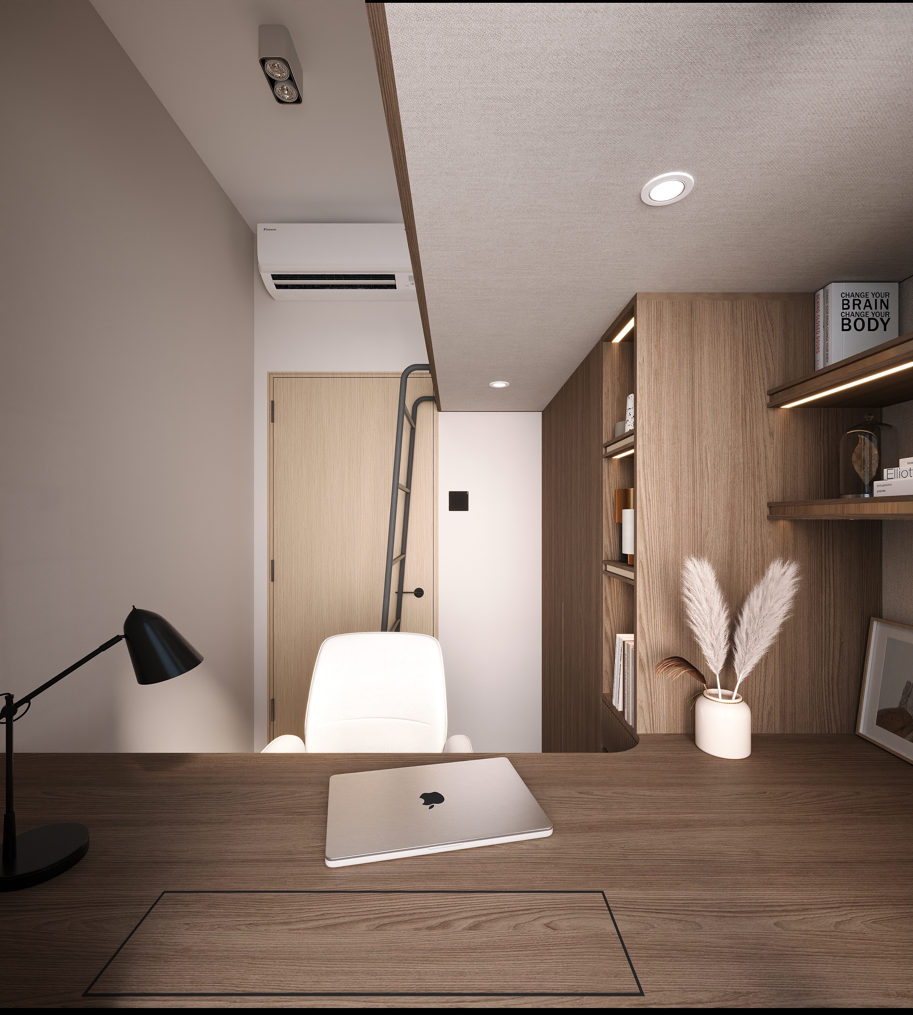 The master bedroom focuses on multi-layered storage with a raised platform. The wardrobe corner is converted into a bedside table, and the padded headboard with strip lights creates a cozy atmosphere for night reading. The kids’ room uses dark brown with metal lines; a loft bed separates the resting and study areas, and the desk is integrated into the design—practical yet stylish.