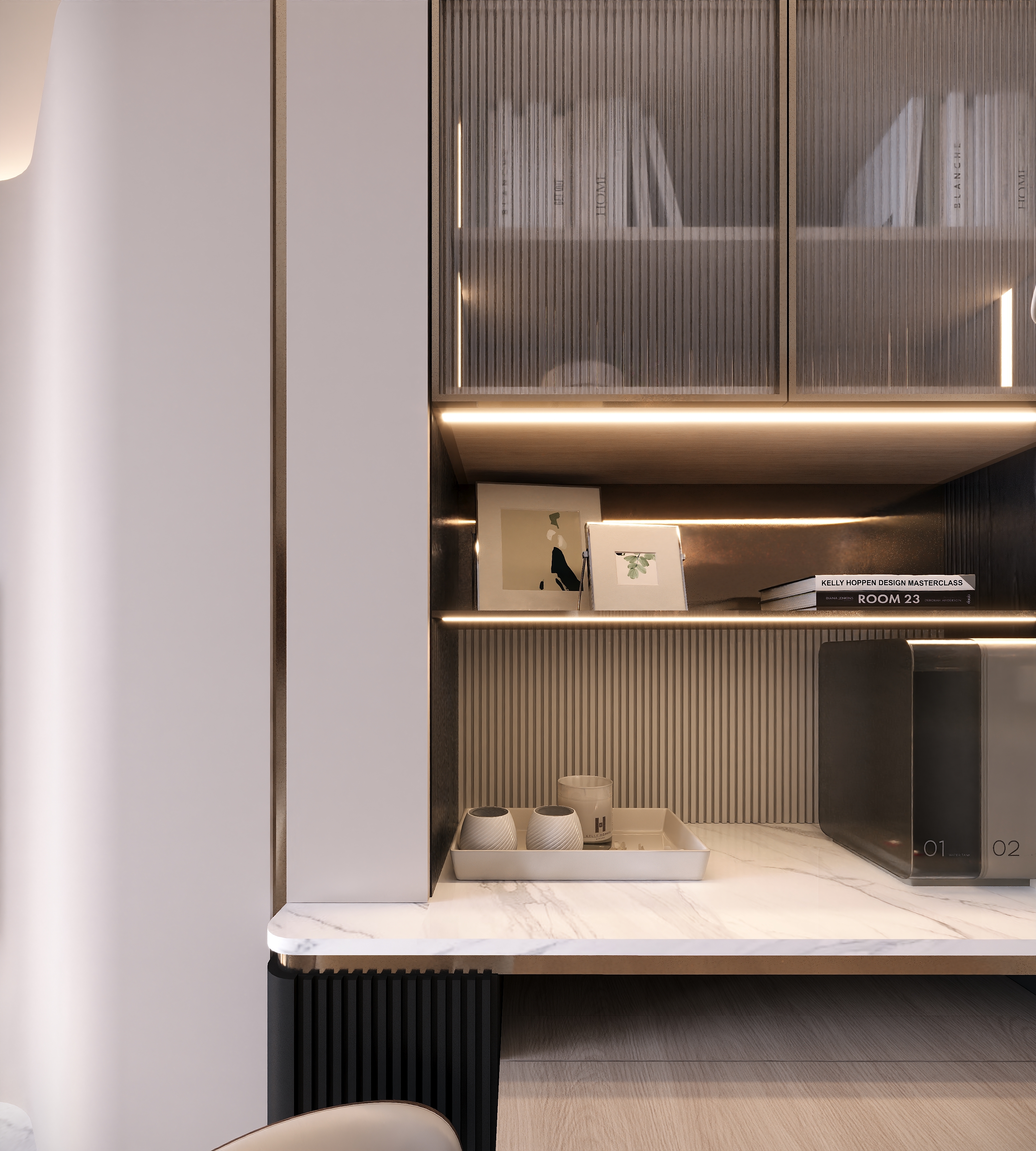 The designer used earth tones as the base, accented with metal and glass to enhance the ambiance. This created a bright, open, and transparent home design with a light luxury vibe—bright overall while maintaining a sense of hierarchy, and with ample storage. The custom furniture and storage solutions throughout the home were thoughtfully designed!