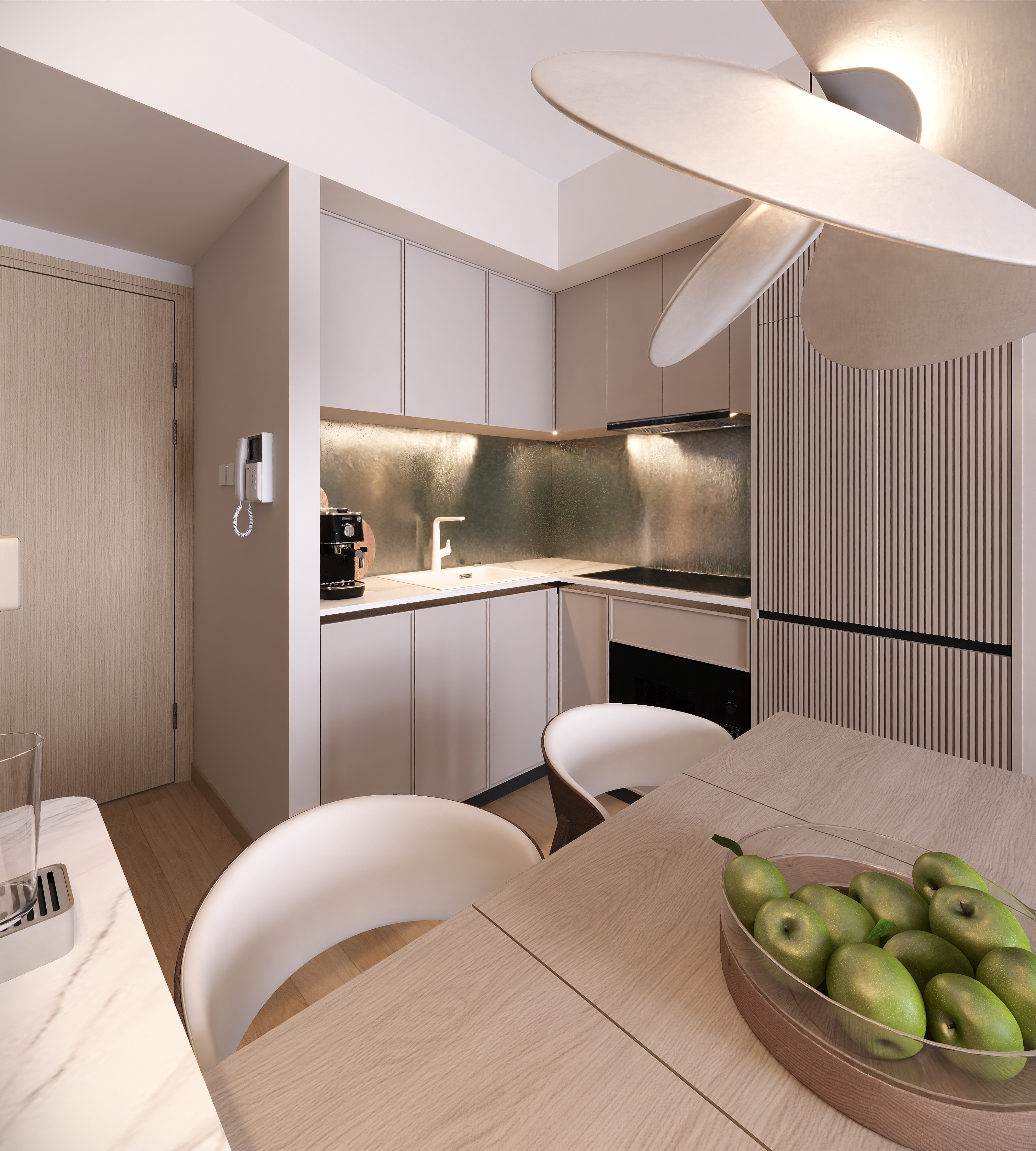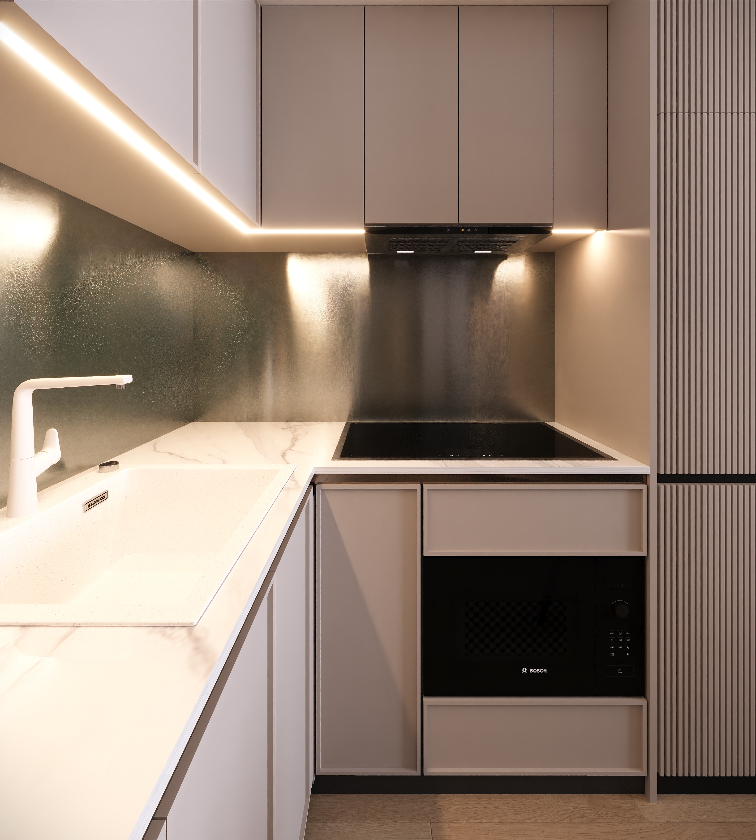 In the kitchen, the structure of the old cabinets was kept unchanged; only the surfaces were replaced. This ensured visual consistency and durability, making the cooking area clean and easy to maintain.