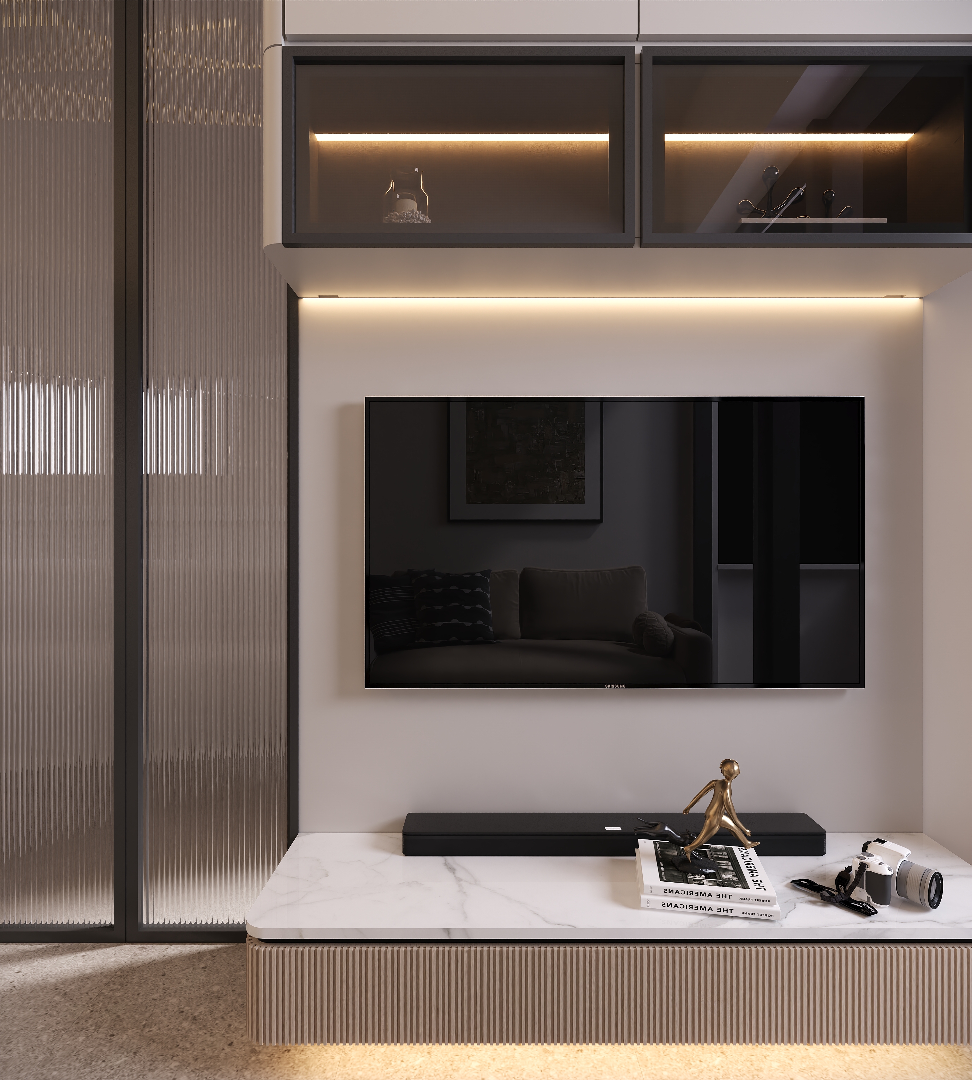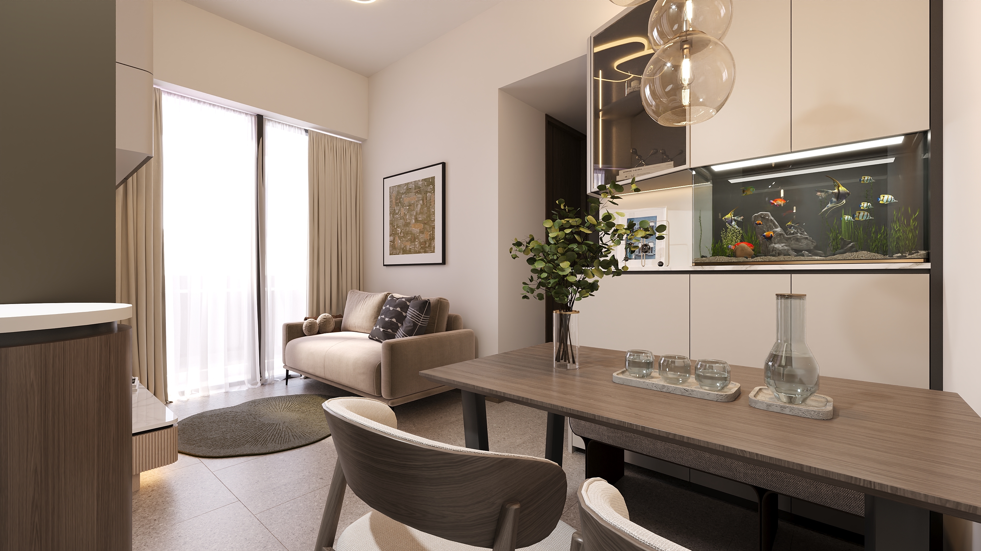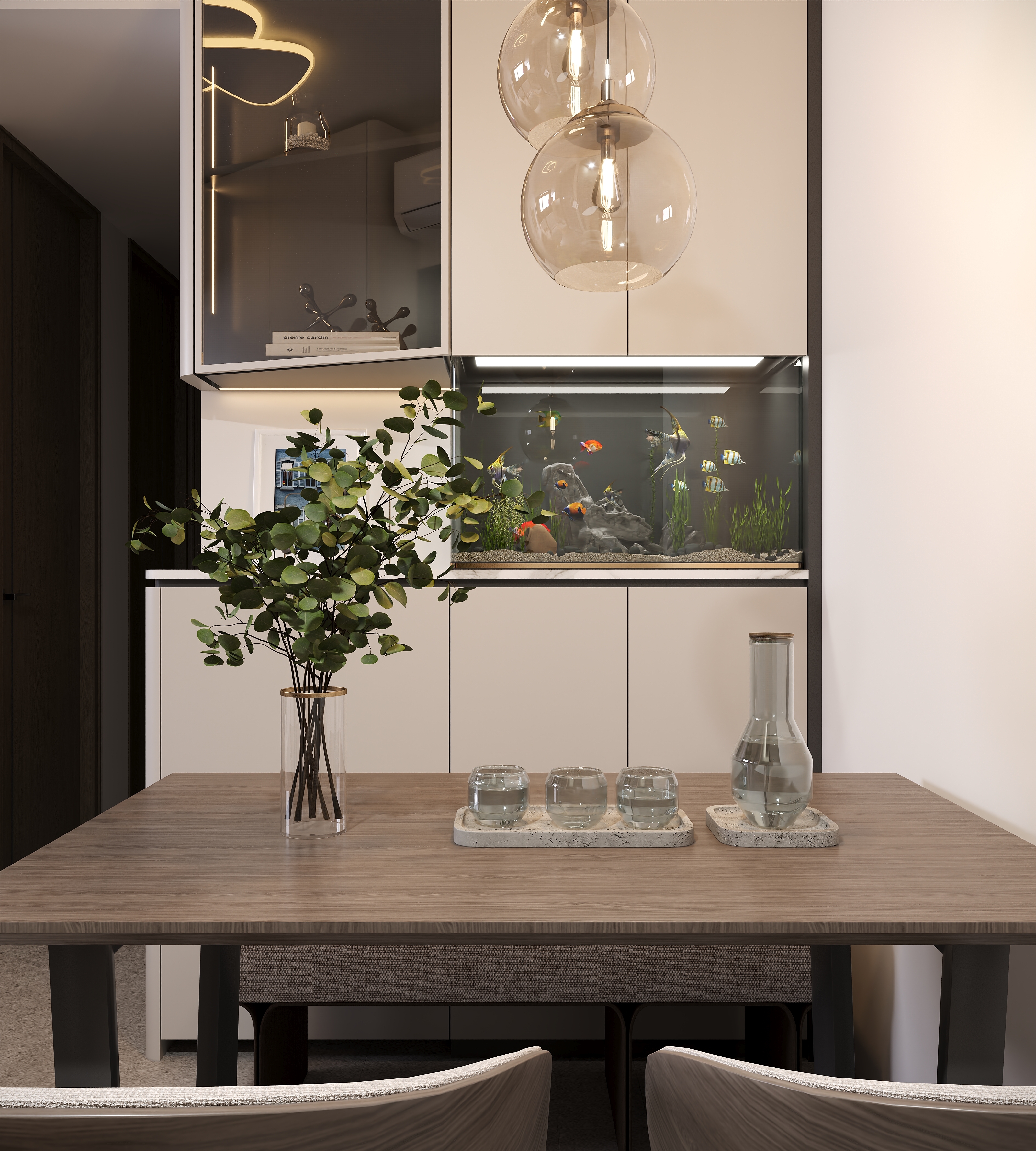 To accommodate the homeowner's hobby of keeping a pet turtle, we reserved a dedicated space for an aquarium within the living room cabinetry. The TV console design features floor-to-ceiling overhead cabinets paired with a floating low cabinet, significantly increasing storage capacity while using the open midsection to reduce visual weight. The design of the glass display cabinet cleverly echoes the glass door elements of the kitchen.