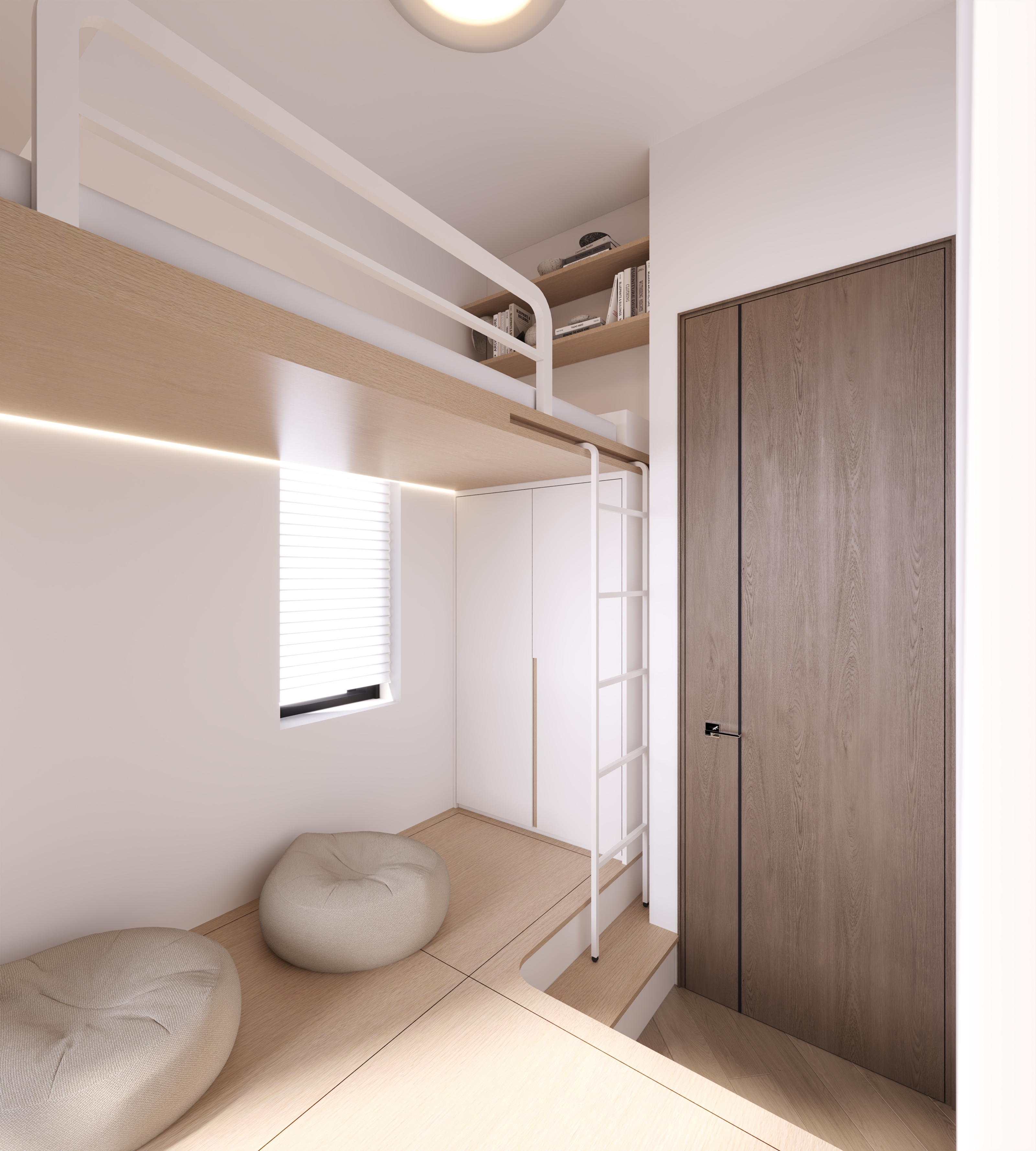 The guest room employs a raised platform design, creating ample hidden storage space. We further utilised an existing wall alcove, custom-fitting a built-in wardrobe combined with a bookshelf, transforming every inch of space into practical function.