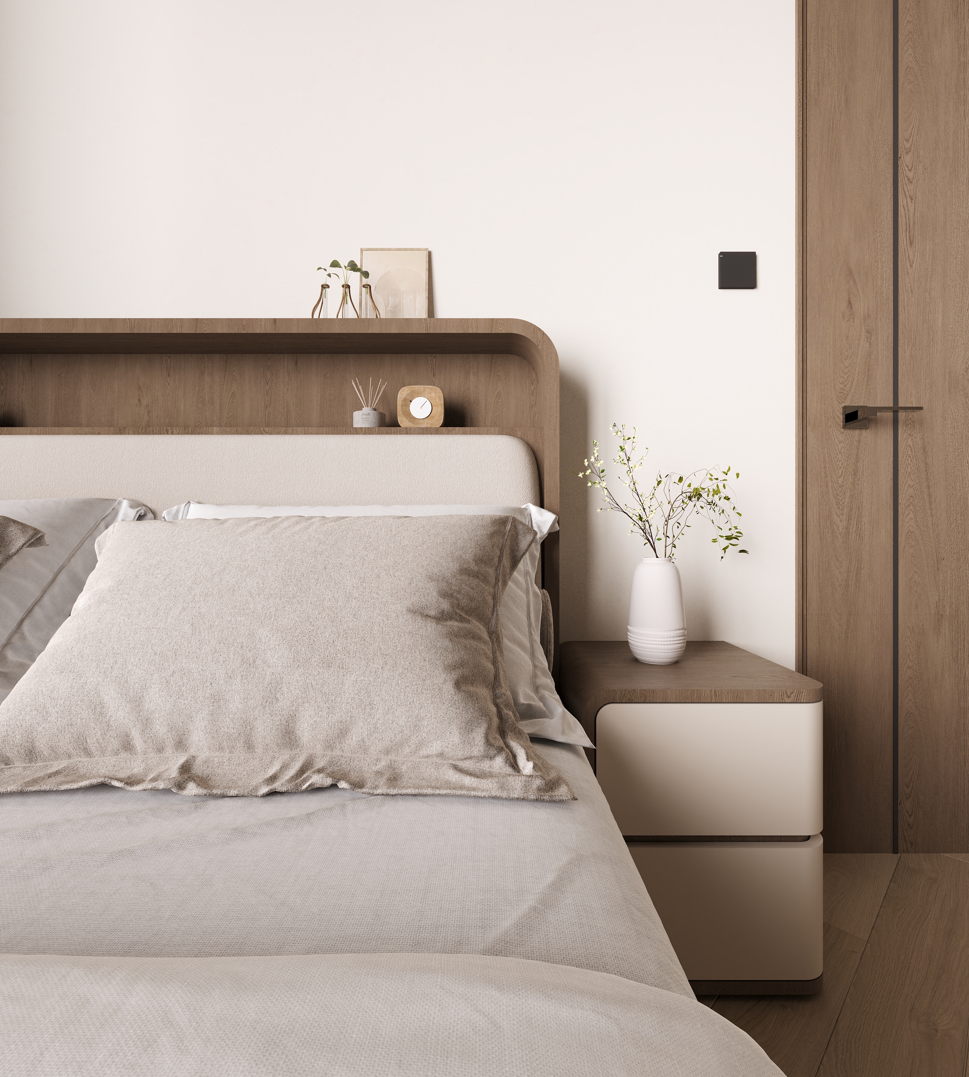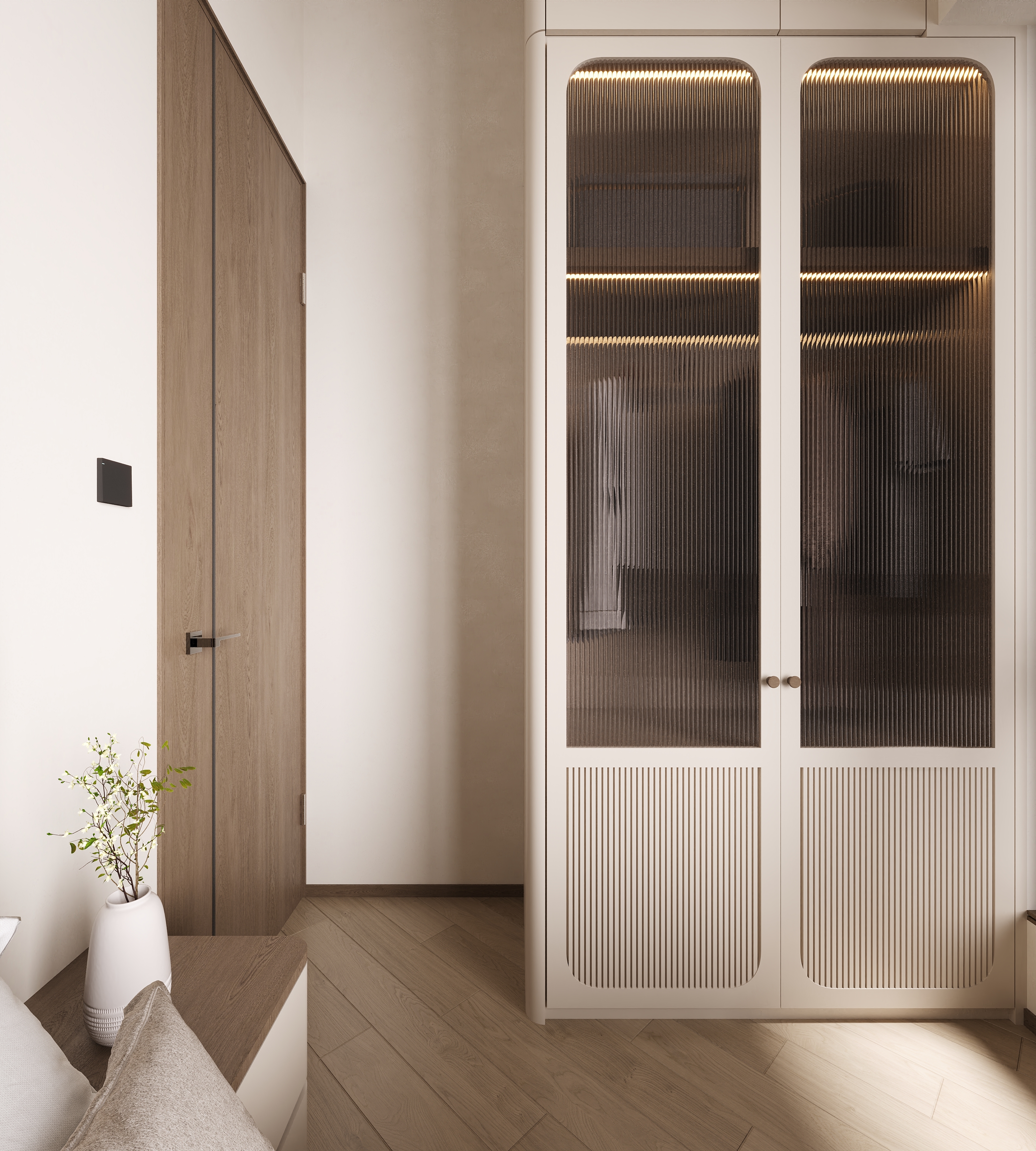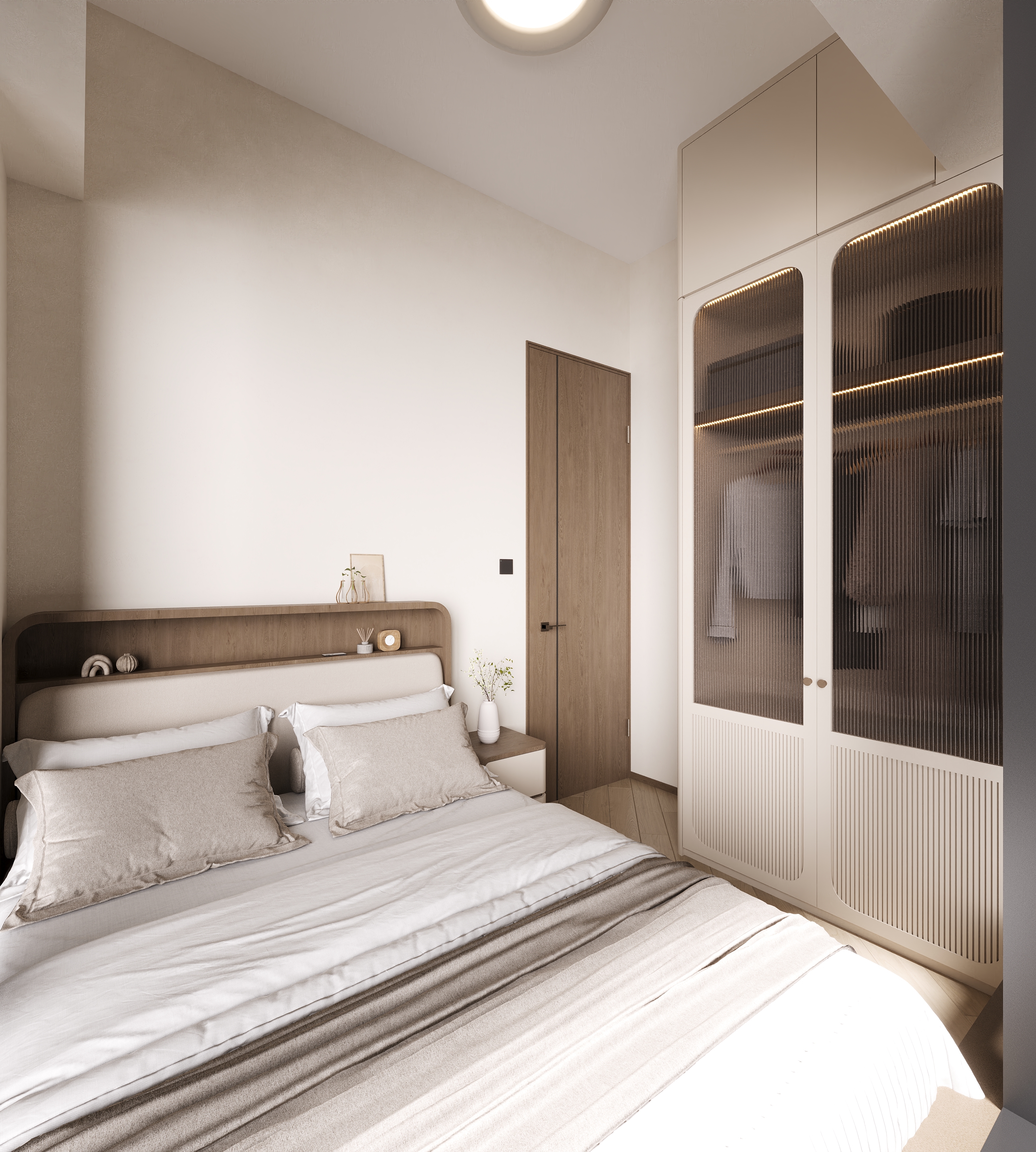 The homeowner particularly favoured the soft, hazy beauty brought by the reeded glass wardrobe doors. Behind the headboard, we intentionally incorporated open shelving with some depth, providing convenient space for bedtime reading material or a phone, showcasing practical care in the details.
