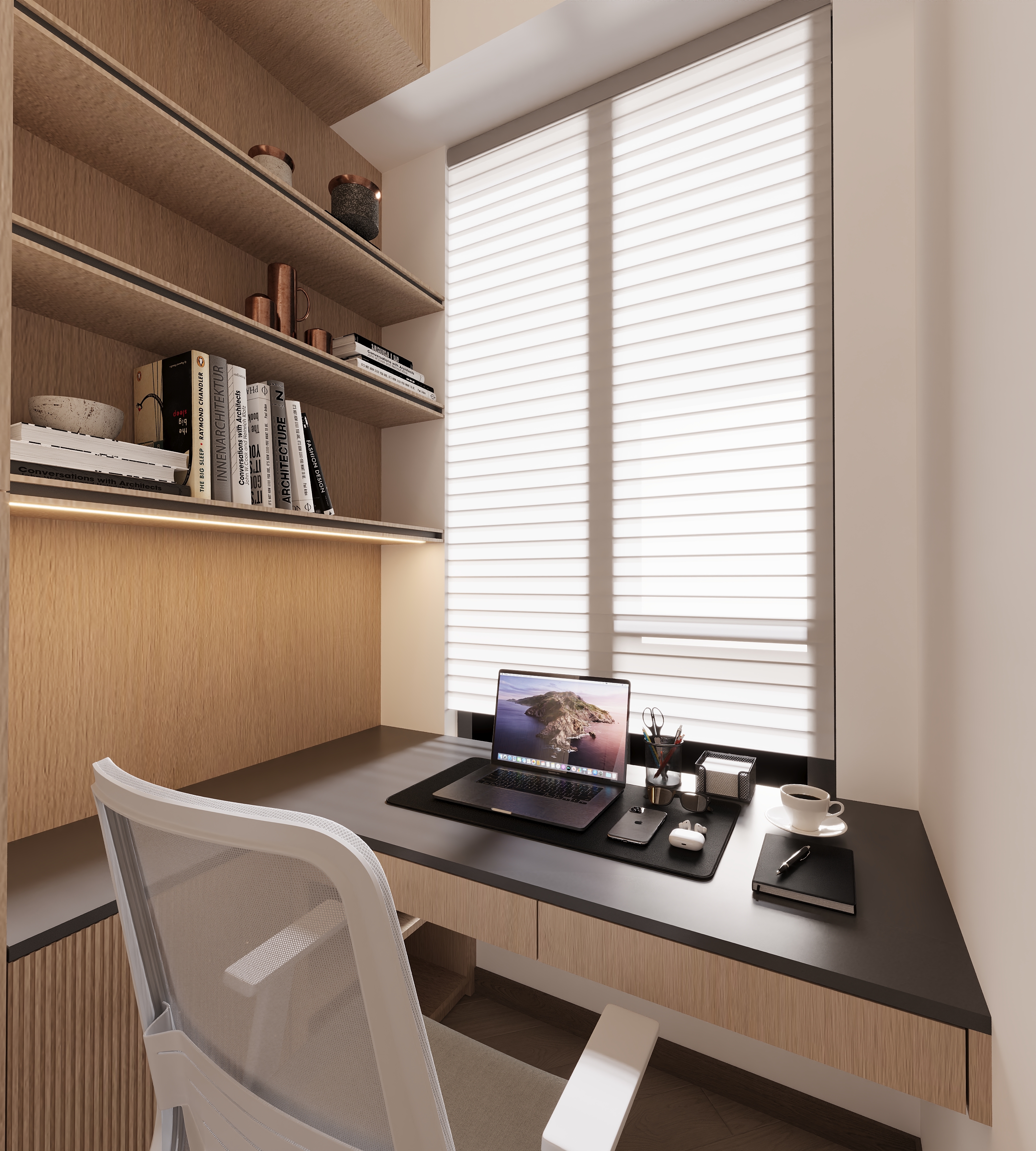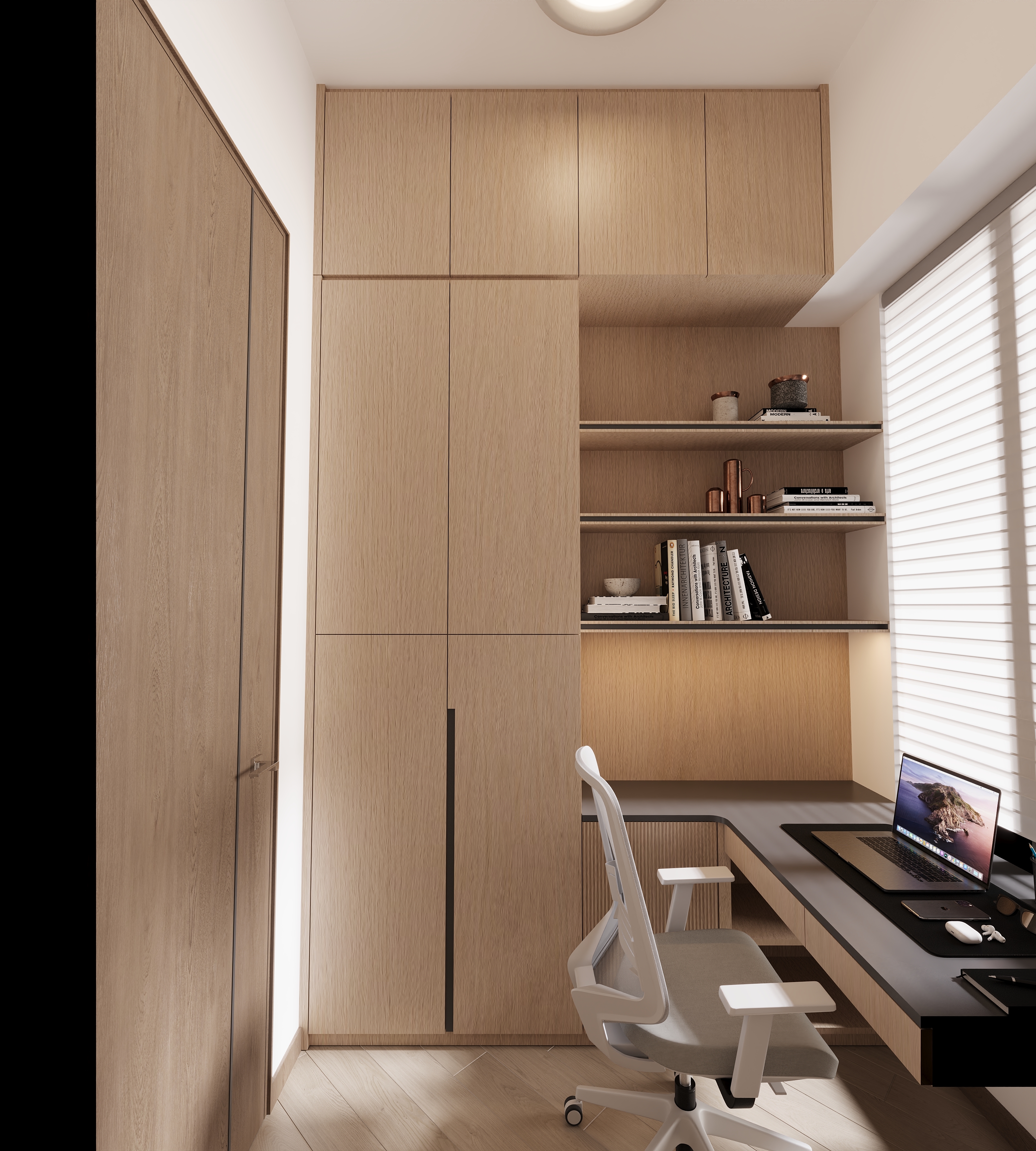 Due to the limited area, we integrated the bookshelf and desk into a unified design, reserving an open space in the middle for a printer. This achieves a fully functional yet compact layout that avoids feeling cramped.