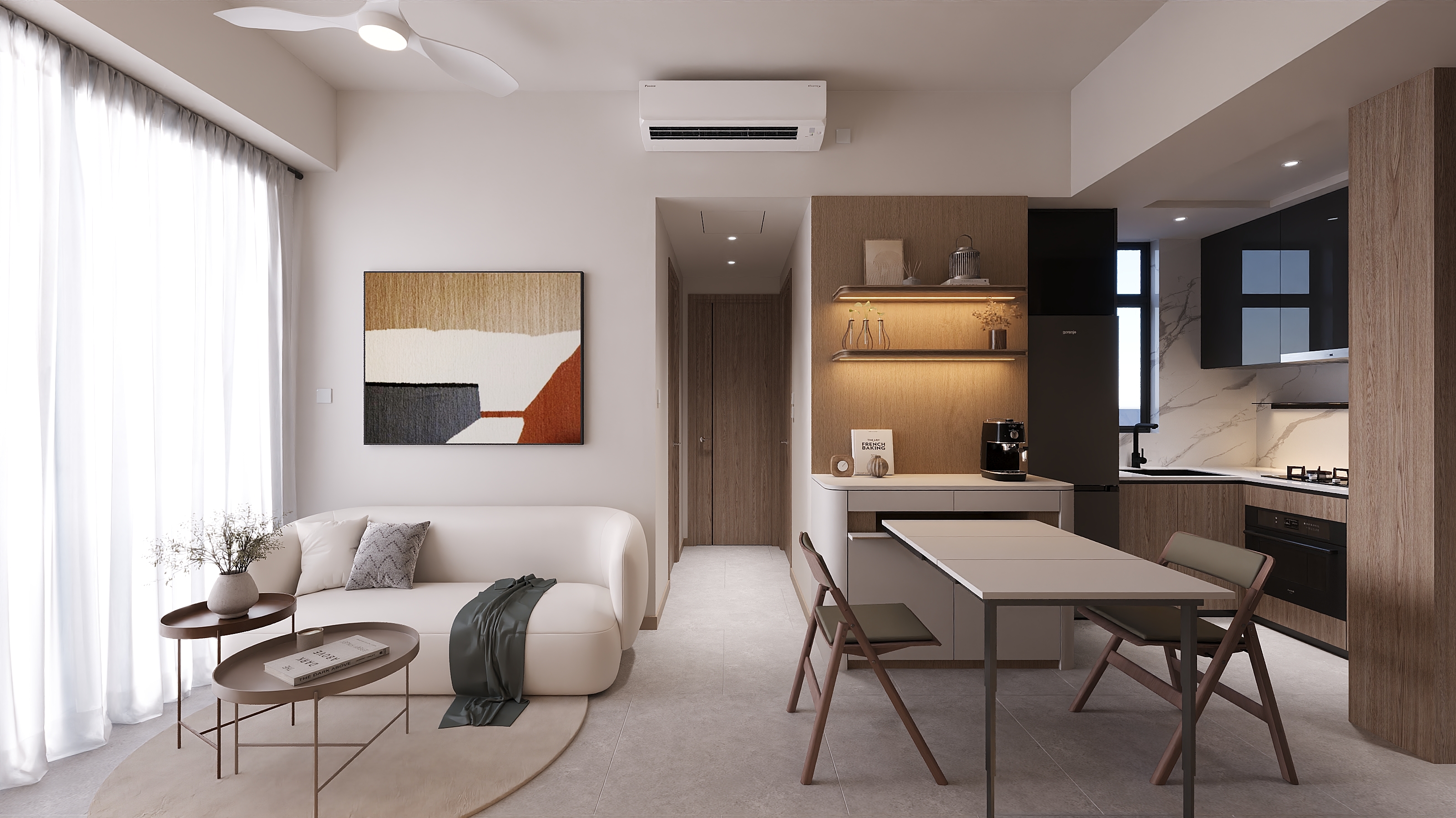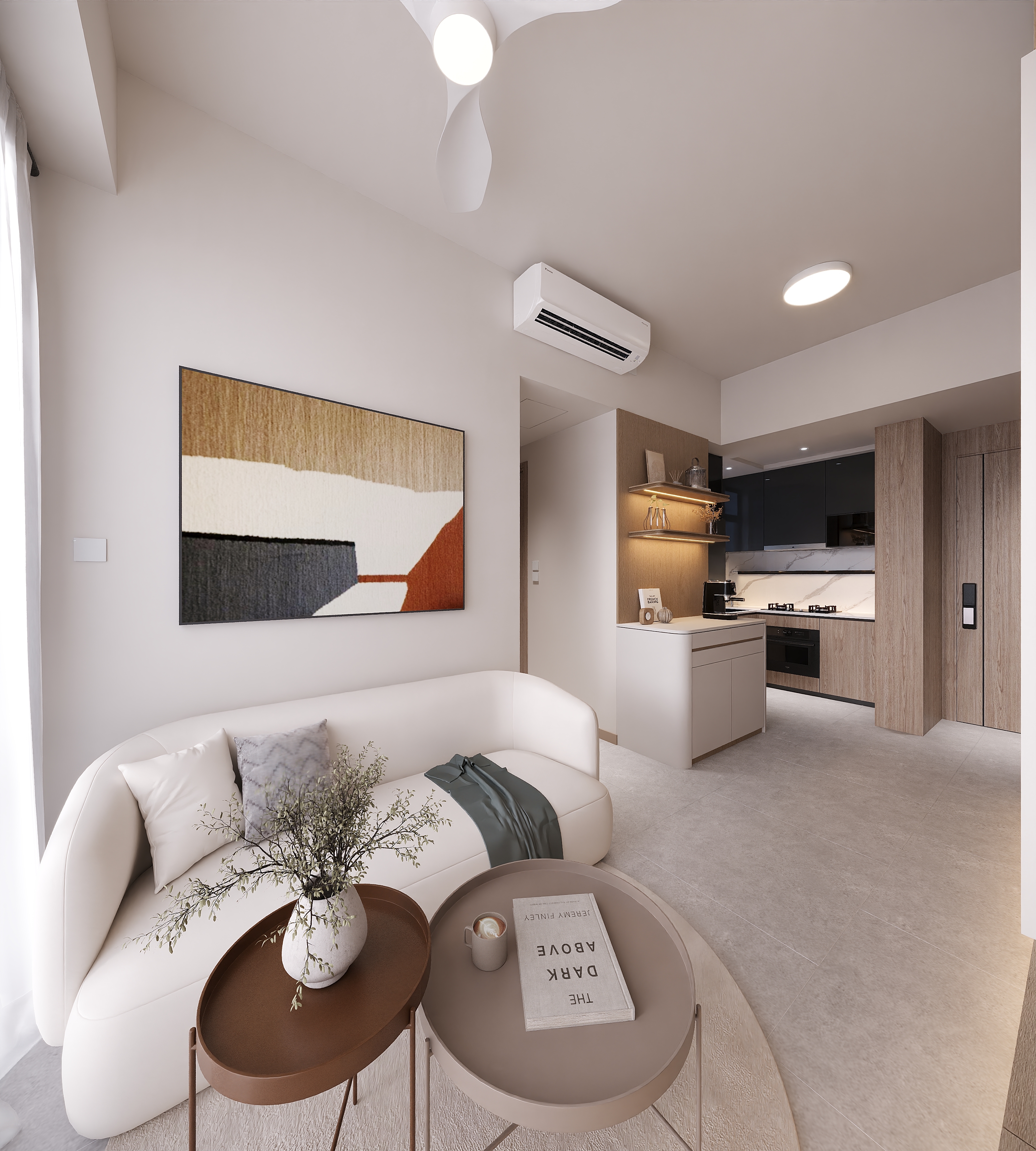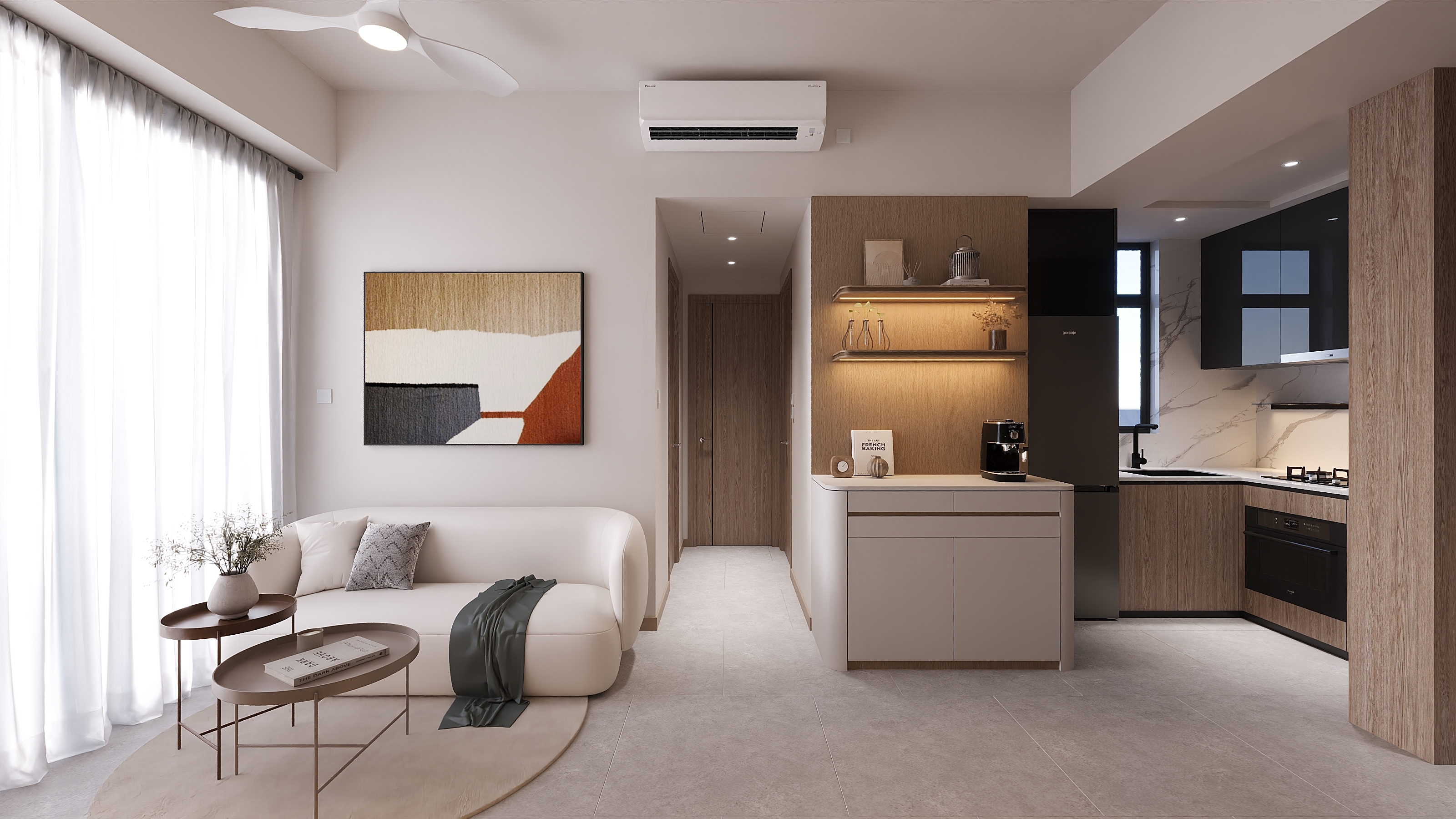 This 339 sq. ft. two-bedroom unit at Sierra Sea belongs to a homeowner who loves the softness of creamy tones and the natural warmth of wood. She wants a clean, simple space — but without compromising on practicality. She knows her daily habits well, and every detail is designed to make life at home smoother.