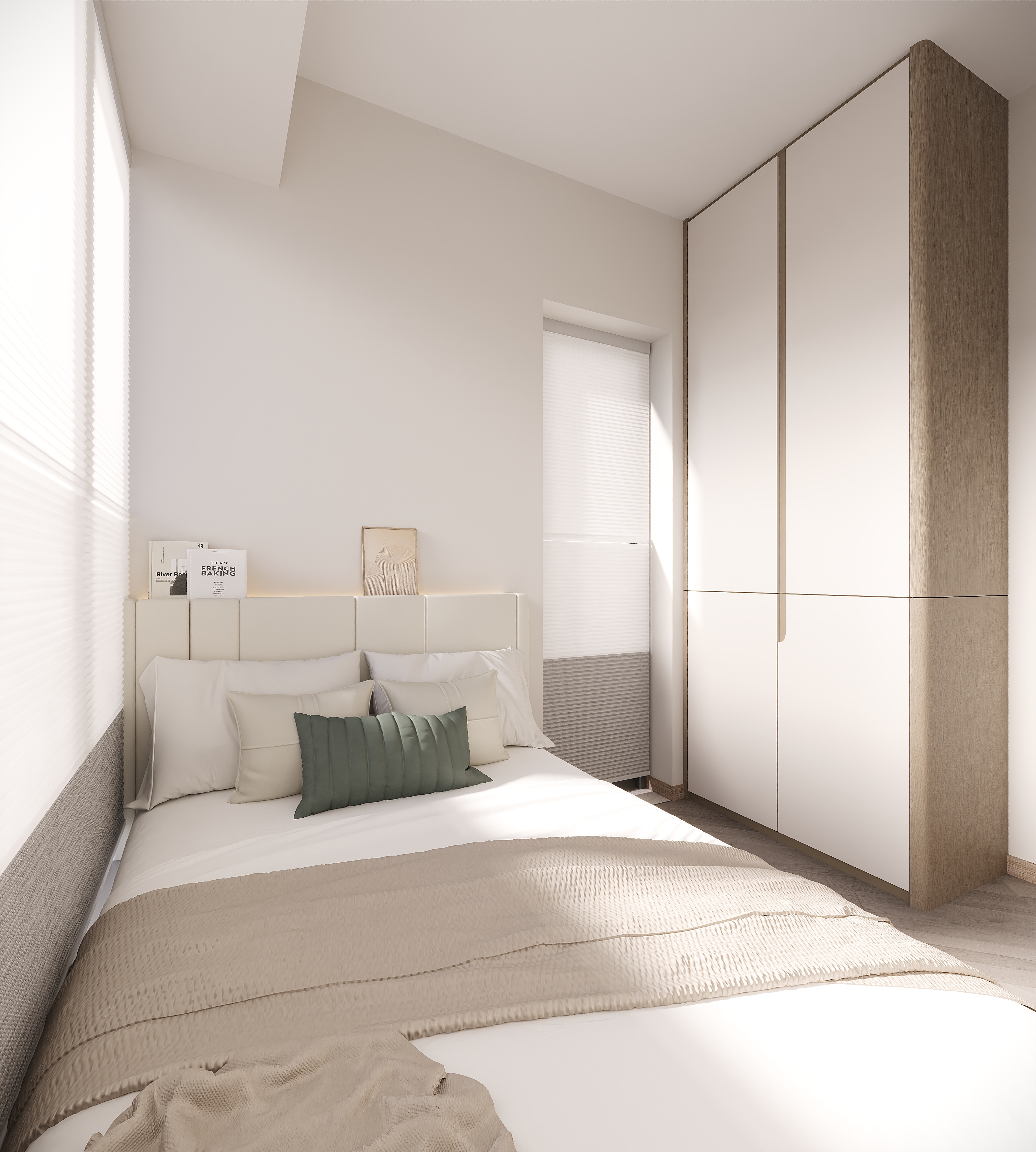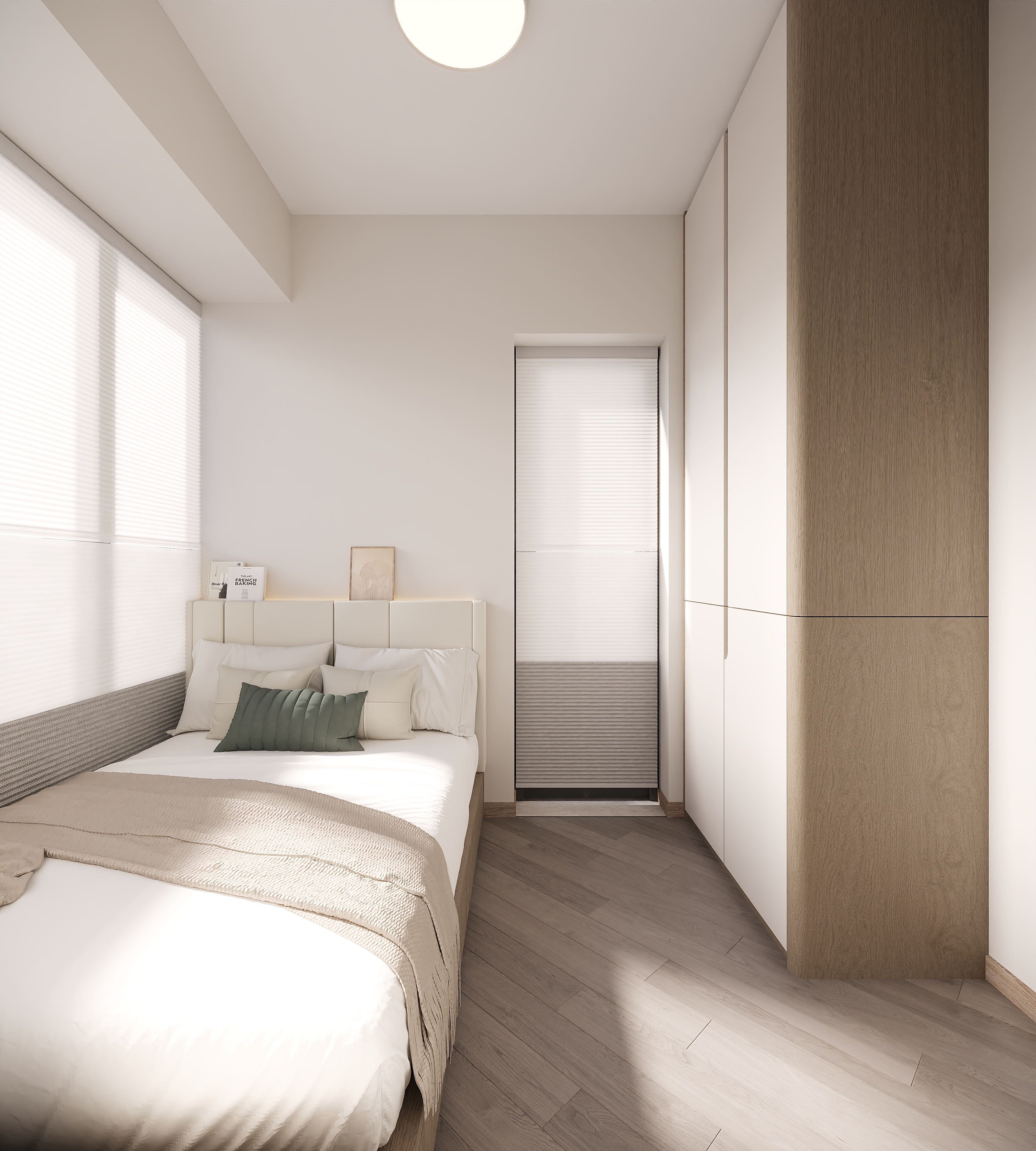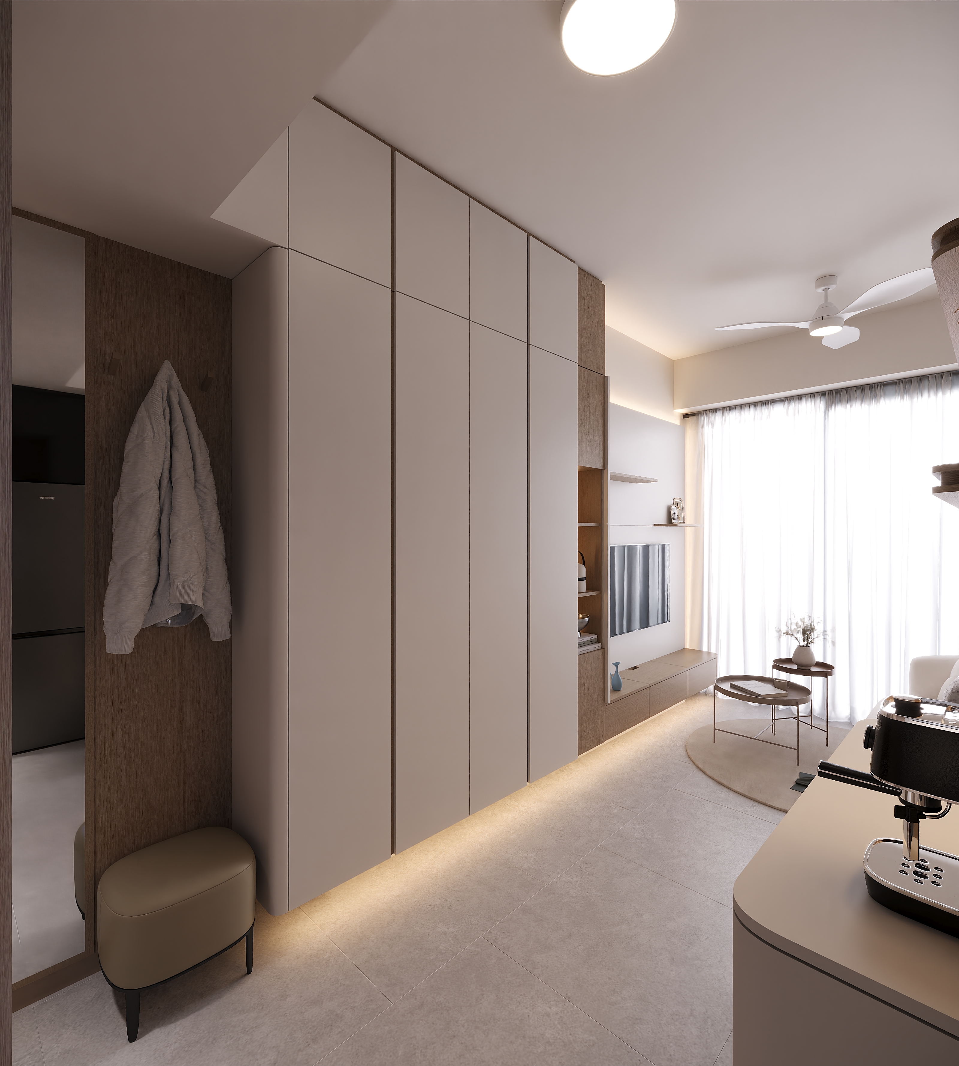 We extended all cabinets to the ceiling, increasing storage while keeping the visual flow consistent. Curved corners soften the space, and the precious window view is preserved — no cabinet blocks the natural scenery.