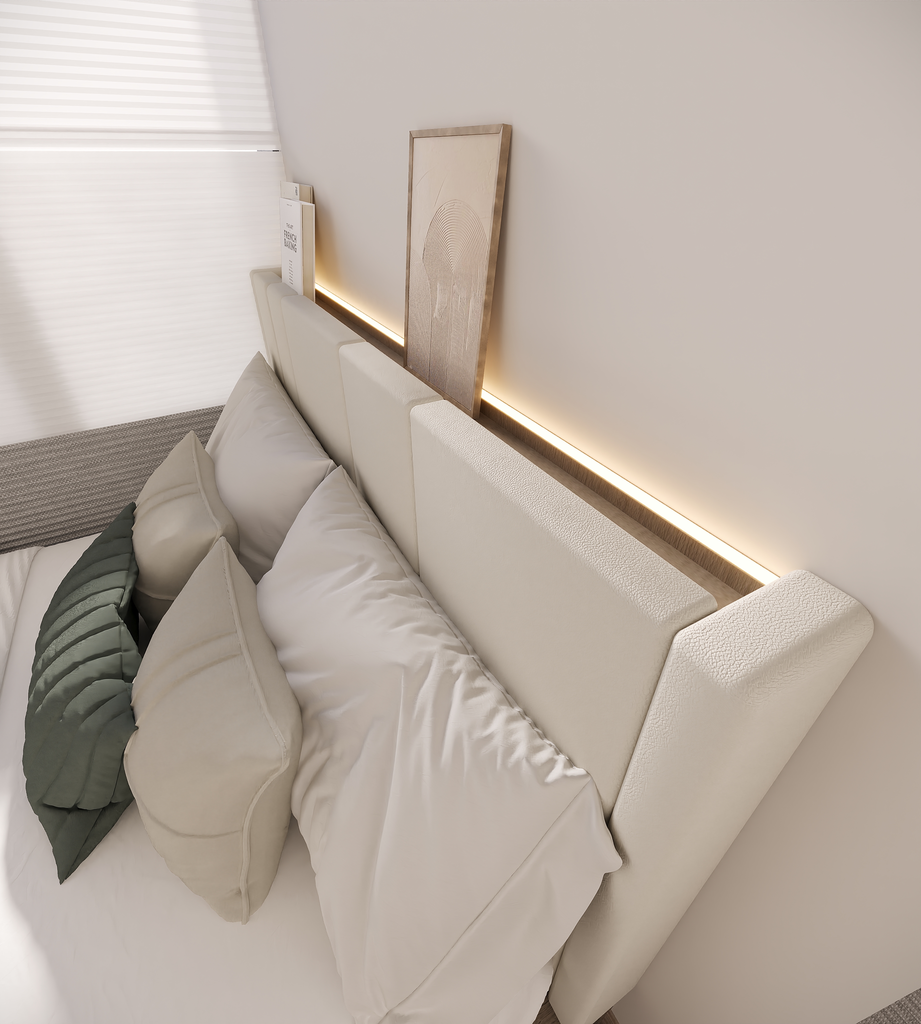 The bedside features soft padding with a small recess — perfect for placing glasses or other small items. A thoughtful detail that makes daily life a little easier.
