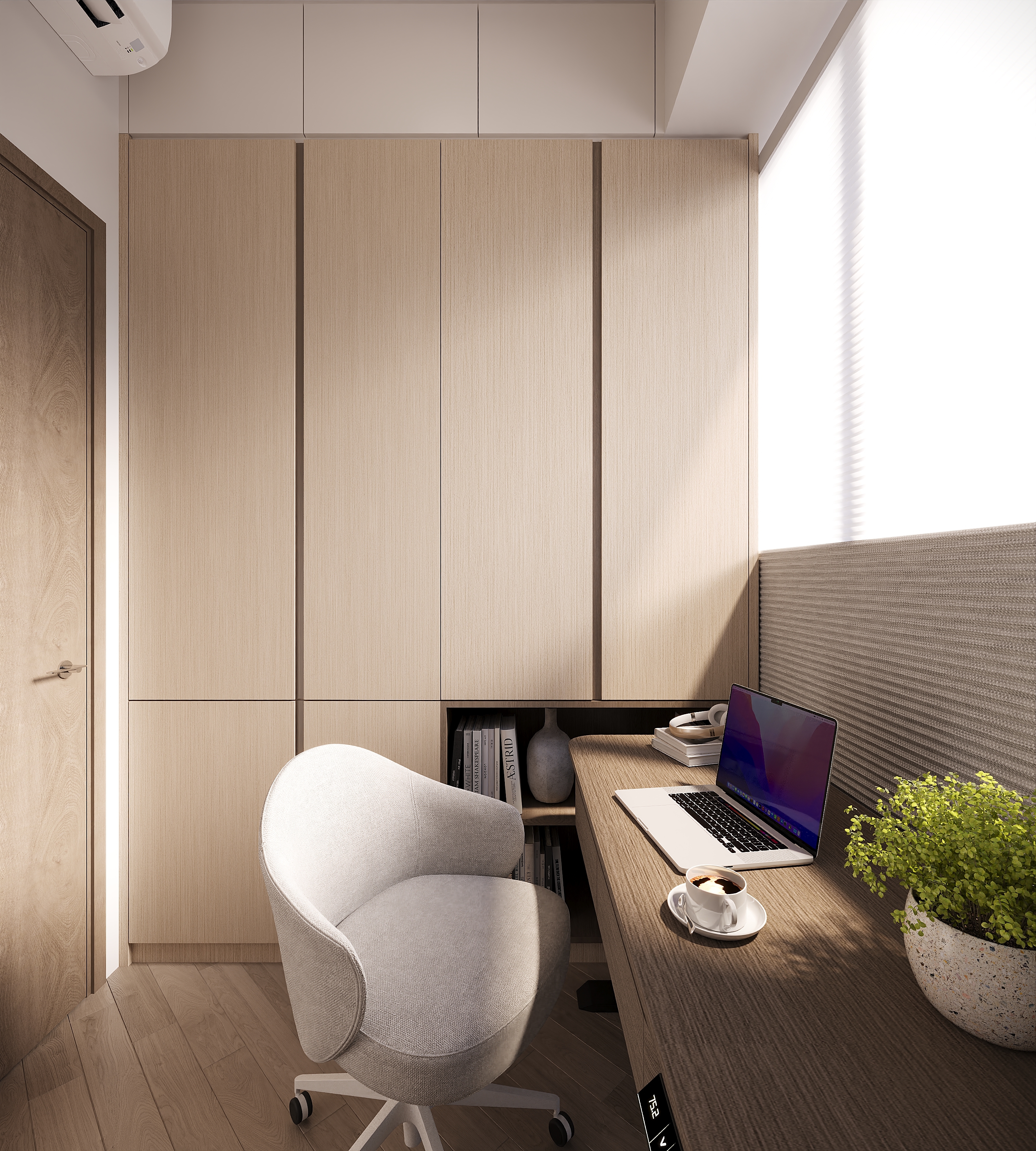 A spot is reserved for a vanity table. It won’t block access to the balcony. You can move it out when needed and put it back afterward, keeping the space open and easy to move around.