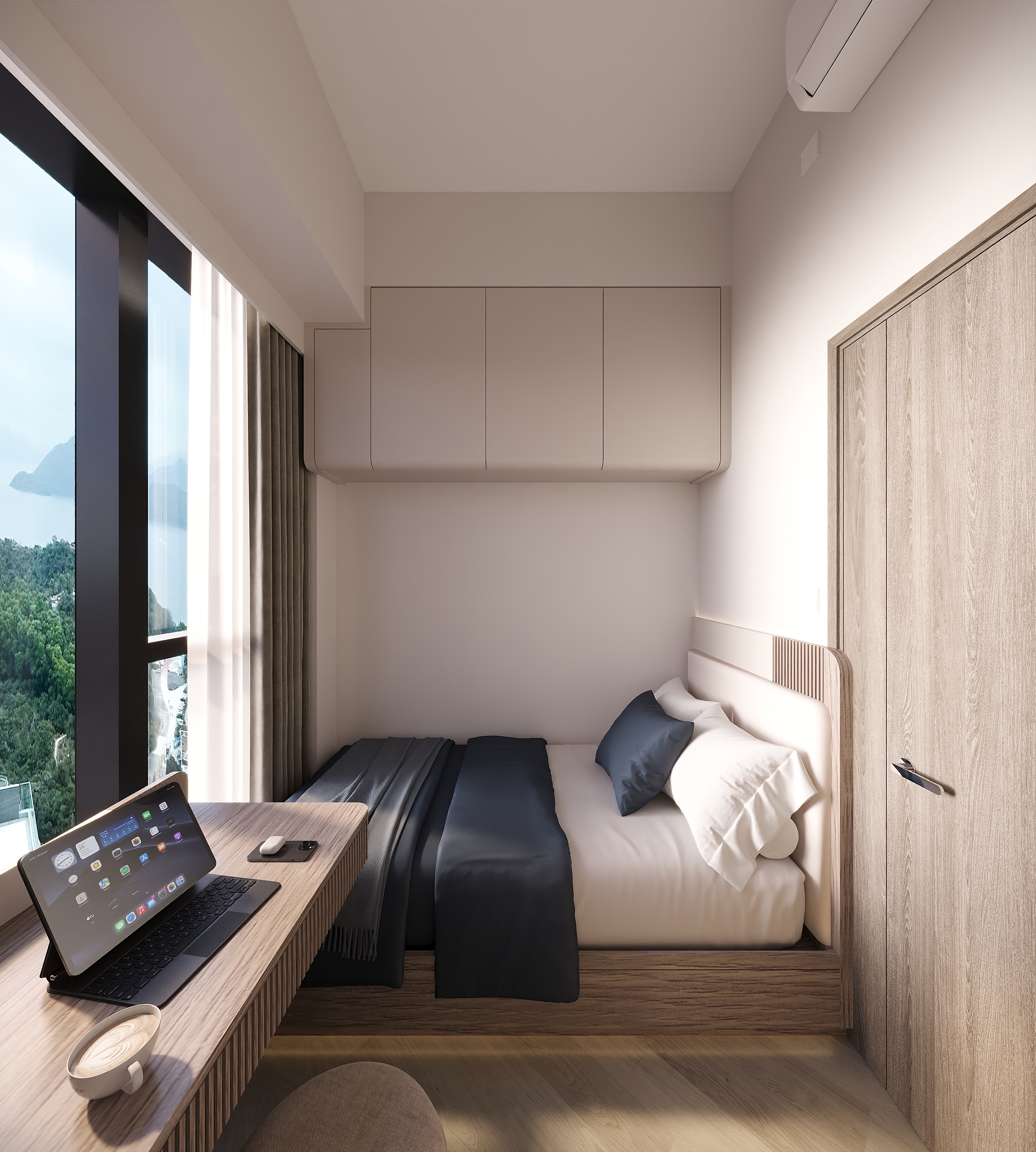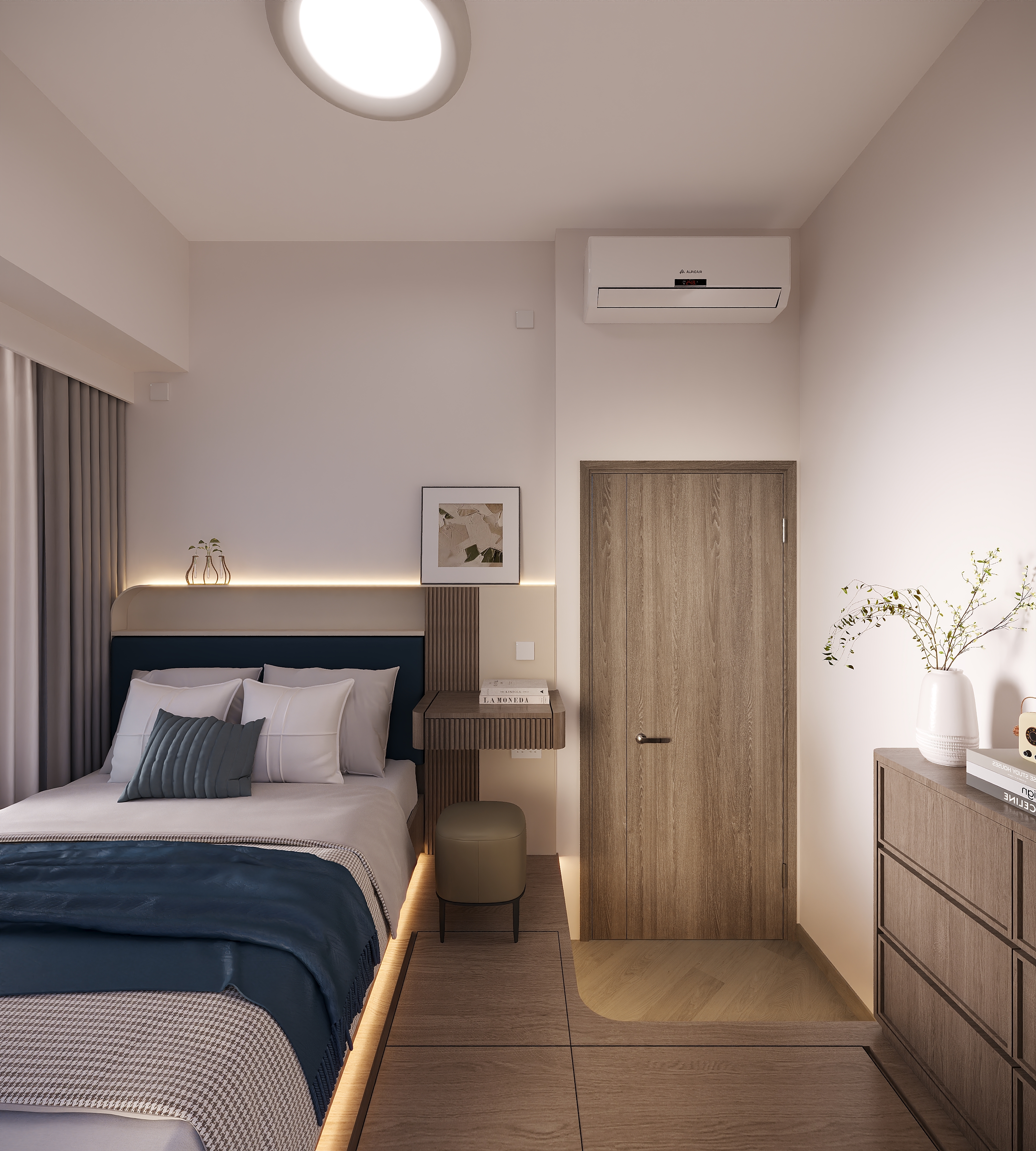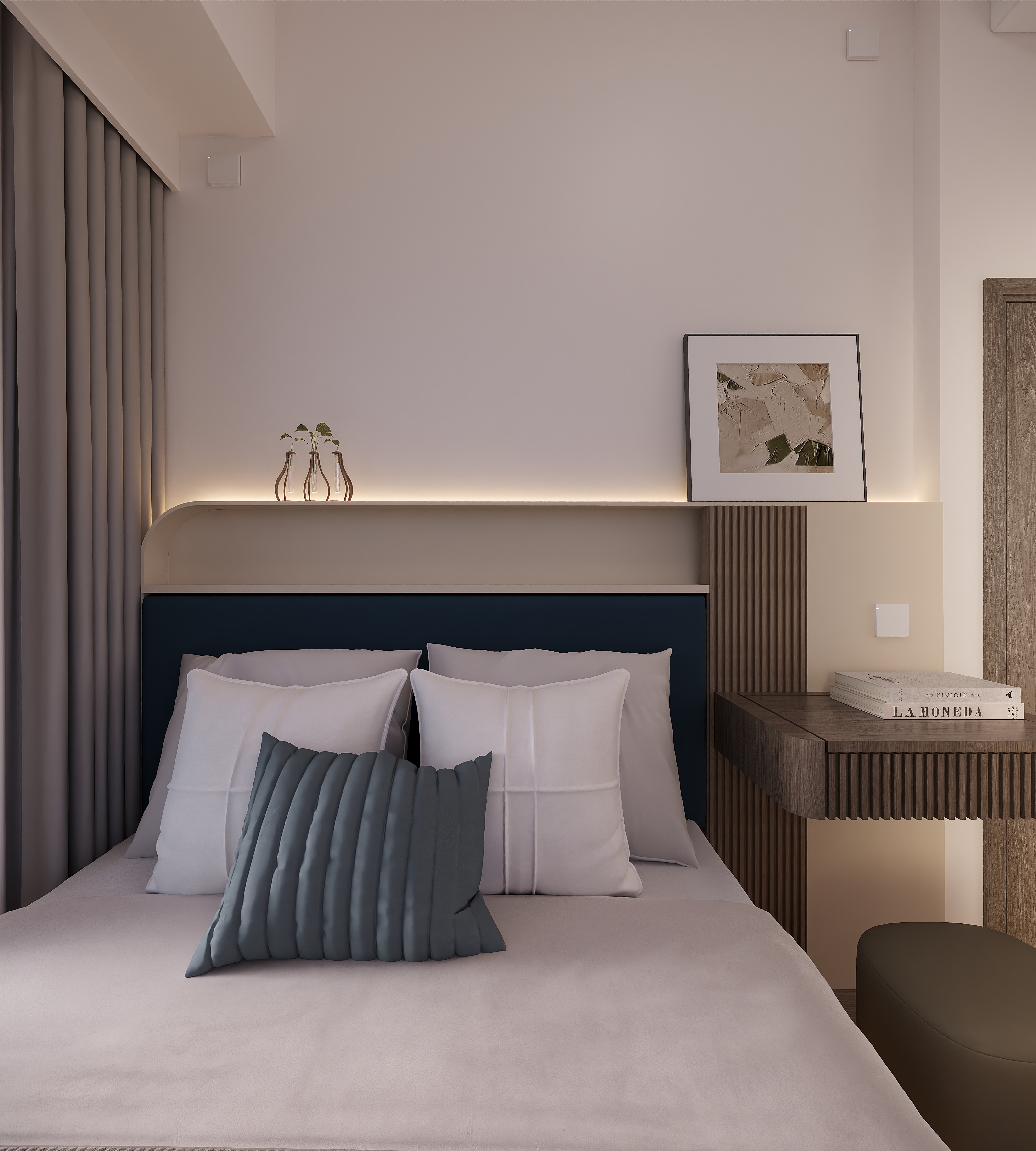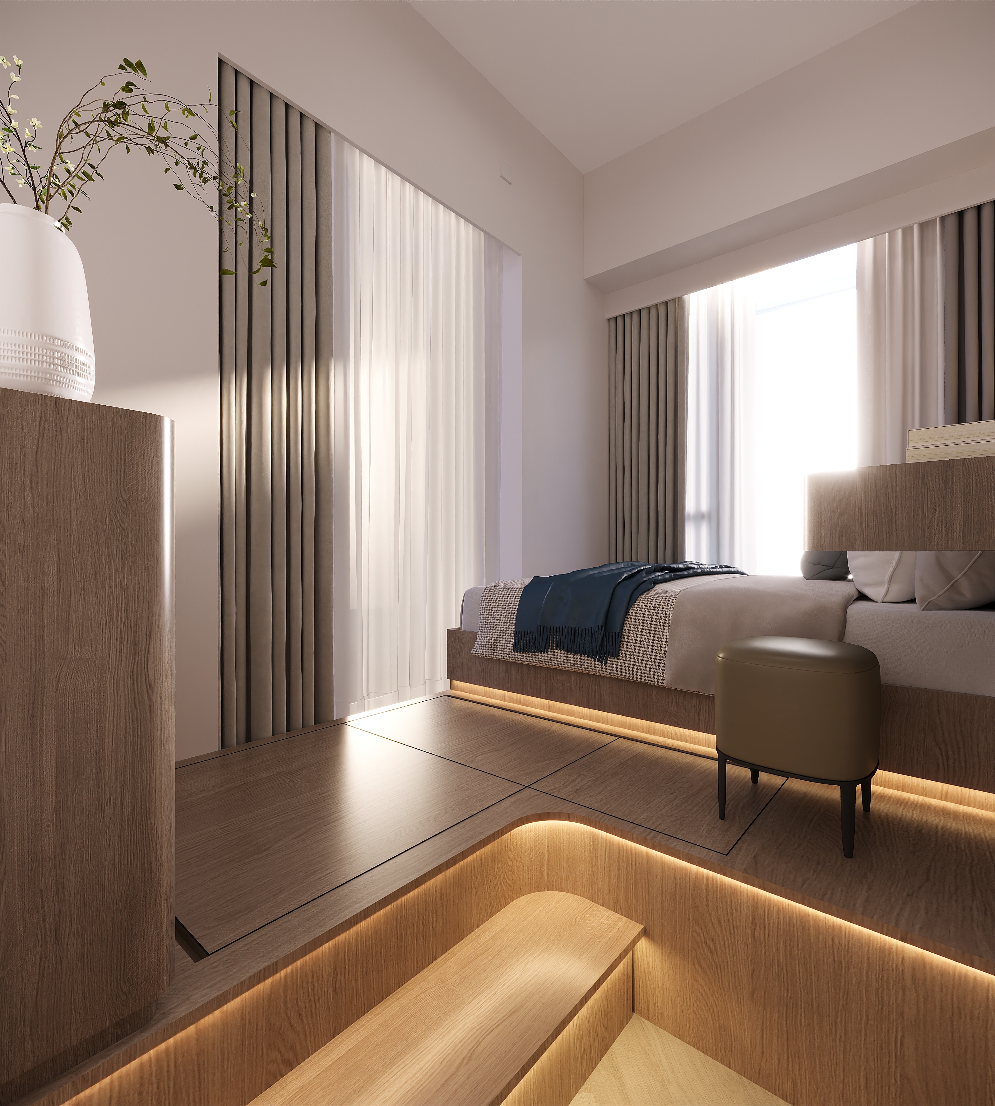 🔸 Master Bedroom – A platform bed maximizes storage, effortlessly accommodating seasonal bedding and suitcases. The headboard is accentuated with clean lines, complemented by hidden LED strips to create a soft, relaxing sleep environment. (Note: This sentence was repeated in the original text.)