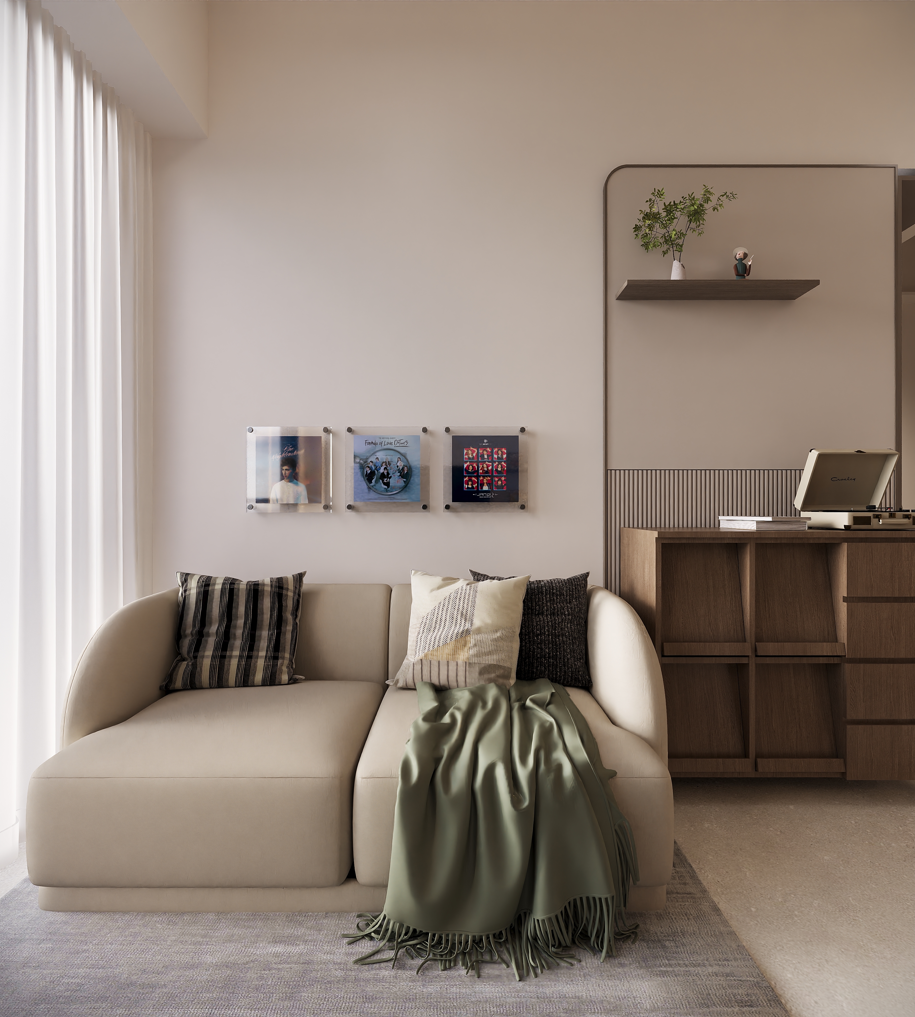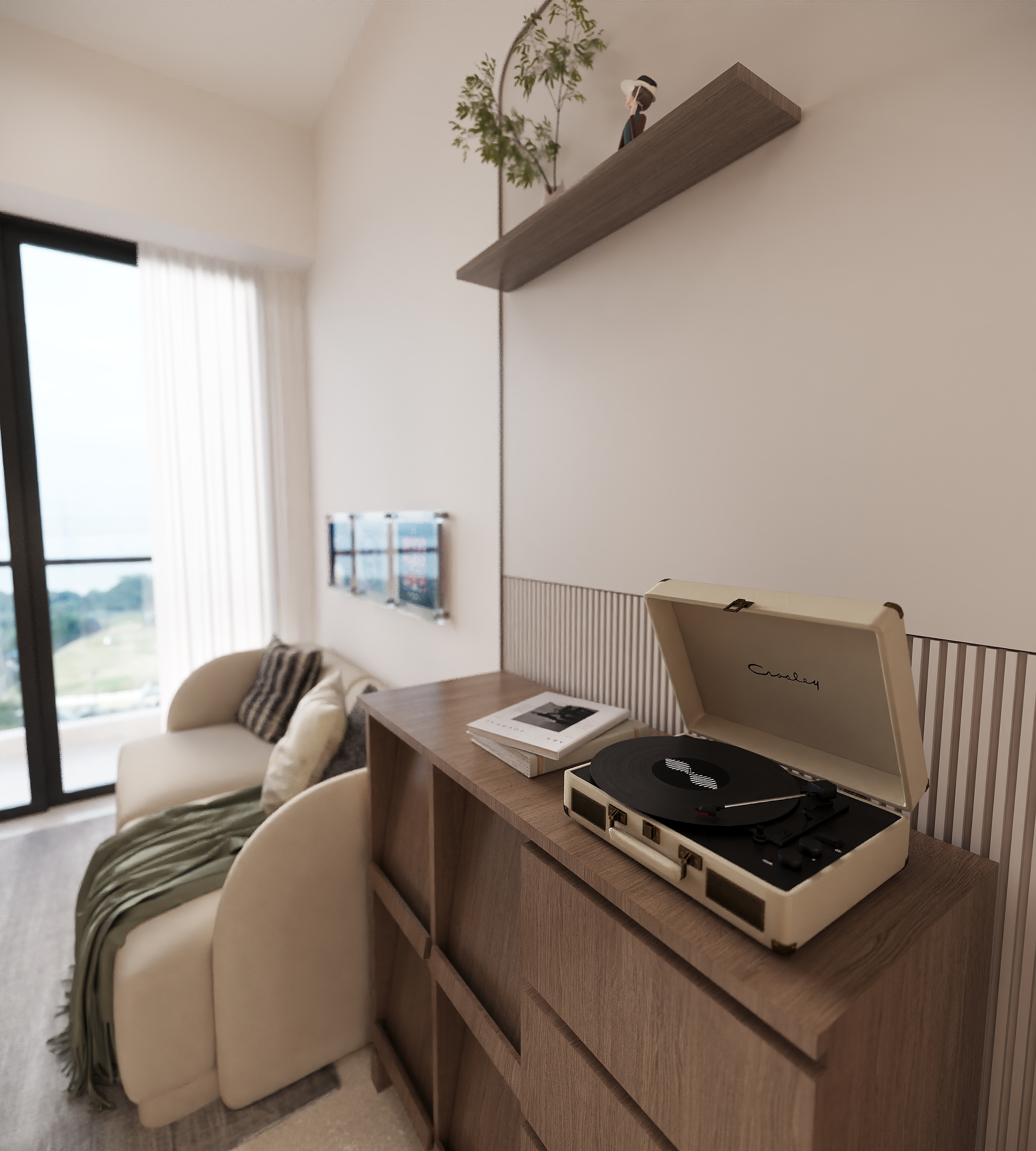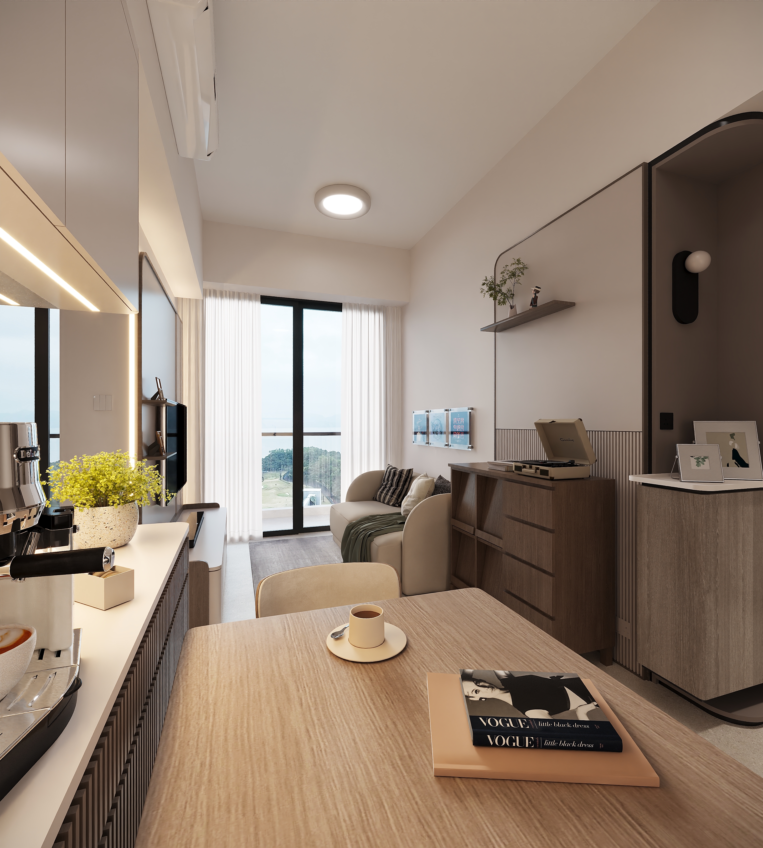 The entire home is grounded in natural wood tones and off-white, embracing a Japanese minimalist aesthetic. This time, we’ve added grey mirror accents and dark details to create a more stylish atmosphere that resonates with the fast-paced lifestyle of the younger generation.