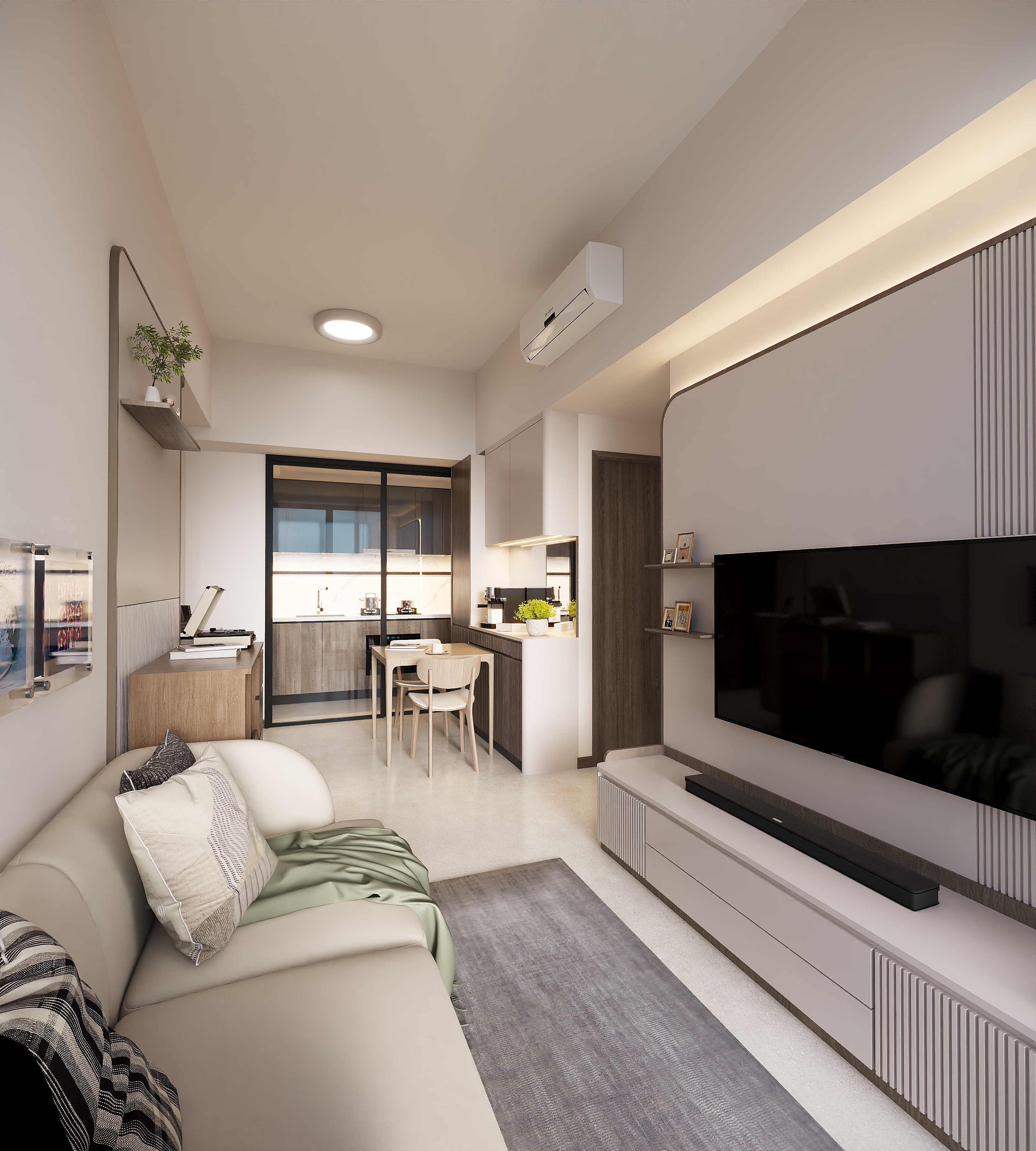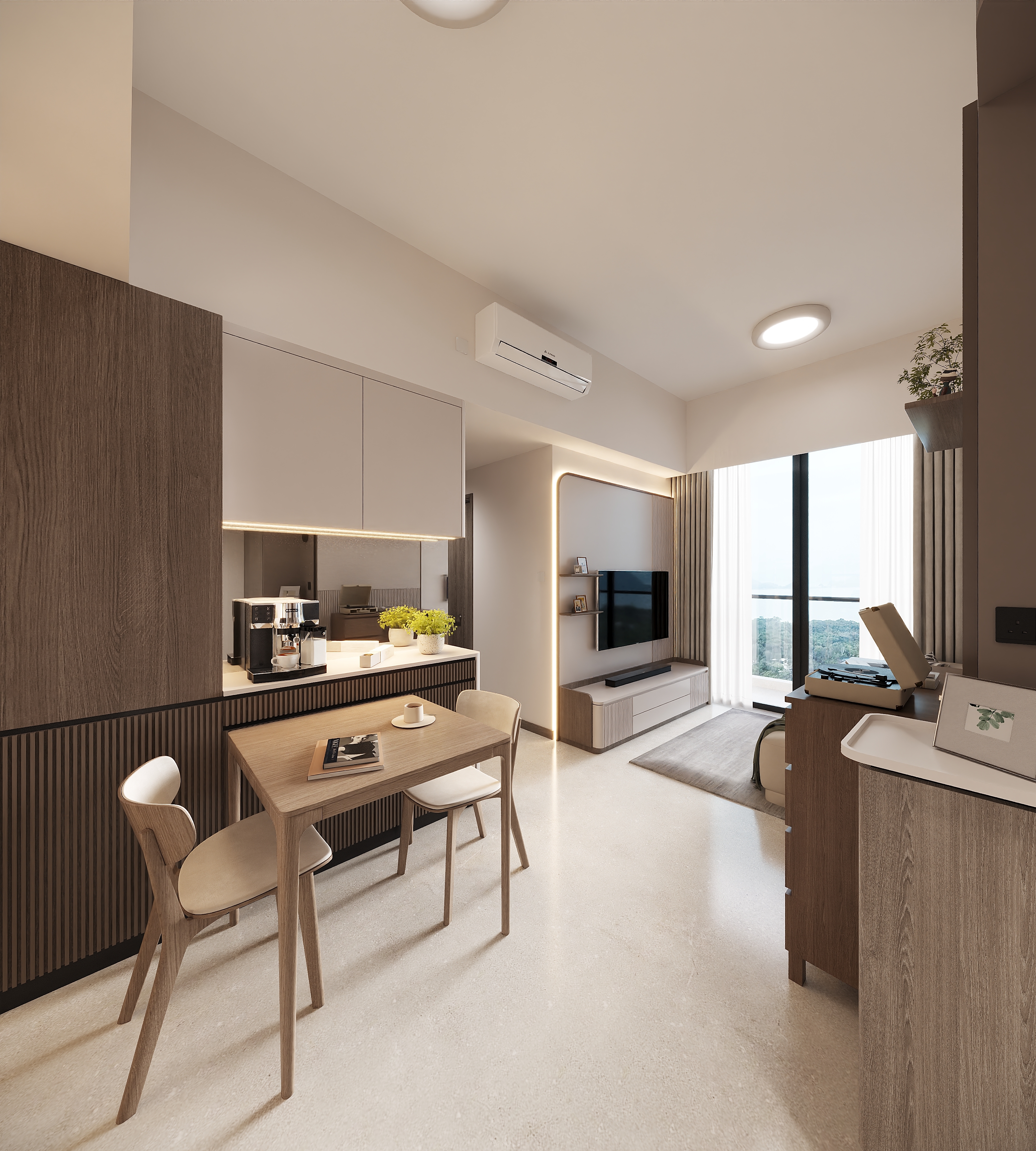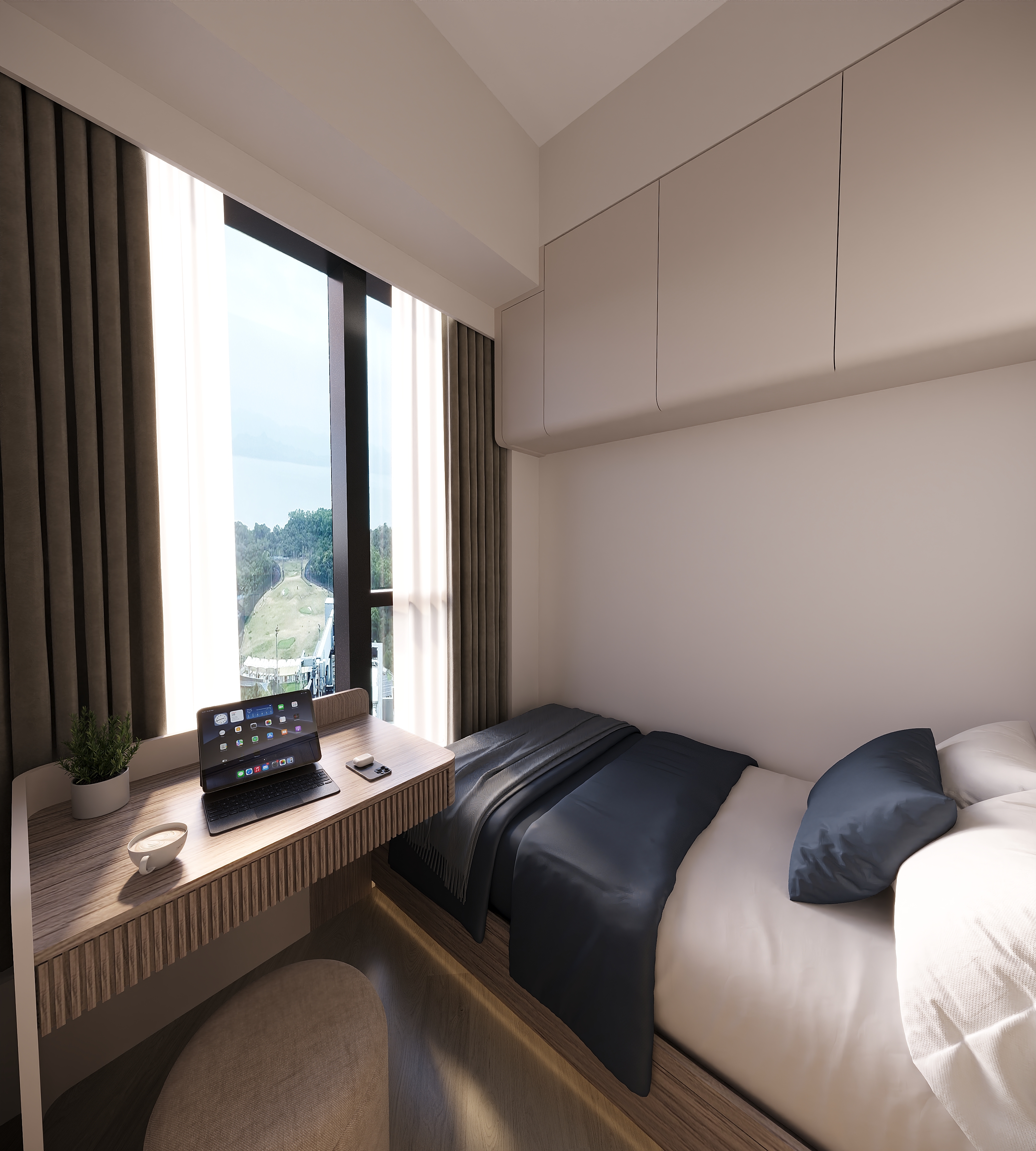 The entire home is grounded in natural wood tones and off-white, embracing a Japanese minimalist aesthetic. This time, we’ve added grey mirror accents and dark details to create a more stylish atmosphere that resonates with the fast-paced lifestyle of the younger generation.