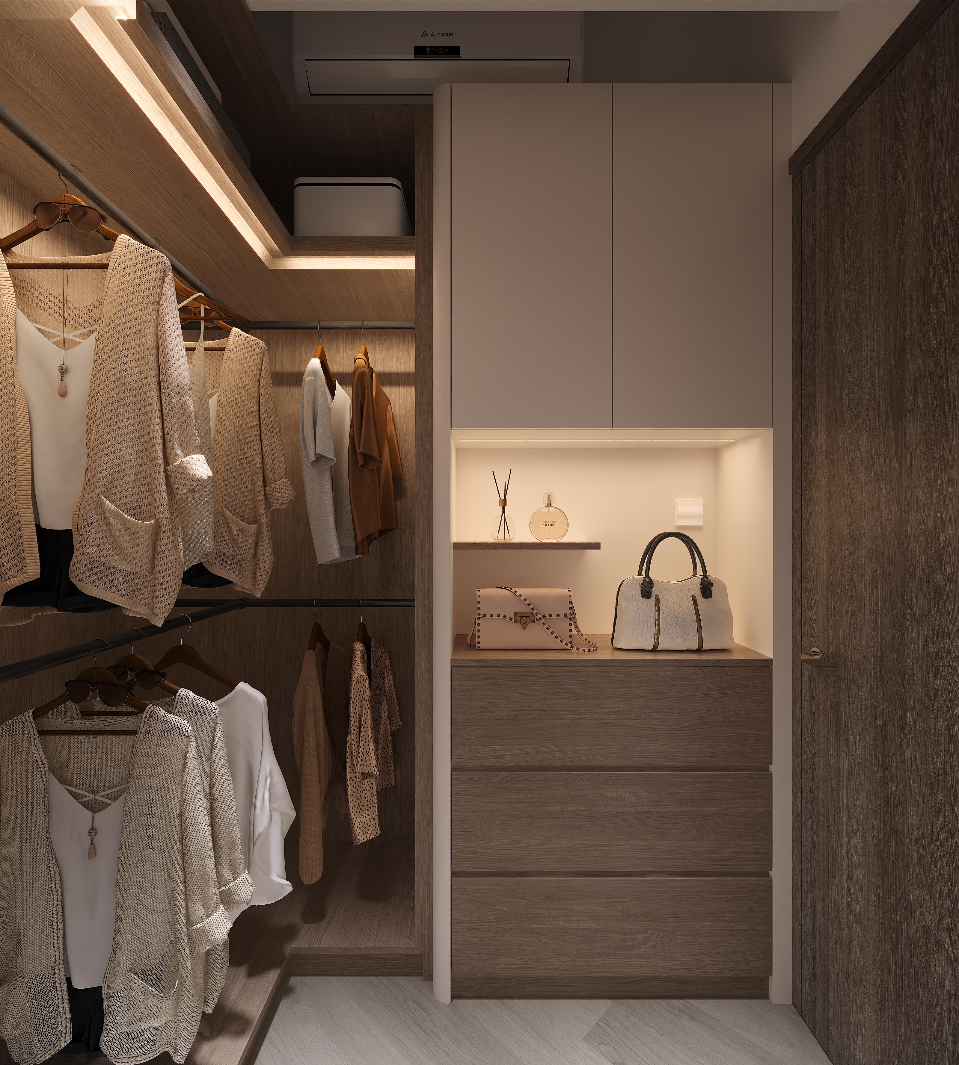 🔸 Open Walk-in Wardrobe – Replacing the traditional storage room, the original utility space has been transformed into a walk-in wardrobe. This centralizes storage, improves traffic flow, and meets the young homeowners’ need for both neatness and display.