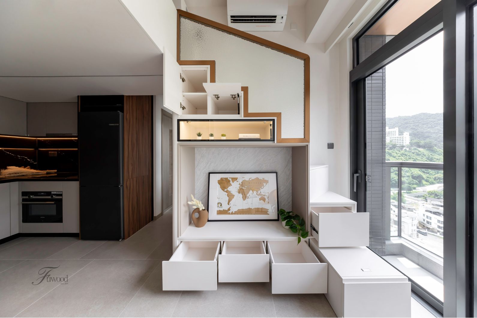 In the layout, the high ceiling is fully utilized to create a dedicated upper-level space for children, integrating play and reading areas. The lower level serves as the family core zone, featuring an open-plan living, dining, and kitchen area. A custom dining table connected to the cabinetry elegantly enhances both storage and activity space.